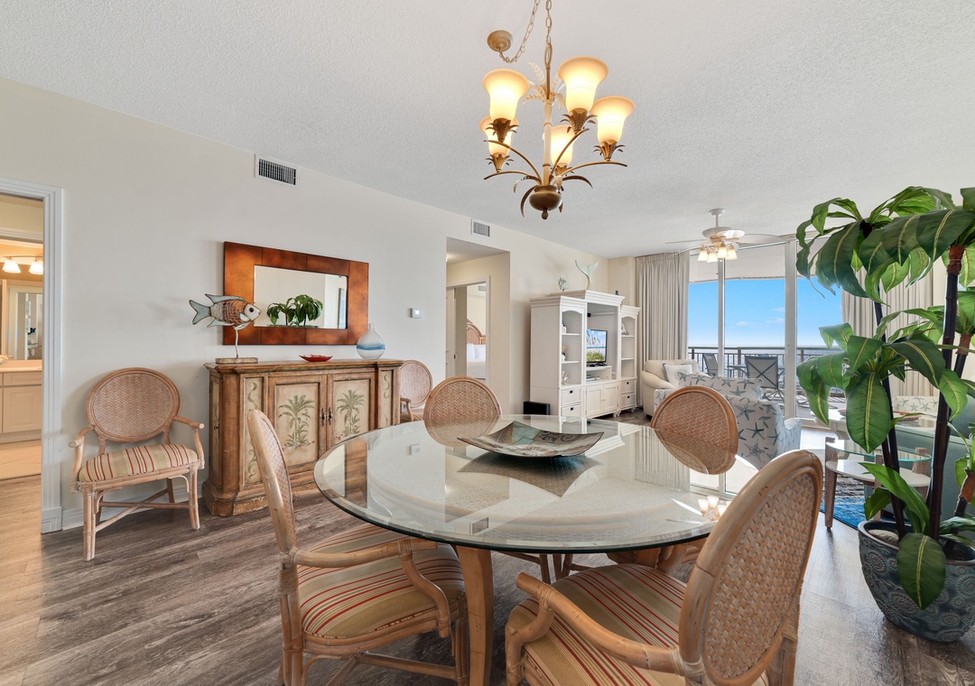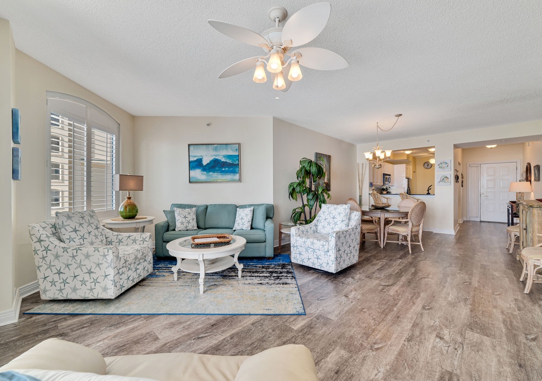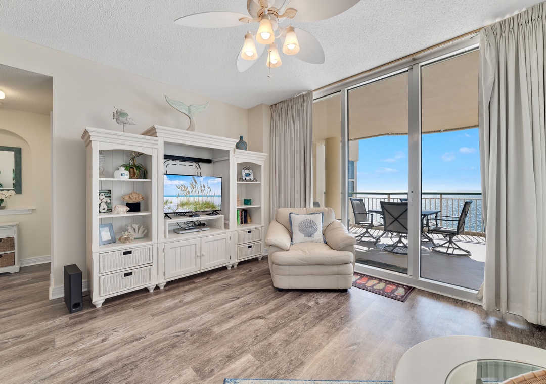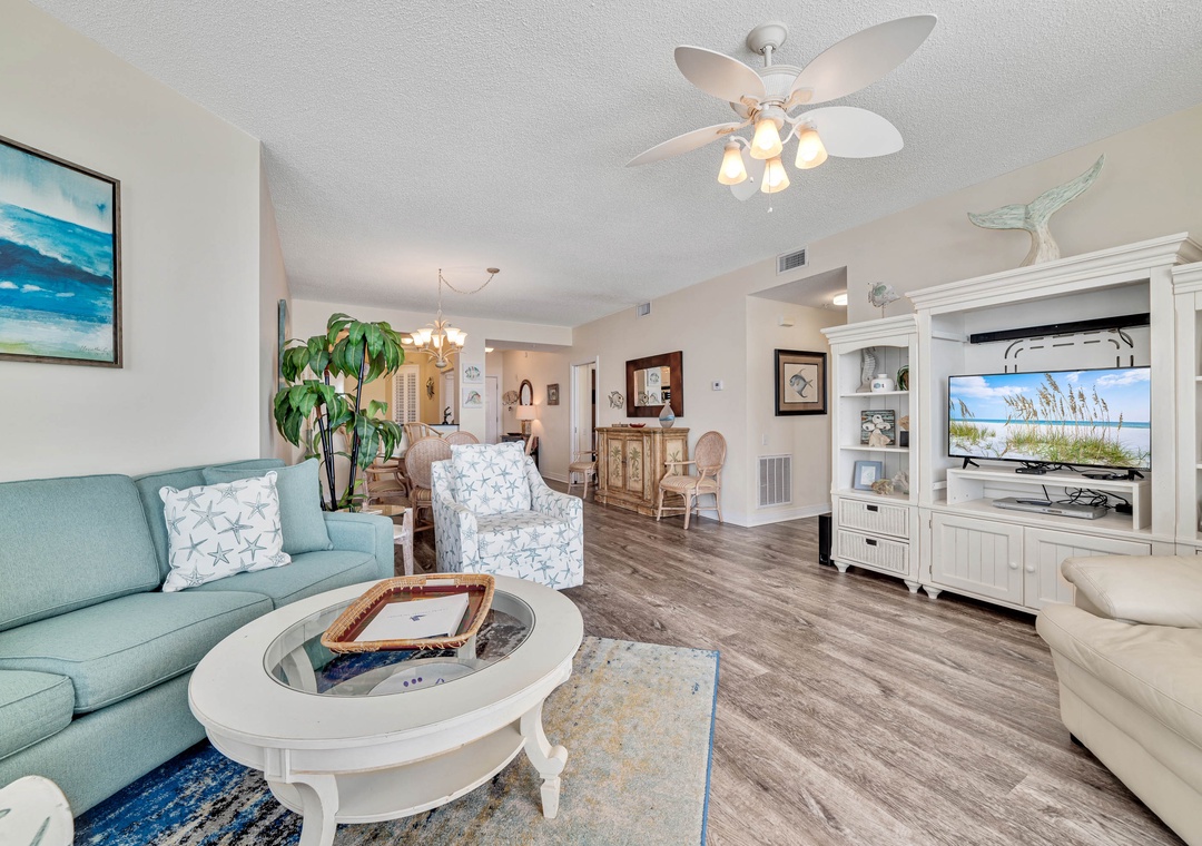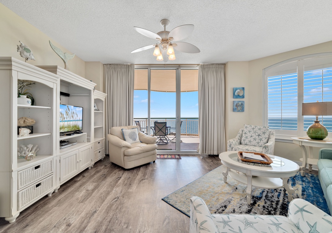 This spacious yet cozy Gulf front retreat boasts comfortable furnishings, stylish decor, updated electronics and appliances, and luxurious touches throughout. The living room offers plenty of seating where the whole family can lounge, not to mention the floor to ceiling sliding glass doors that lead out to the expansive covered beachfront balcony! Retire after a long day of recreation to one of 2 luxuriously appointed bedrooms and catch some serious z's! Pamper yourself after a day on the beach in the master's glamour bath, complete with an elevated Jacuzzi tub, separate glass and tile walk-in shower, his-and-her sinks and a picture window with Gulf views!