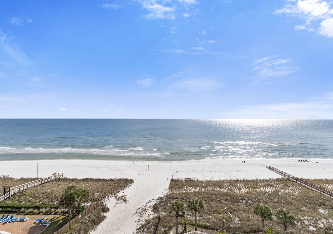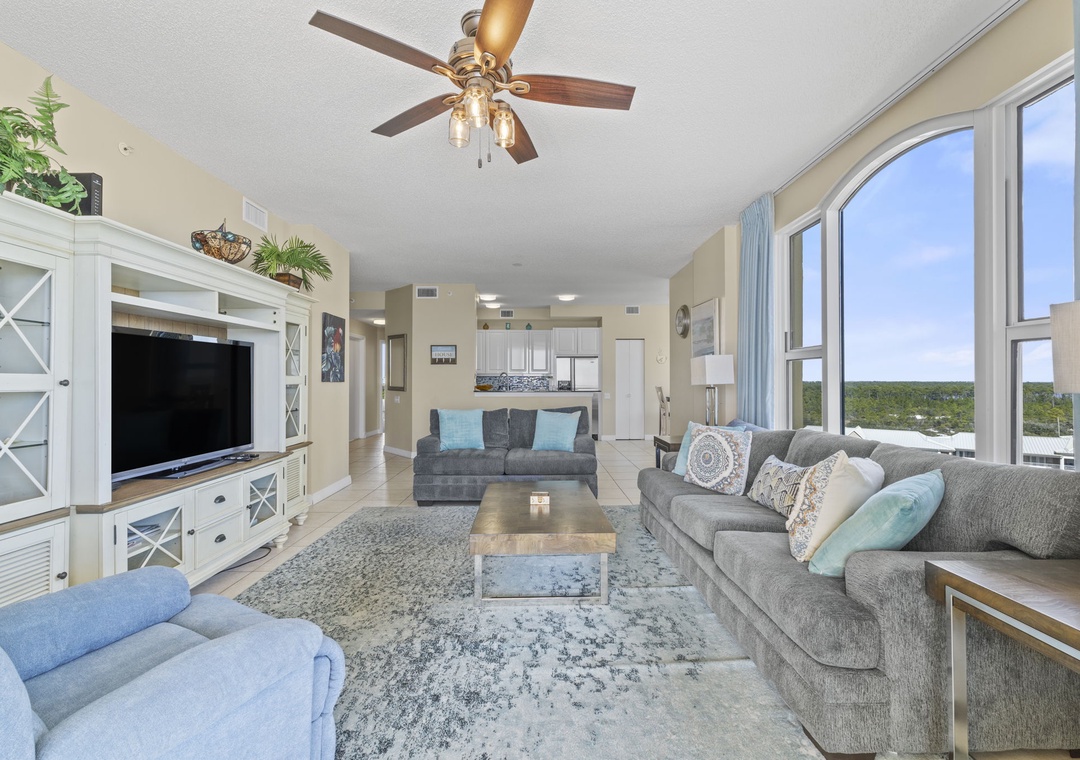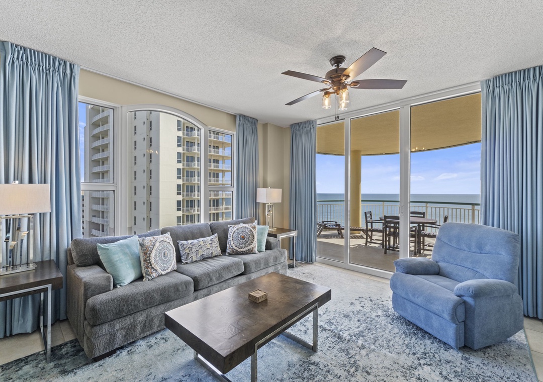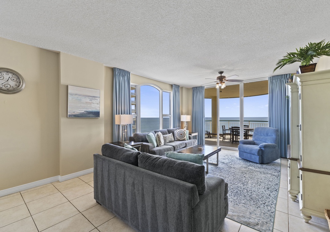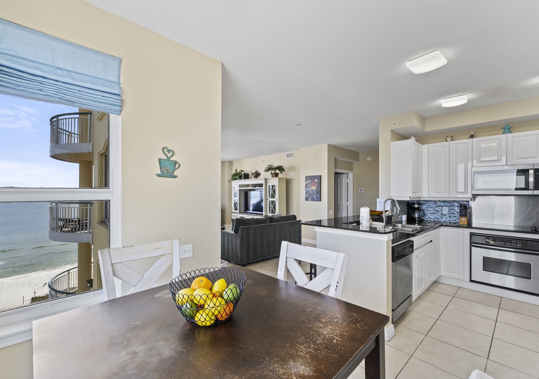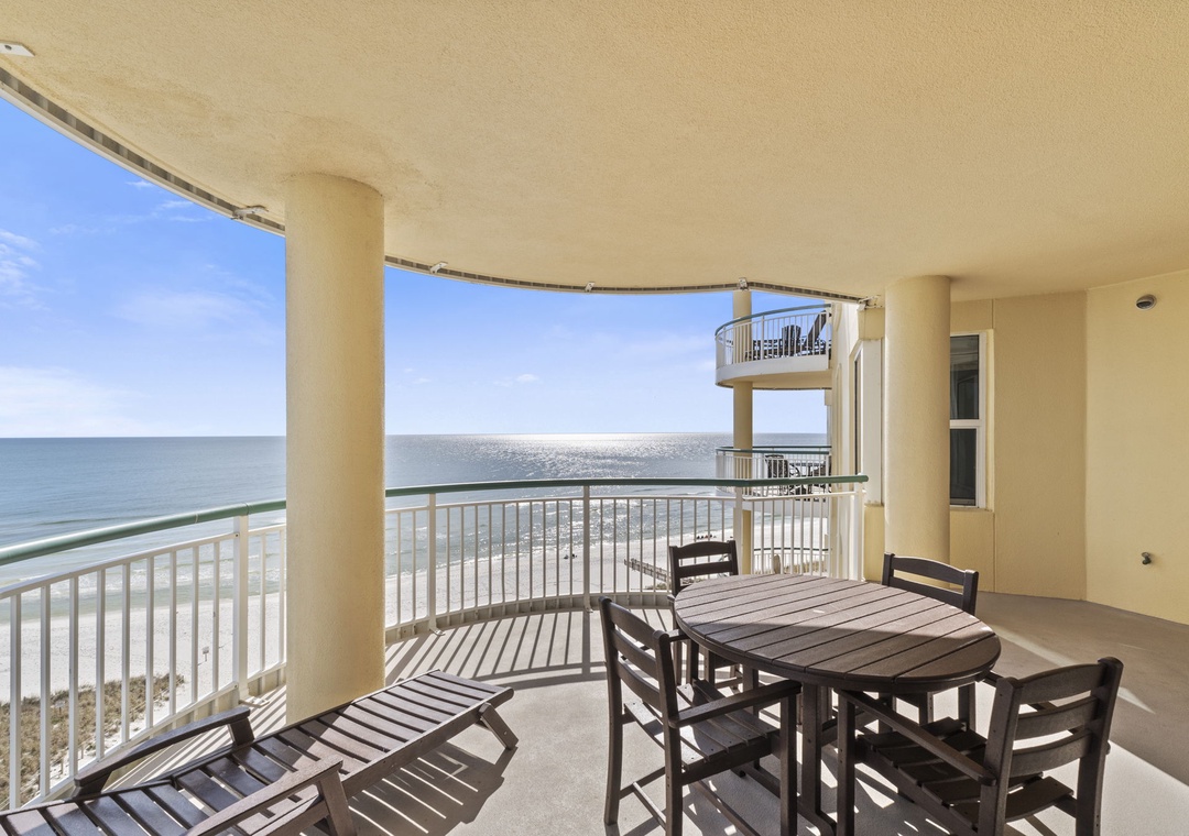 This fabulous 3 bedroom unit features a spacious open-concept layout, updated electronics and beautiful décor throughout! Lounge with the family for movie night in the living area, complete with comfortable furnishings, a large flat screen TV, and beachfront balcony access! The sliding glass doors open to your covered terrace, where you can sit and enjoy the beauty and splendor of the Gulf of Mexico without leaving the comfort of your beachfront abode. With plenty of seating you can even enjoy a delicious dinner alfresco while the moon and stars reflect over the water and the waves crash gently against the shore, creating a breathtaking backdrop for an evening you’ll never forget!
