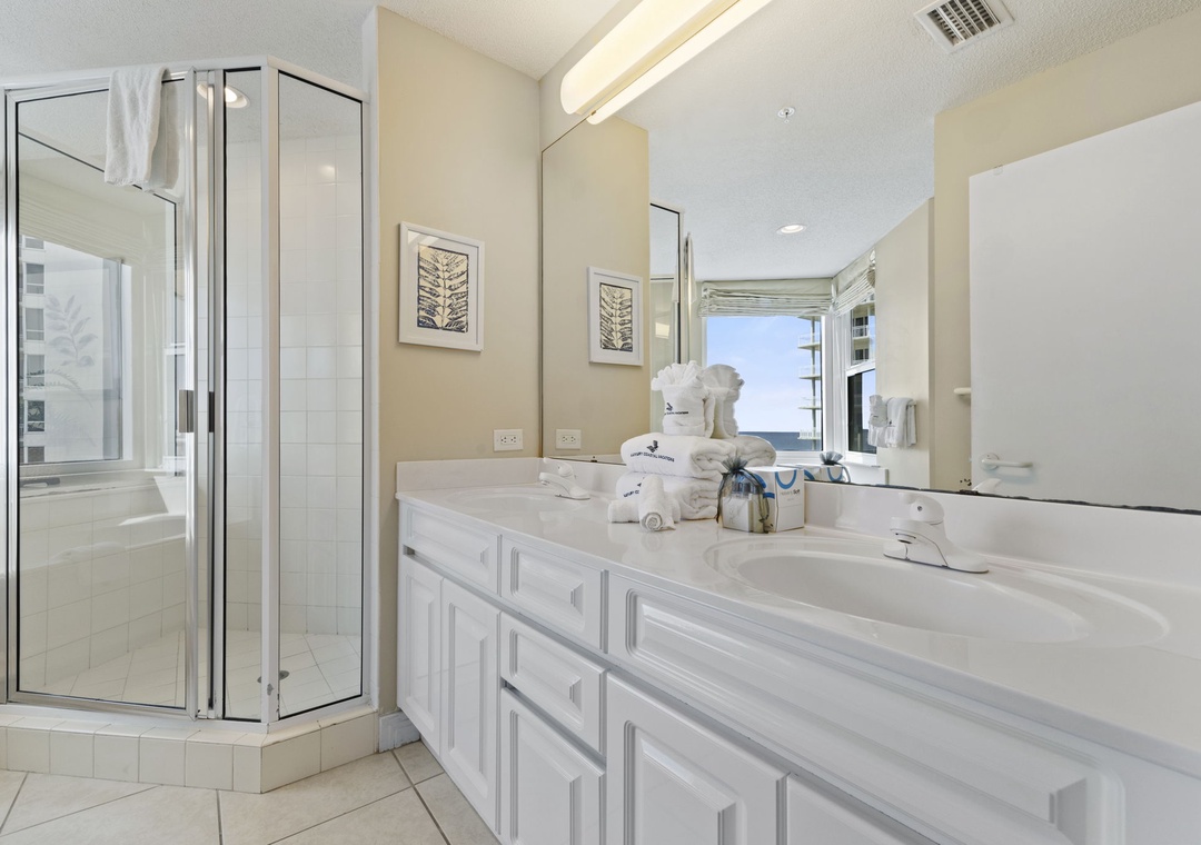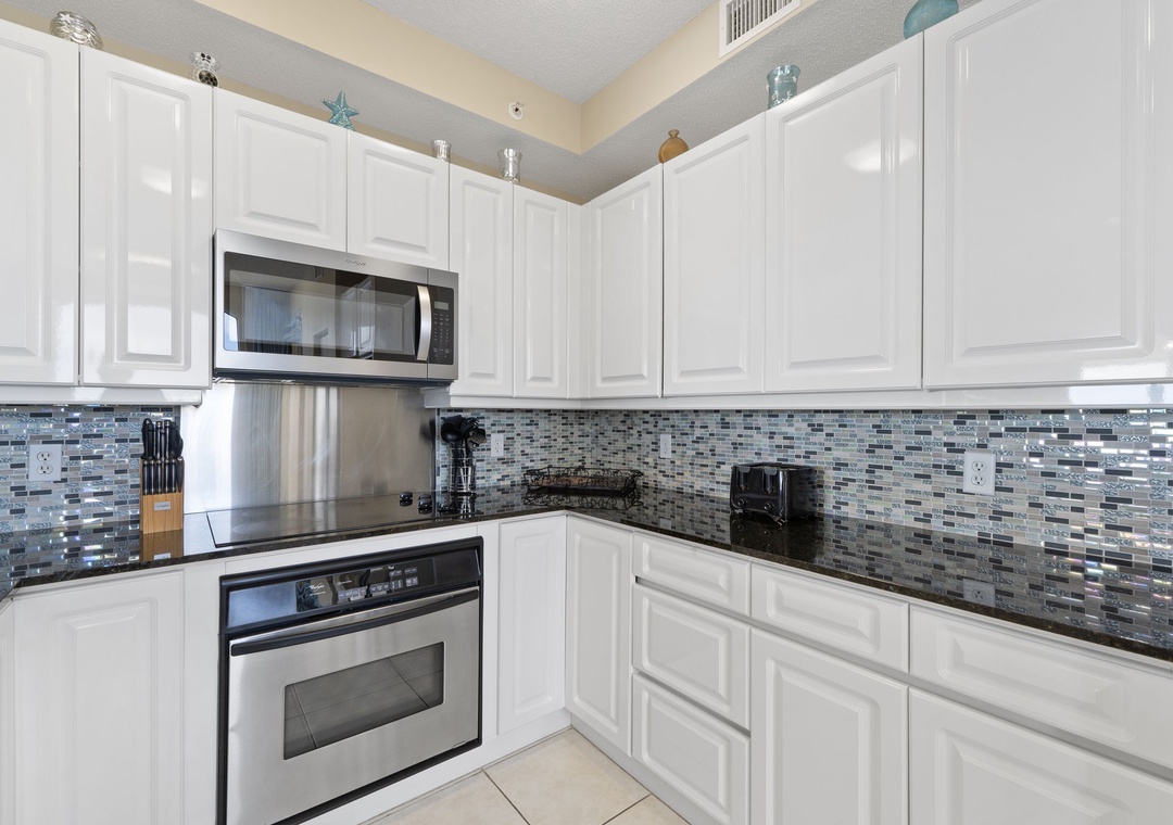 Retire to one of three luxuriously appointed bedrooms and catch some zzz’s during your much deserved getaway. With each featuring premium mattress sets, posh bedding and high thread count linens, you’re sure to indulge in some quality rest and relaxation! The master offers beachfront balcony access, so you can wake up and look out over the magnificent turquoise waters and soft white quartz sands with only a few steps from your comfy king bed! The master bath is equally impressive, affording an elevated jetted tub, separate walk-in shower, his-and-hers vanities and plush oversize 100% cotton bath towel sets, perfect for pampering after a long day on the beach! The living room sofa can be converted into a queen sleeper, affording comfortable accommodations for up to 8!