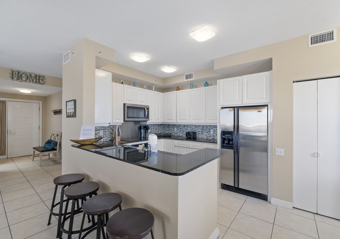 The gourmet kitchen offers everything needed to inspire your inner-chef, featuring top of the line stainless appliances including a side by side fridge with in-door ice and filtered water dispenser, plus all the small appliances, utensils and cookware needed to prepare a culinary masterpiece! The dining area offers seating for the whole family, with additional seating at the breakfast bar.