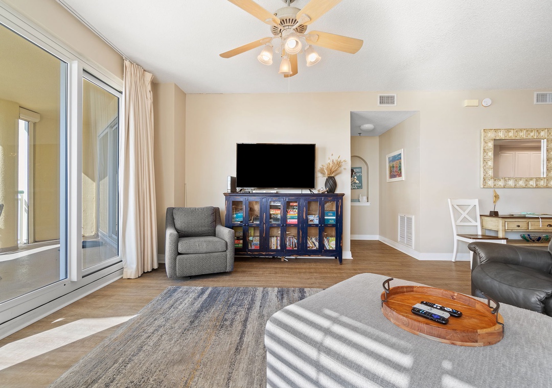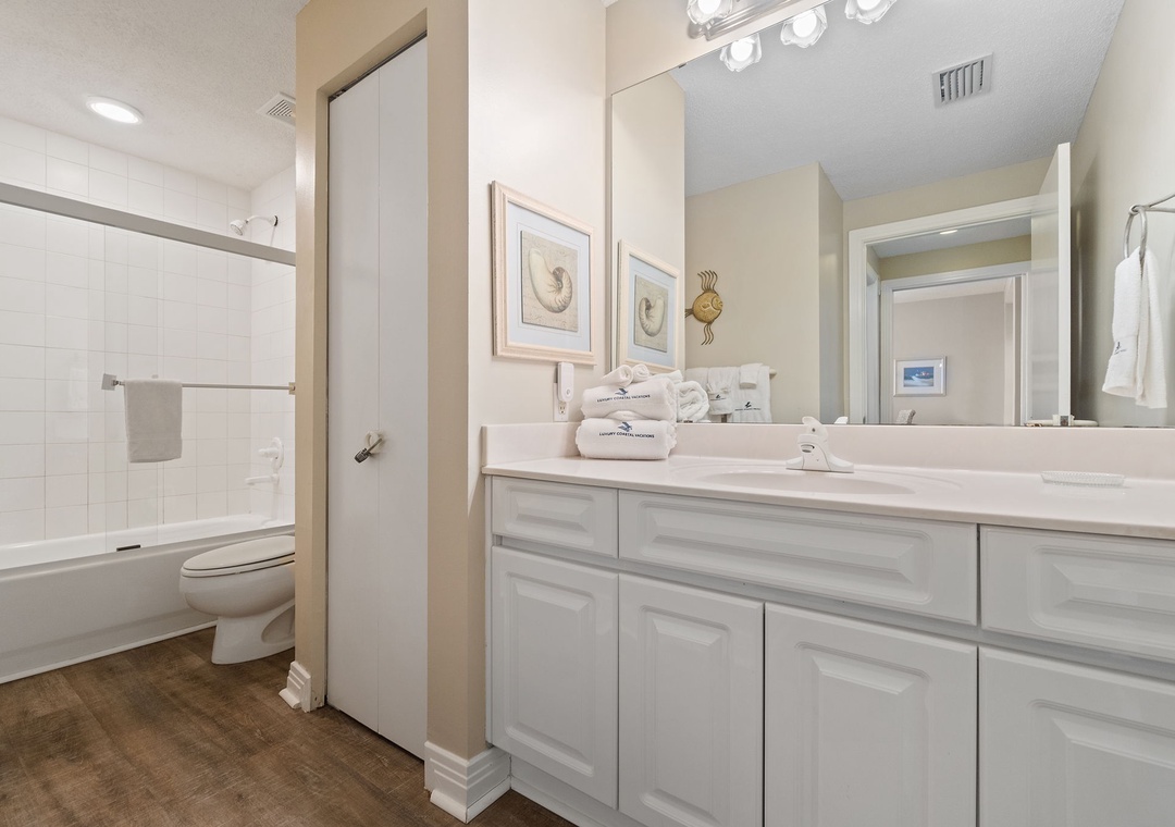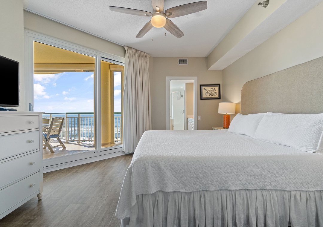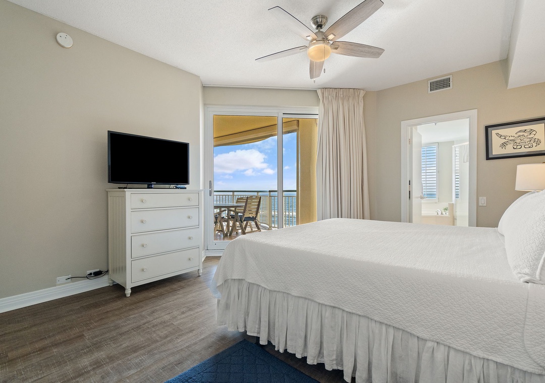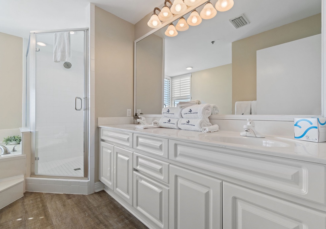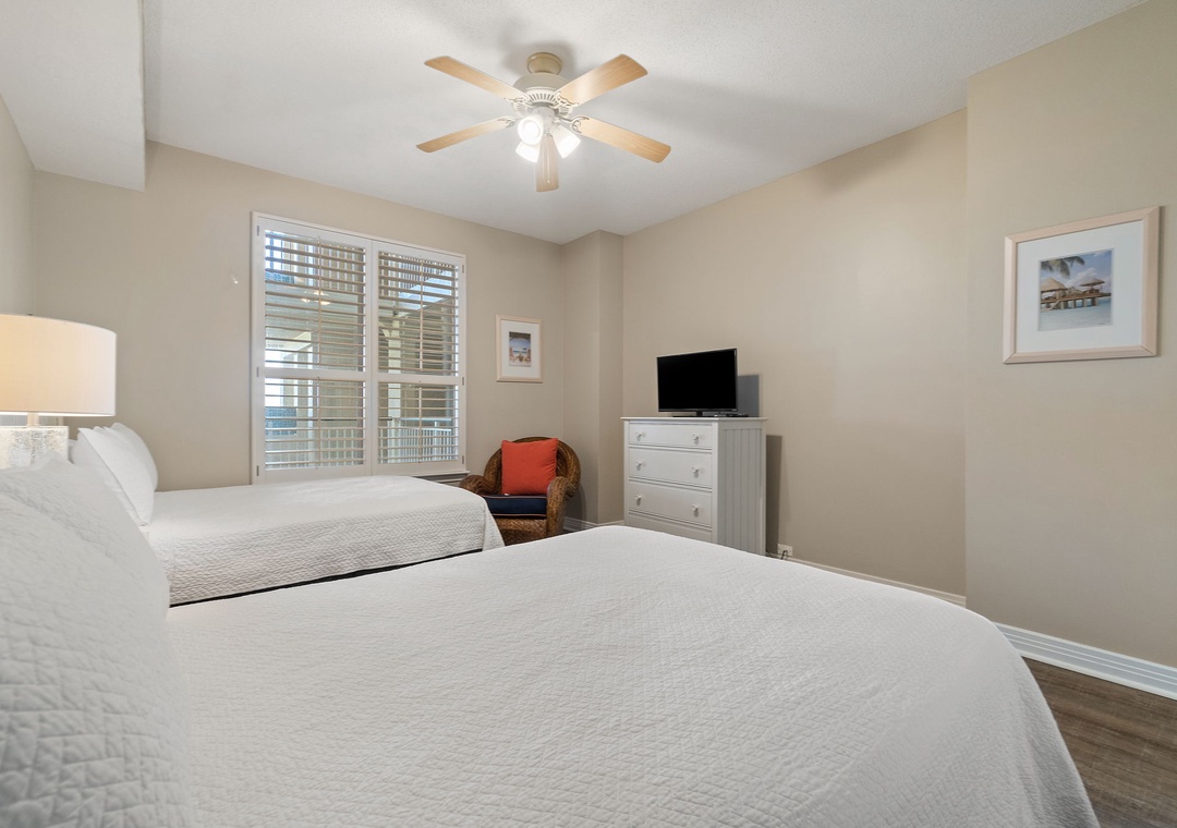 The master suite is elegantly appointed, hosting a king-size premium bed, a huge LCD television and beachfront balcony access! The attached master bath is equally impressive, featuring a jetted garden tub, a separate walk-in shower and his-and-her vanities. The second bedroom offers 2 ultra-comfortable full-size beds and another large LCD television.
