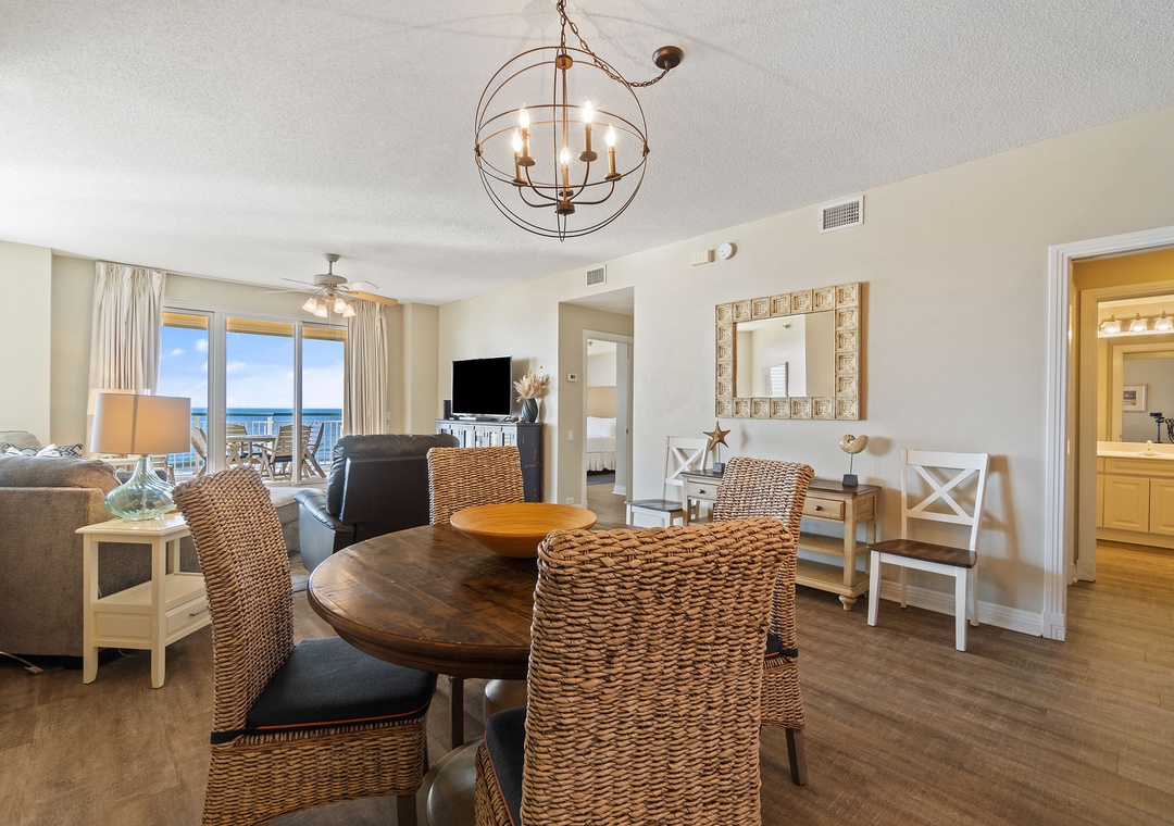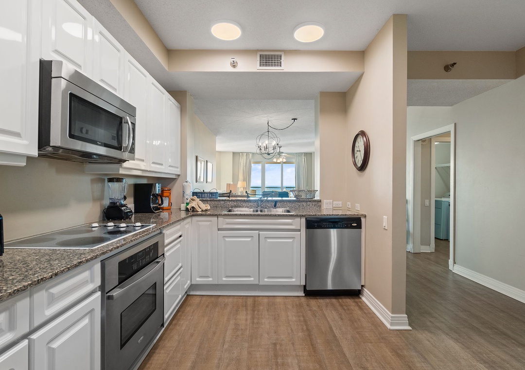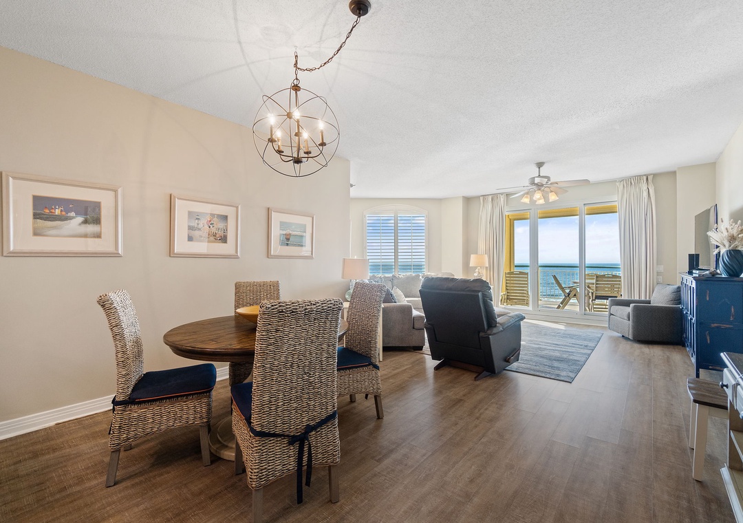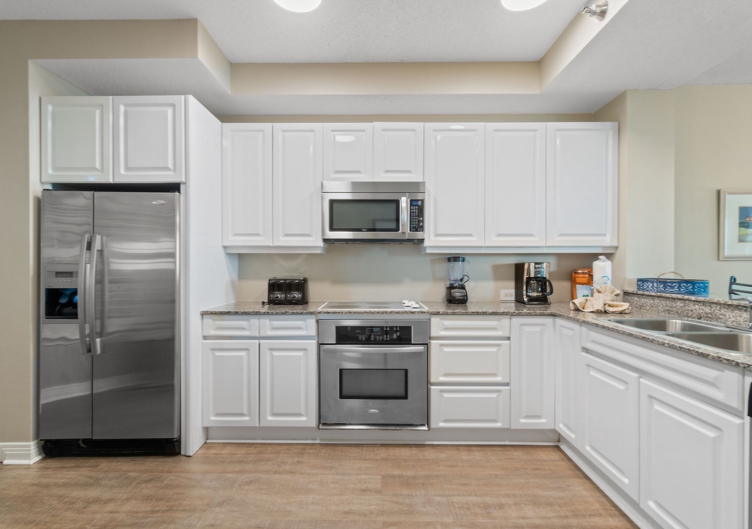 This stunning 2 bedroom unit features a charming beach-inspired decor in vibrant colors, and luxury upgrades such as high-end furnishings, large flat-screen televisions, quality linens, and not to mention the most amazing views of our beloved Gulf Coast! Enjoy your morning coffee or after-dinner cocktail on the oversized 300 square foot beachfront balcony, which offers seating for 6 including an outdoor table and chairs and two cushioned chaise loungers. You'll enjoy cooking in the gourmet kitchen, featuring granite countertops, upgraded stainless steel appliances including a smooth cook top, side-by-side fridge with in-door water and ice dispenser, and all the small appliances and utensils you'll need to prepare your favorite meal. The dining area offers a beautiful table with seating for four, with additional seating at the breakfast bar.