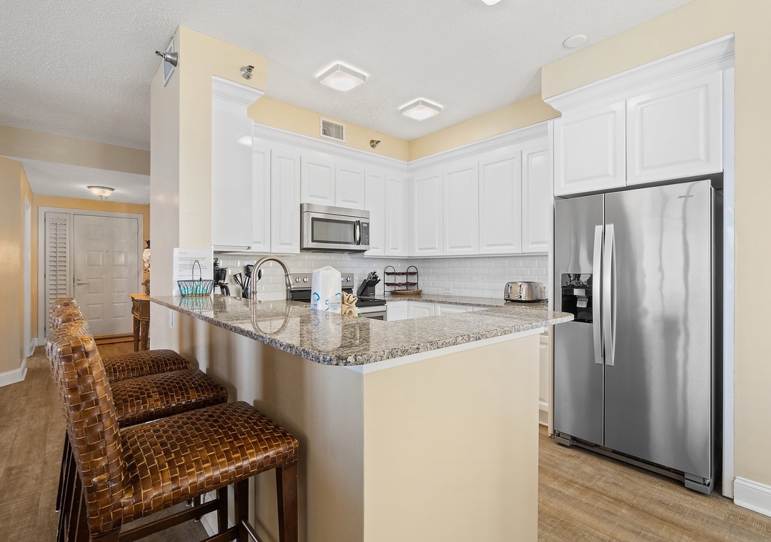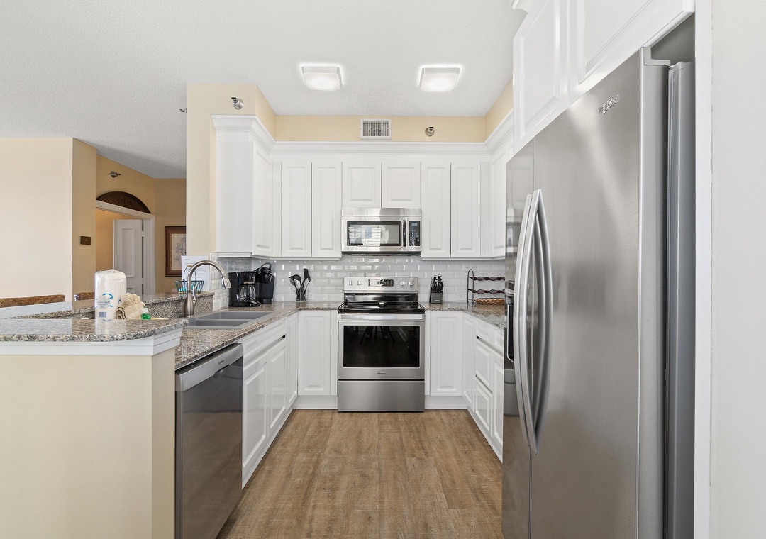 Inside, this beautifully furnished unit boasts plush seating, large flat-screen televisions, and breathtaking views of the Gulf Coast from the expansive 300-square-foot beachfront balcony. The gourmet kitchen is fully equipped with granite countertops, stainless steel appliances, a smooth cooktop, and a side-by-side refrigerator with a water and ice dispenser in the door. The primary suite is a true retreat, featuring a king-size premium bed, a massive LCD TV, and private balcony access, while the en-suite bath offers a jetted garden tub, a walk-in shower, and dual vanities. The second bedroom is furnished with a cozy queen-size bed and another large LCD TV, while the third bedroom provides two full-size beds for extra comfort. Whether you're sipping coffee at sunrise or unwinding with a cocktail at sunset, this beachfront getaway promises an unforgettable vacation.