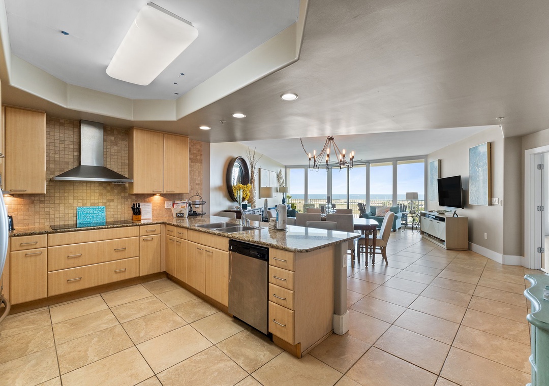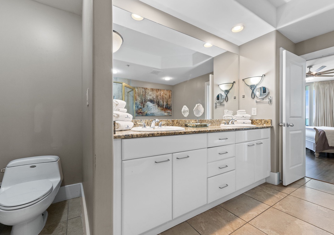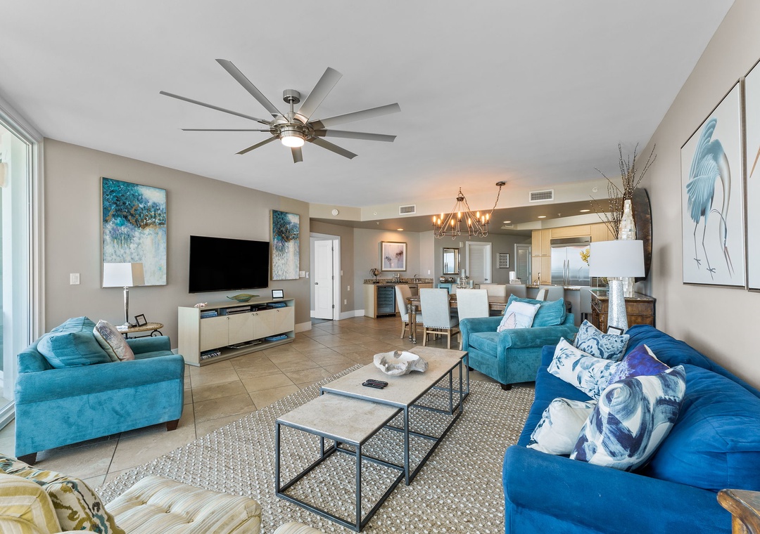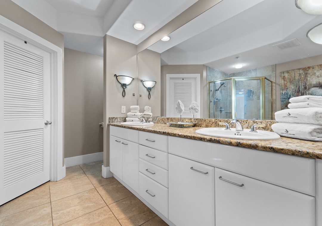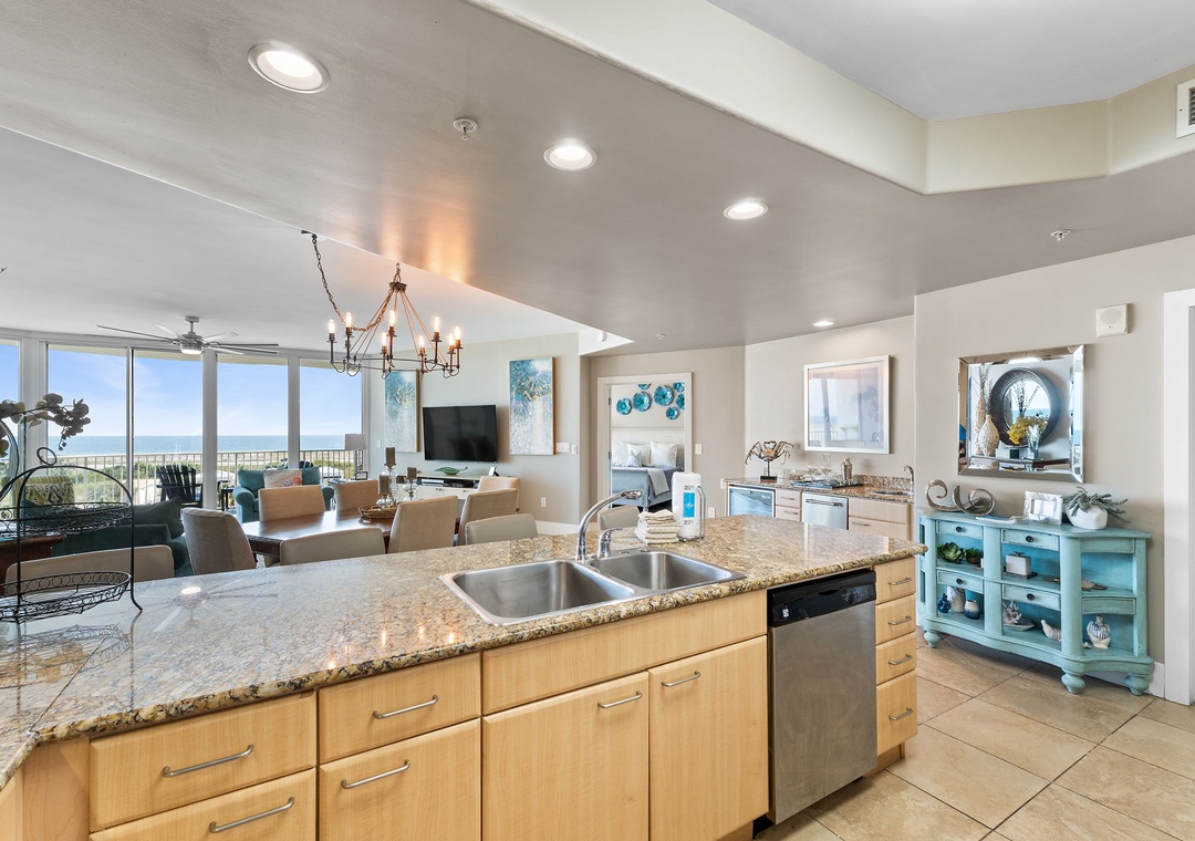 With premium mattresses and luxury appointments in the bedrooms and baths, you'll definitely catch up on some much needed rest and relaxation during your vacation. The master bedroom offers a king size bed with a remote-controlled adjustable base, allowing you to sleep soundly and comfortably on your vacation! The master suite also offers balcony access, and the adjoining glamour bath includes a jetted 2 person tub, separate walk in shower, and twin vanities with vessel sinks. The 2nd bedroom features a premium queen bed and a private bath. The 3rd bedroom offers bunk bed with 1 twin, 1 full bed and 1 full trundle underneath, and private bathroom. With the Queen and Twin sofa sleepers, this unit now sleeps up to 12!