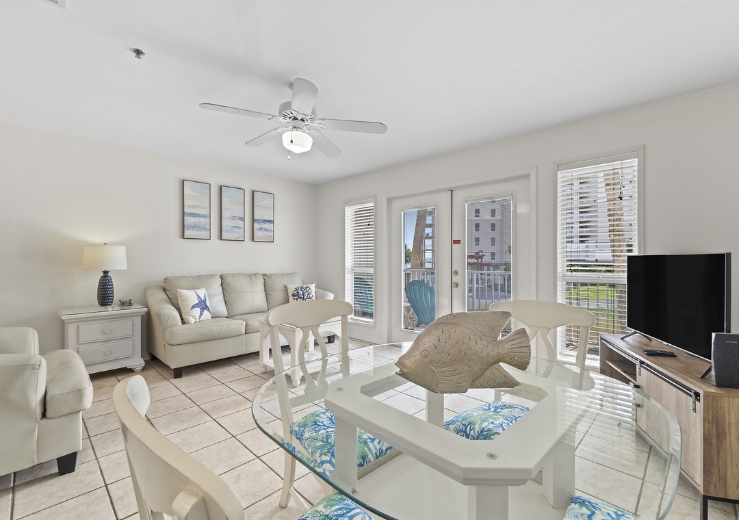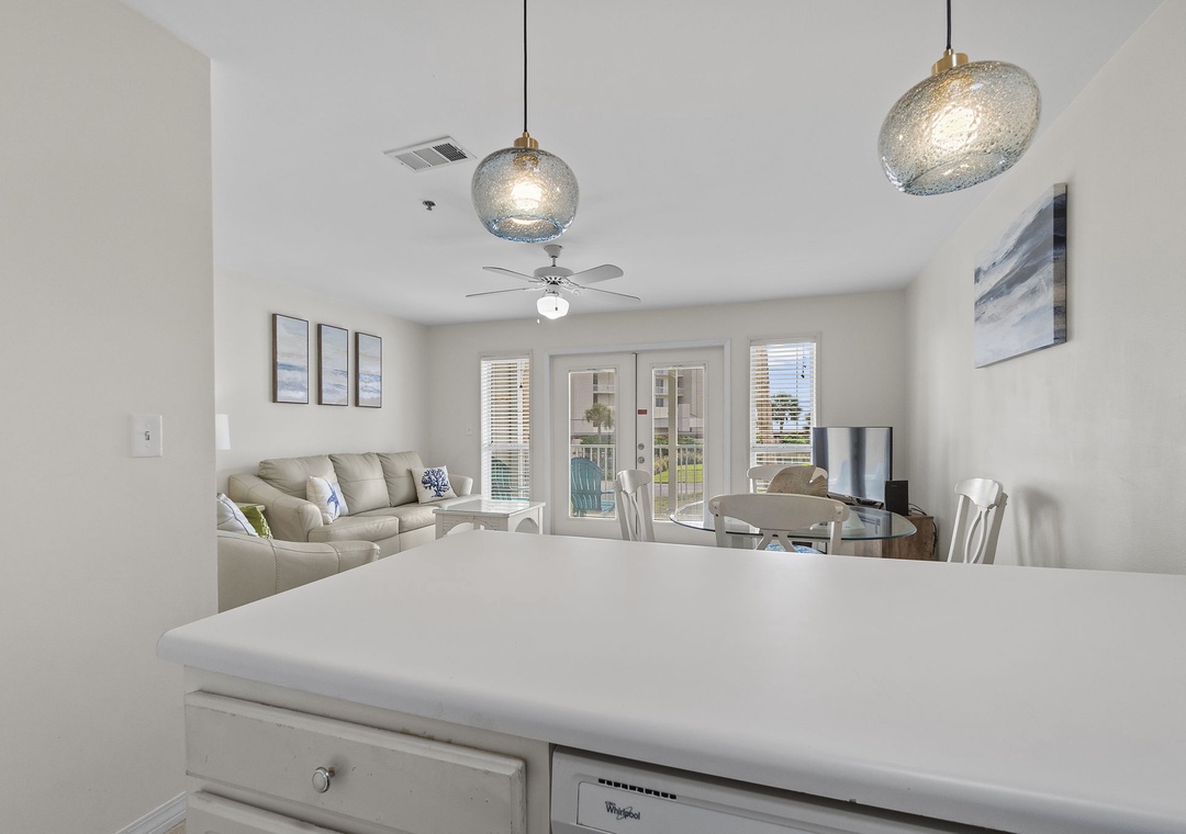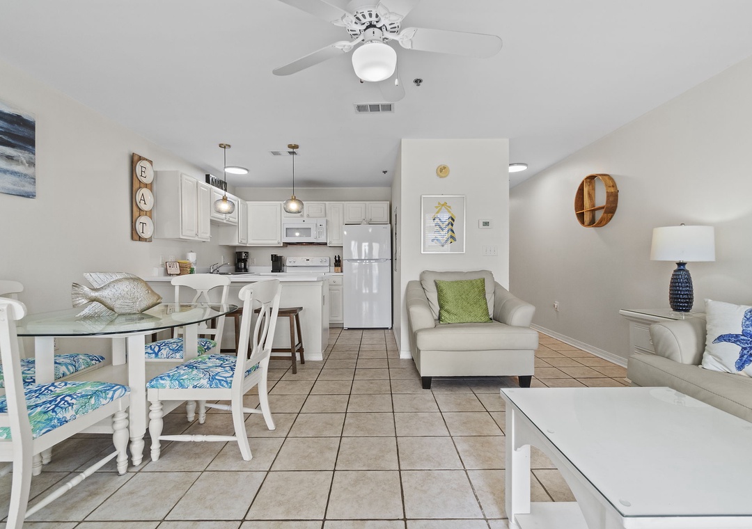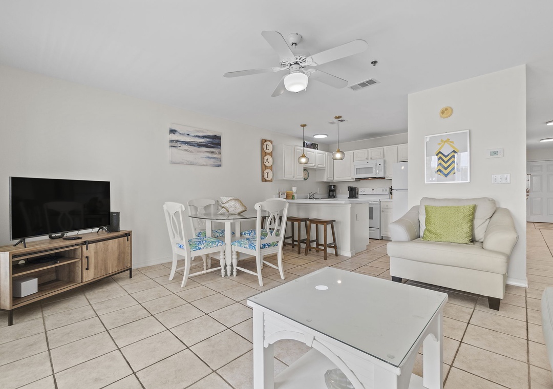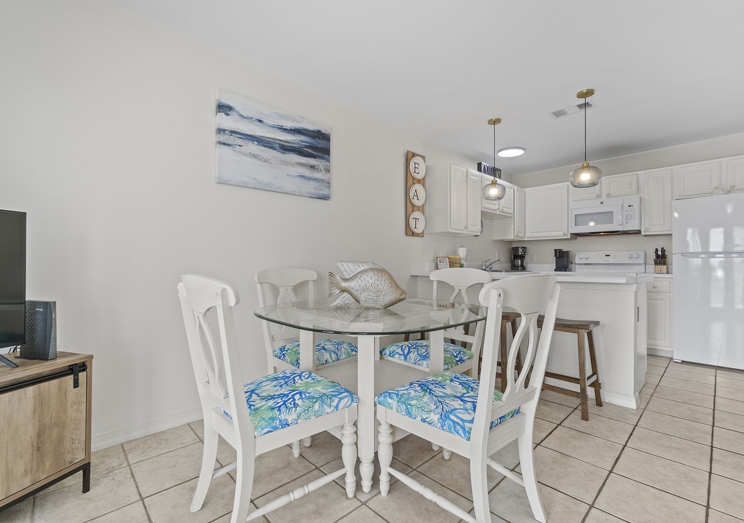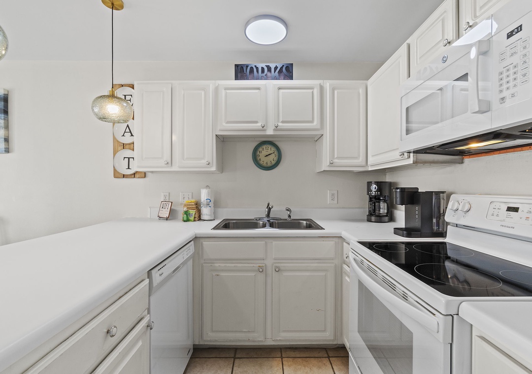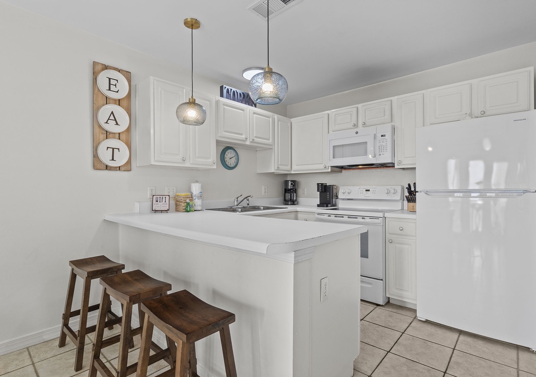 The full size kitchen features large and small appliances plus all the cookware, dishware, and utensils needed to prepare a culinary masterpiece. Eat breakfast at the bar right off the kitchen and enjoy your supper from the dining table which seats 4.