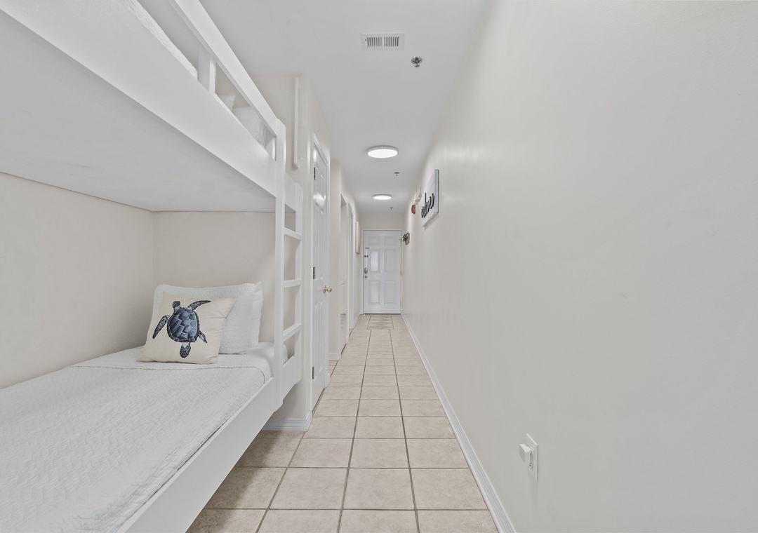 The master bedroom boasts a king bed with luxurious linens and a premium mattress. There is a twin size bunk bed in the hallway alcove and the living room includes a queen sleeper sofa, which accommodates enough sleeping room for up to 6 guests! Additional unit features include a stackable washer and dryer, plush 100% oversize bath towel sets.