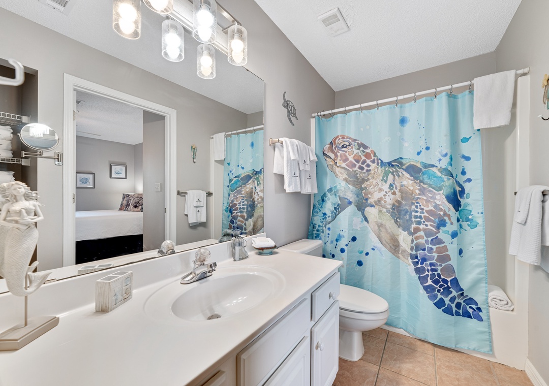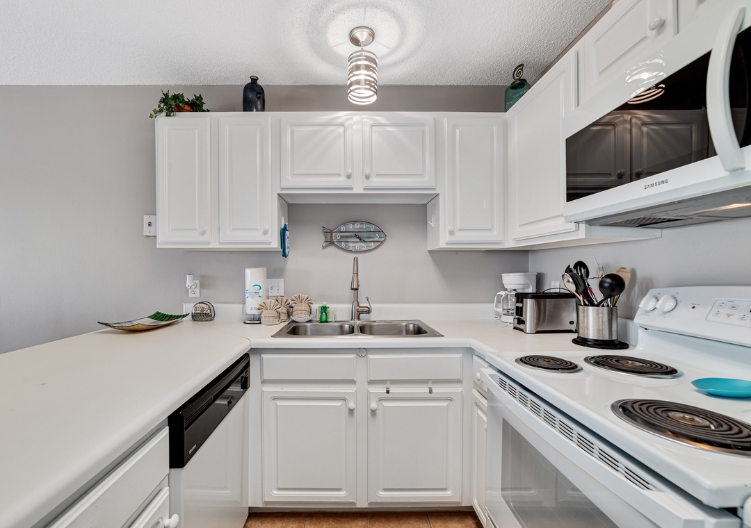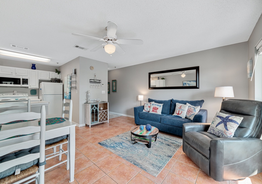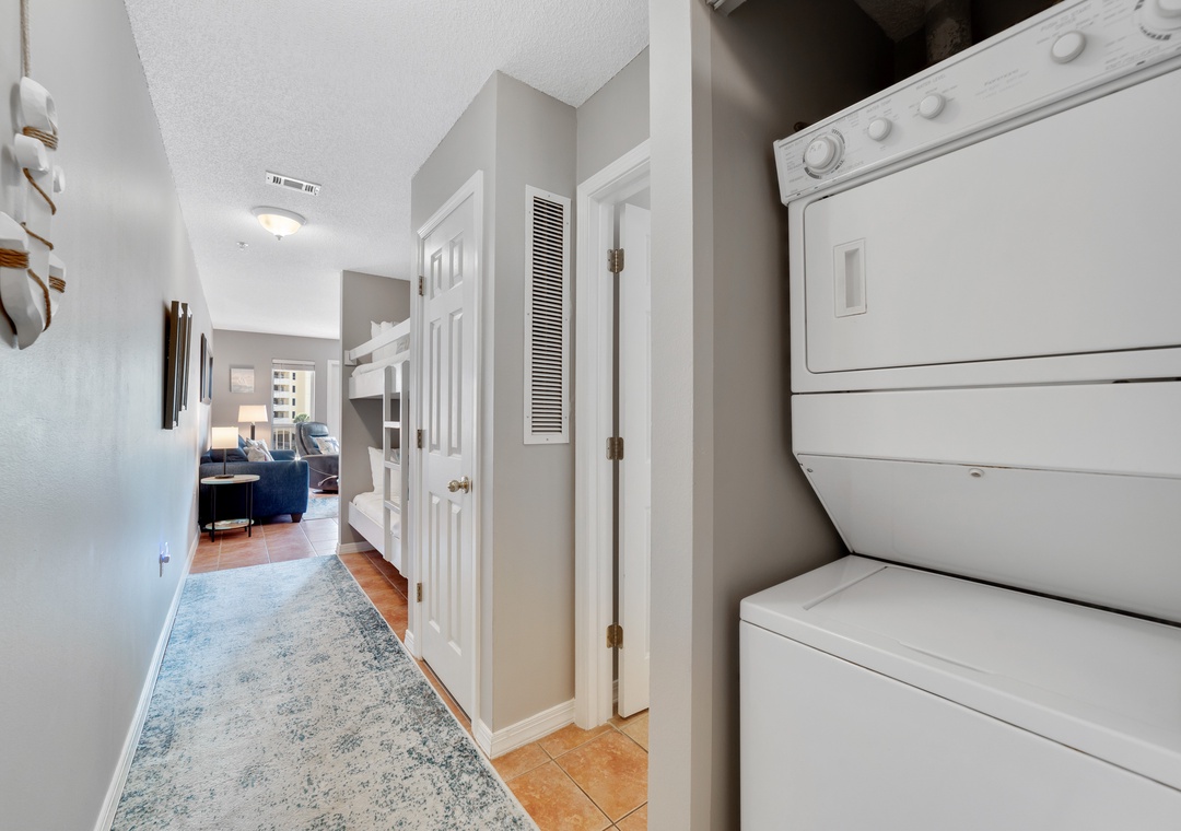 The master bedroom boasts a queen bed with luxurious linens and a premium mattress. There is a twin size bunk bed in the hallway alcove and the living room includes a queen sleeper sofa, which accommodates enough sleeping room for up to 6 guests! Additional unit features include a stackable washer and dryer, plush 100% oversize bath towel sets.