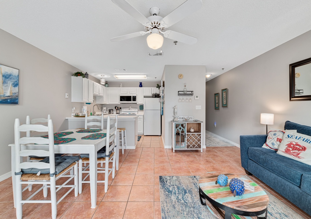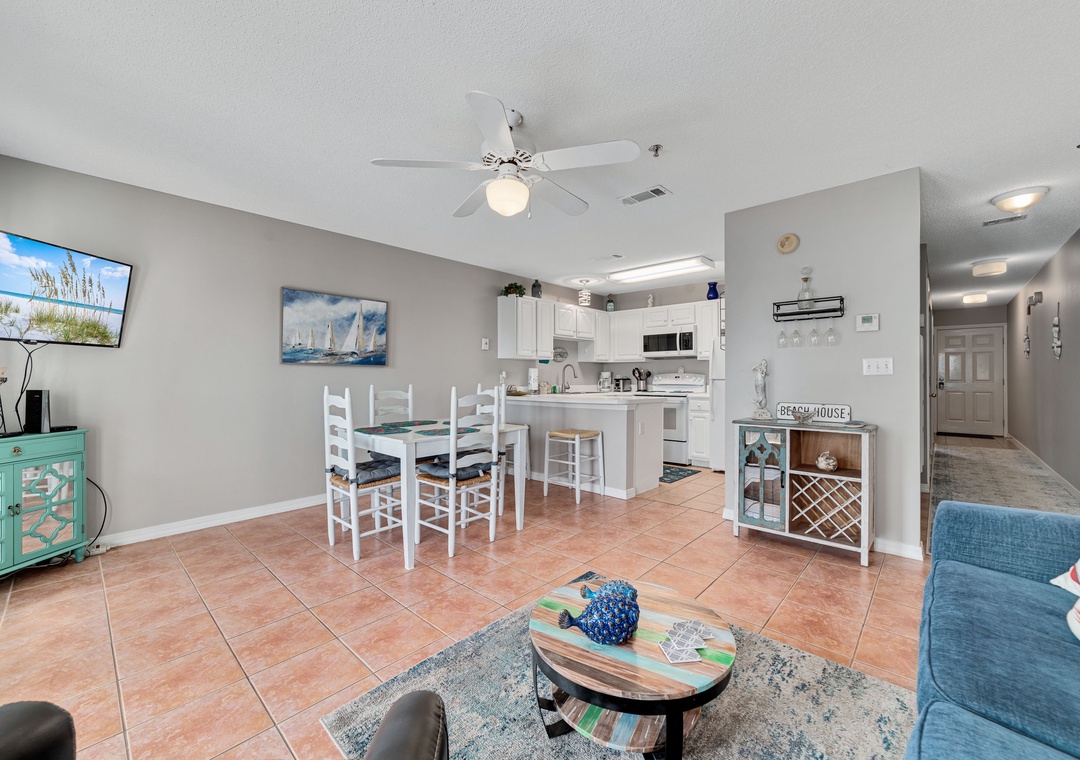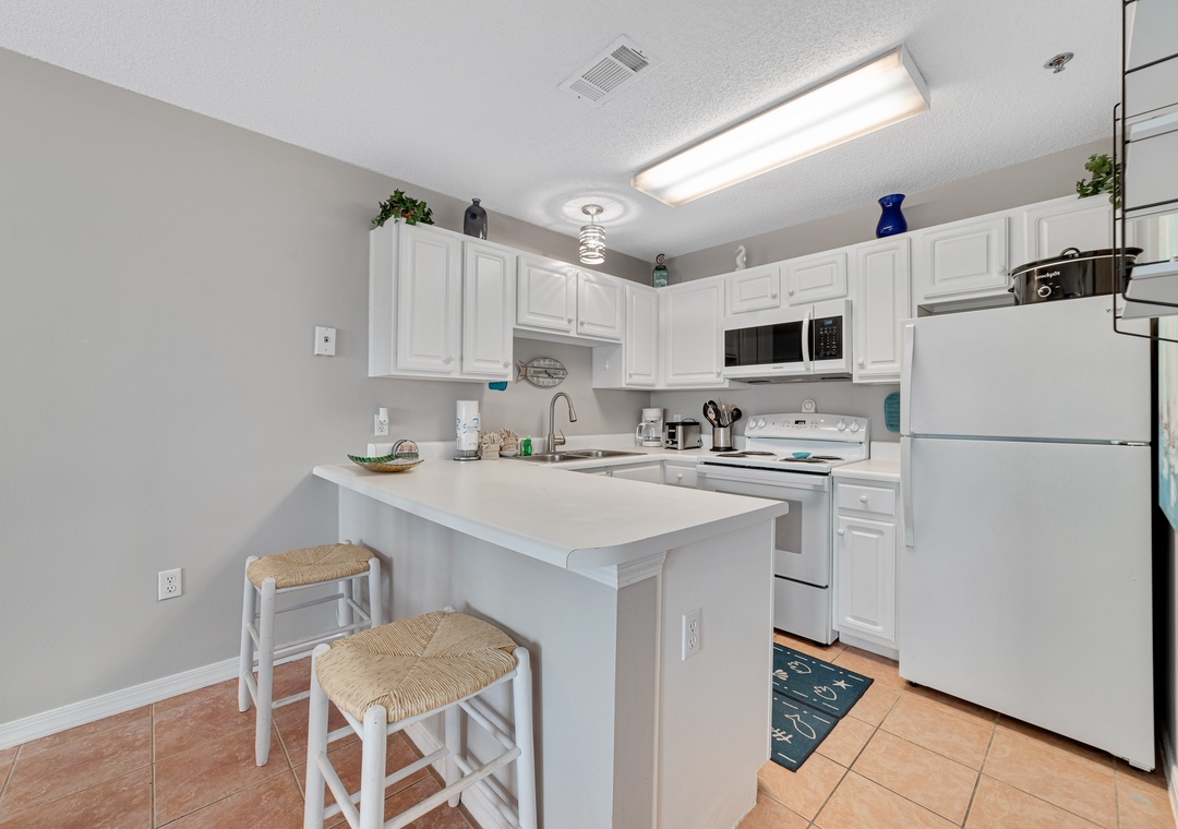 The full size kitchen features large and small appliances plus all the cookware, dishware, and utensils needed to prepare a culinary masterpiece. Eat breakfast at the bar right off the kitchen and enjoy your supper from the dining table which seats 4.