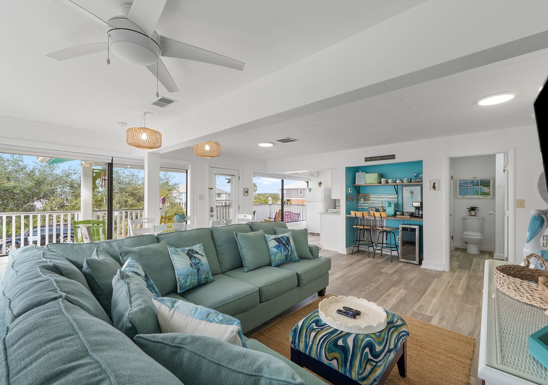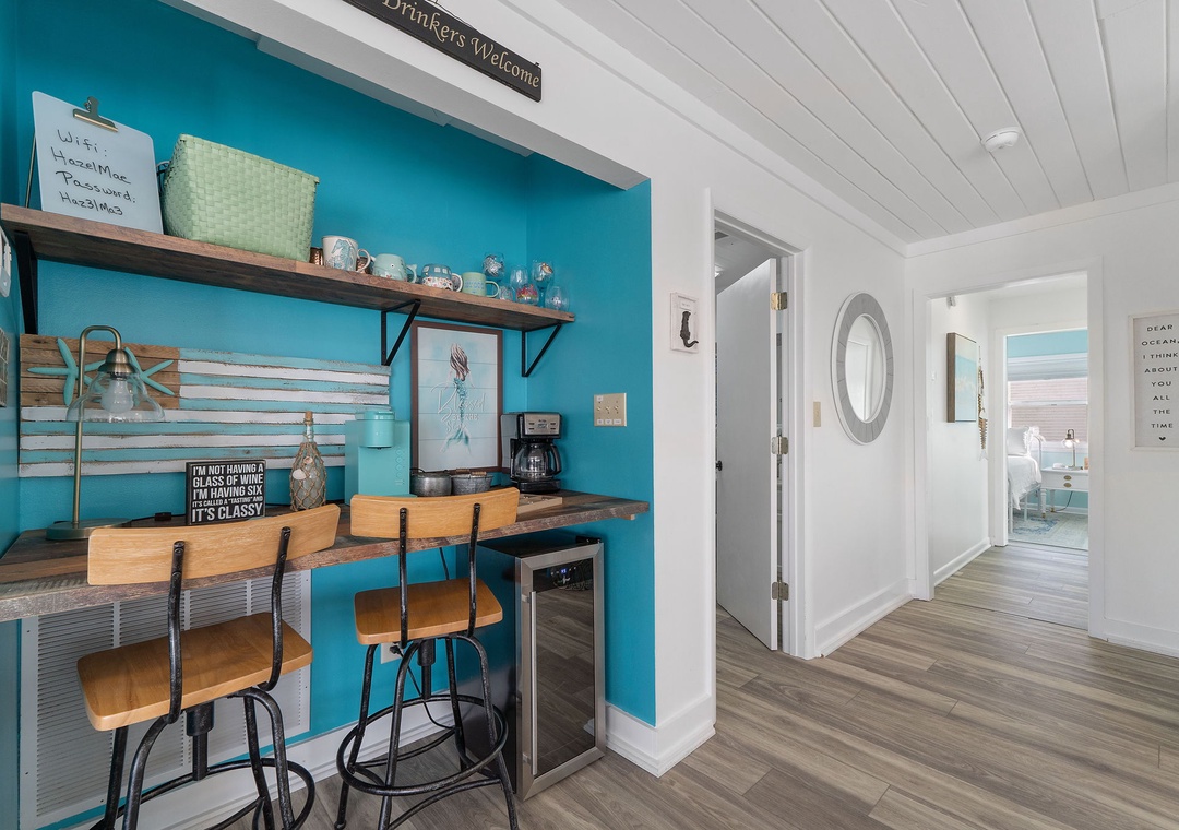 Welcome to Hazel Mae's Hideaway, a charming 2-bedroom, 2-bathroom beach cottage nestled in the scenic surroundings of West Beach, Gulf Shores. Just a short stroll from the public beach access, this picturesque retreat offers the perfect blend of comfort and convenience for your seaside getaway. The cottage features large windows that flood the space with natural light, creating a bright and airy atmosphere throughout. Enjoy your morning coffee or evening relaxation on the inviting front porch or unwind on the spacious back patio after a day of sun and sand. Guests will love the wine/coffee bar, perfect for whipping up a drink no matter what time it is!