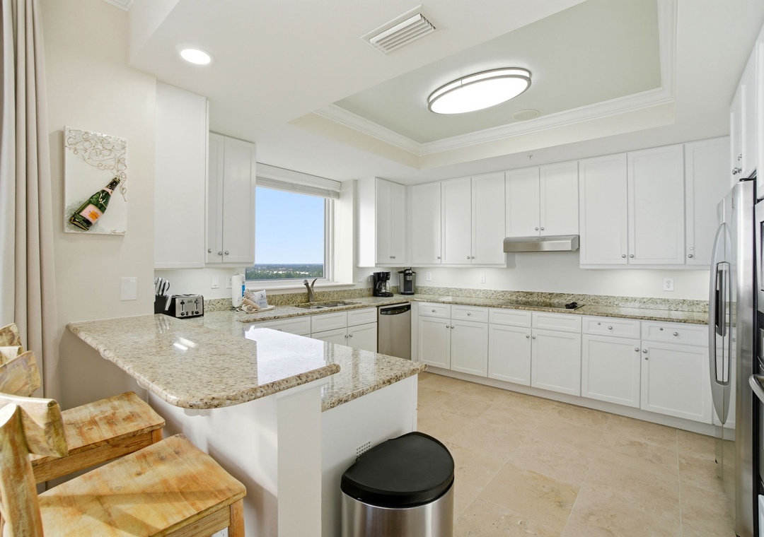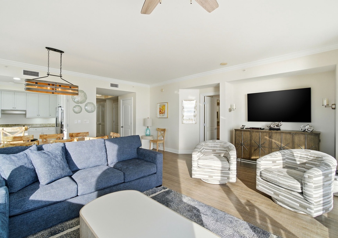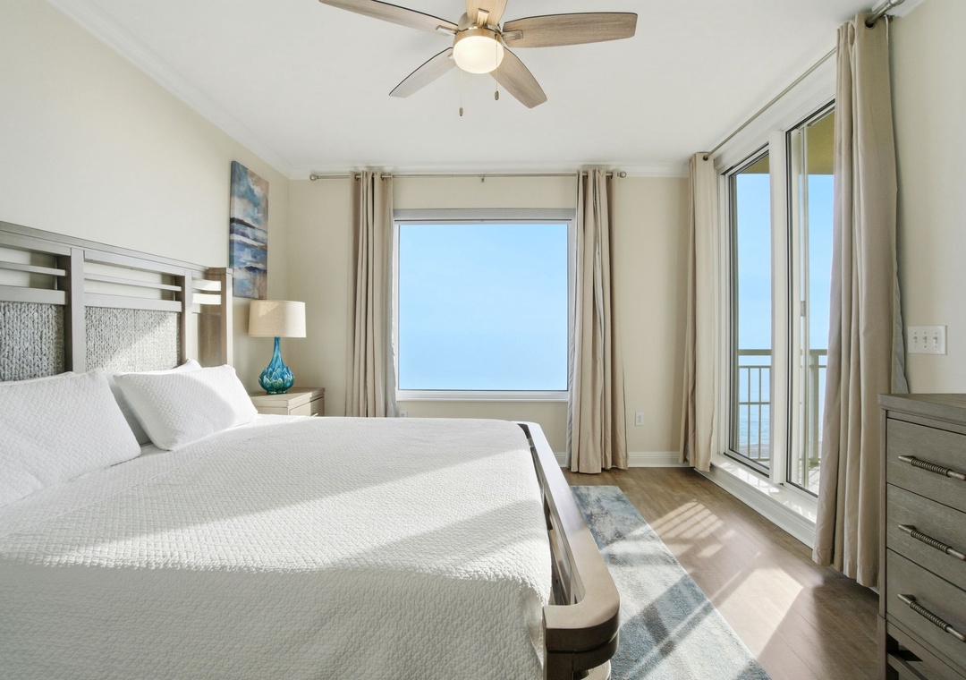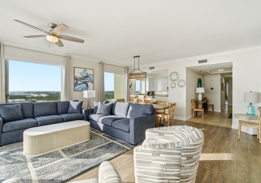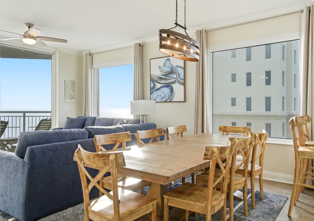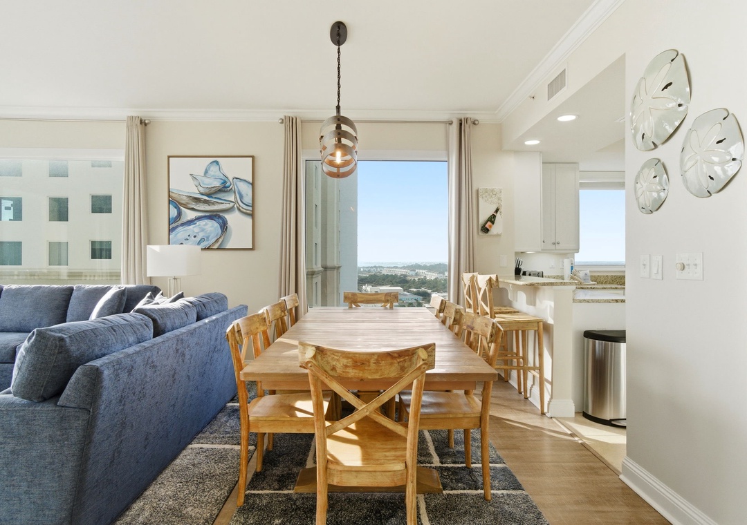 Enhance your vacation experience by staying in this newly renovated, 10th-floor, 4-bedroom, 4-bath corner unit at Indigo. Boasting over 2,300 square feet of luxury, this exclusive condo offers breathtaking views from its oversized balcony, where you can lounge on a chaise or dine al fresco at a table for four. The stylish interior blends sophisticated, modern beach-inspired décor with an open floor plan and expansive windows that showcase stunning vistas from the north, south, and west.