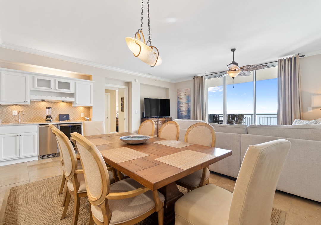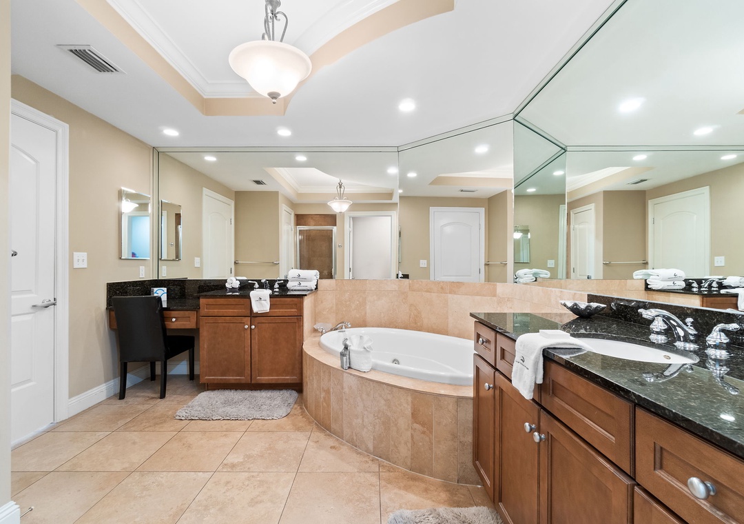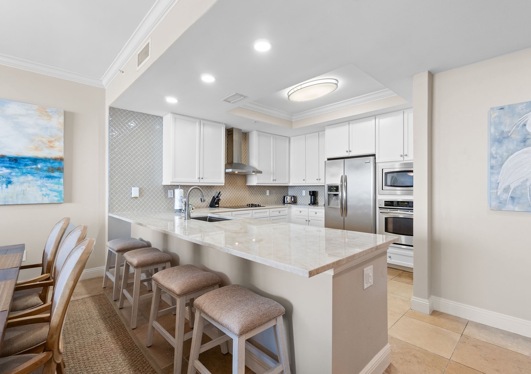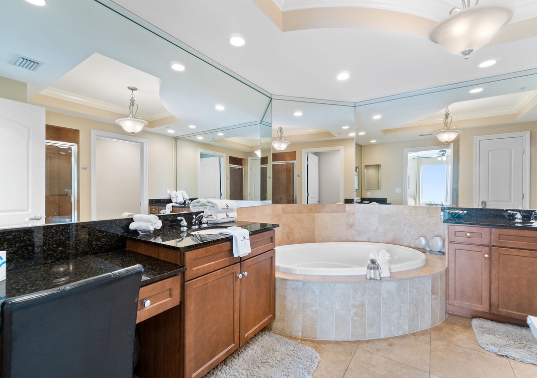 The gourmet kitchen is fully equipped with new stainless-steel appliances, granite countertops, and a custom wet bar with a wine chiller and premium ice maker. Enjoy meals at the wood-crafted dining table with seating for six, or at the breakfast bar with additional seating for three. The master suite offers a plush king bed, flat-screen TV, and balcony access, while the spa-like bathroom features a jetted garden tub, walk-in glass shower, and twin vanities. The guest bedrooms are equally inviting, with premium mattresses, flat-screen TVs, and attached baths—one with a king bed and private bath, and the other with two twins. This unit can comfortably accommodate up to 6 guests.