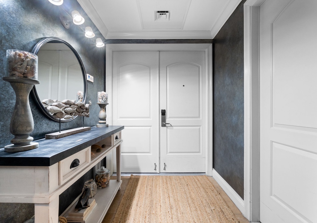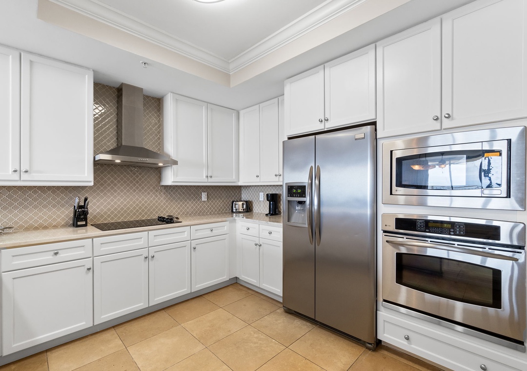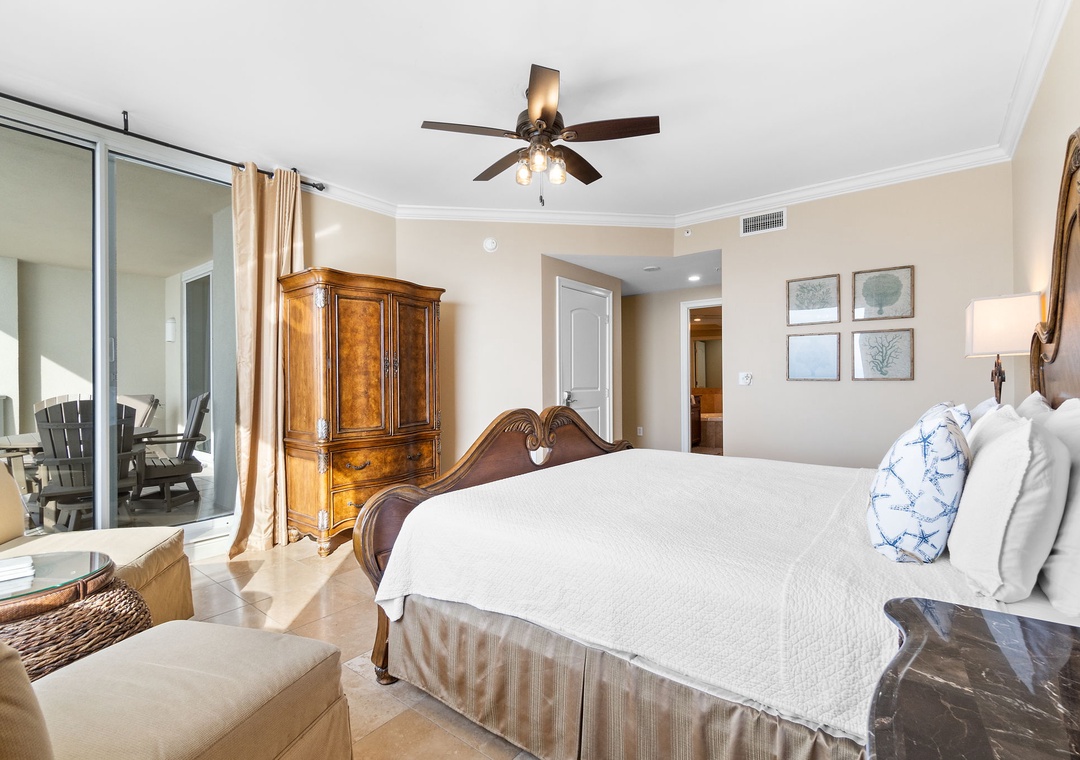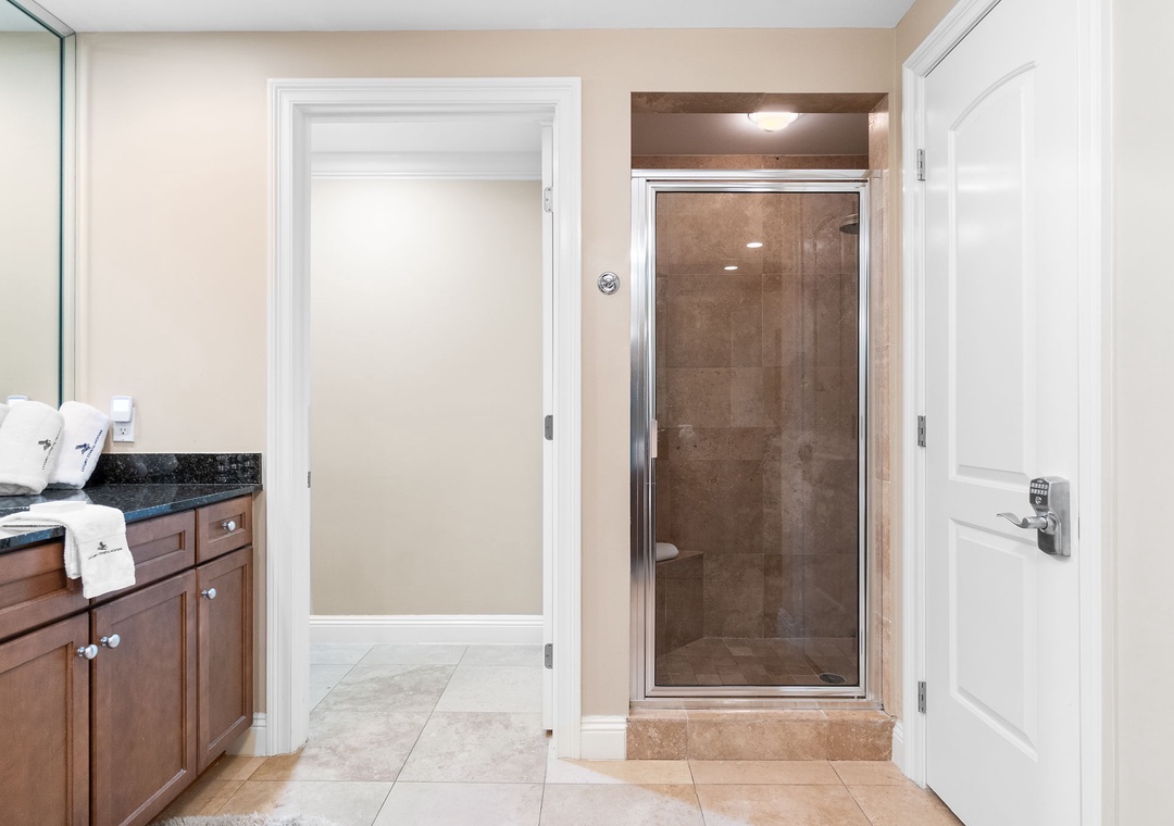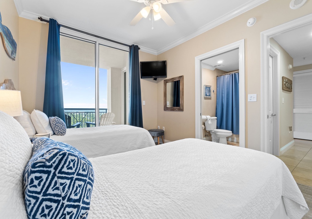 The gourmet kitchen is fully equipped with new stainless-steel appliances, granite countertops, and a custom wet bar with a wine chiller and premium ice maker. Enjoy meals at the wood-crafted dining table with seating for six, or at the breakfast bar with additional seating for three. The master suite offers a plush king bed, flat-screen TV, and balcony access, while the spa-like bathroom features a jetted garden tub, walk-in glass shower, and twin vanities. The guest bedrooms are equally inviting, with premium mattresses, flat-screen TVs, and attached baths—one with a king bed and private bath, and the other with two twins. This unit can comfortably accommodate up to 6 guests.