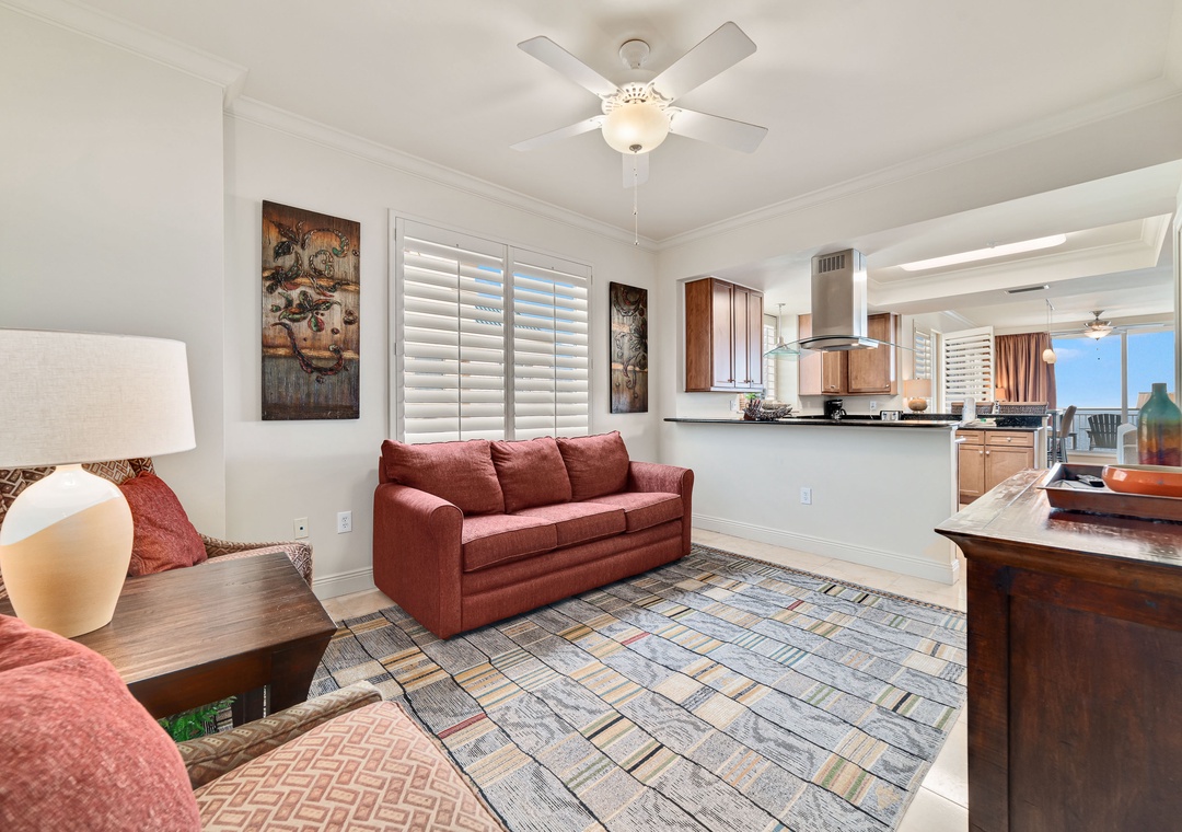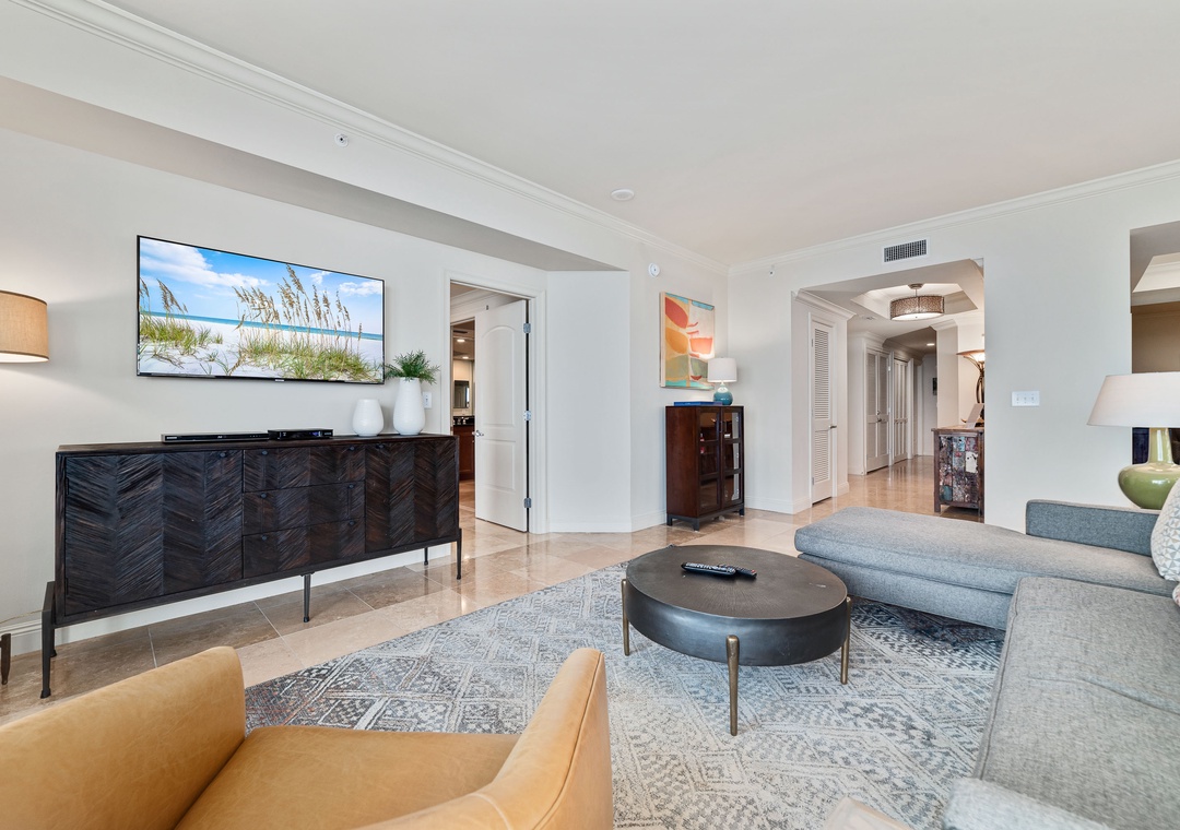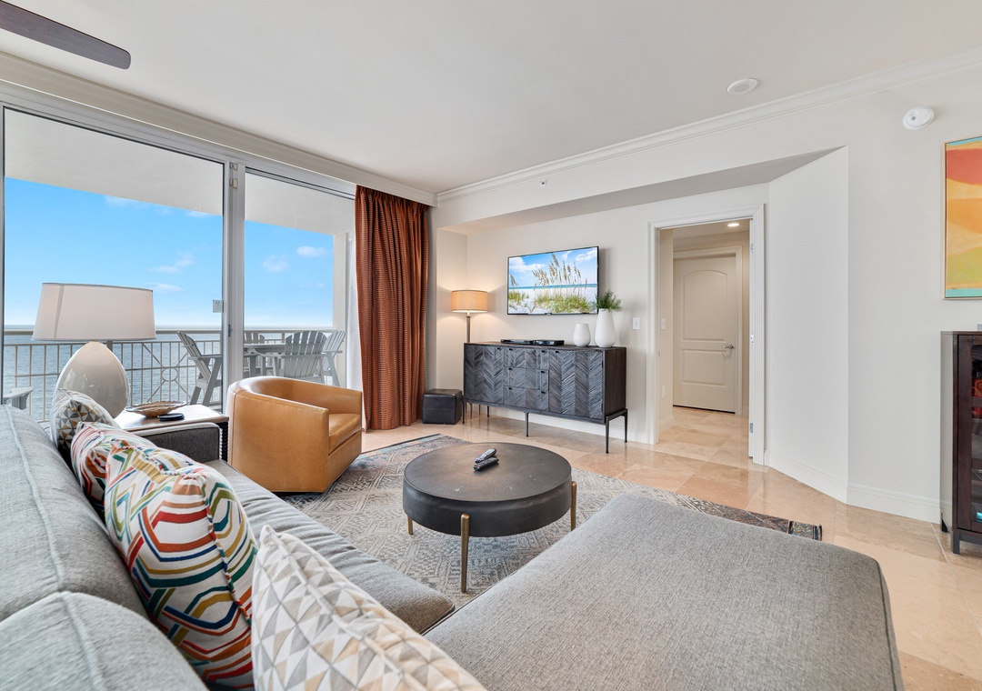 The master suite is a sanctuary of comfort, featuring a king bed with premium linens, a large TV, and direct access to the beachfront balcony. The attached master bath offers a jetted garden tub, a travertine tile walk-in shower, and a double vanity. The second bedroom also features a king bed, the third bedroom offers a queen, and the living room includes a queen sleeper sofa, accommodating up to 8 guests comfortably. Spend your days lounging on the expansive Gulf-front terrace, where panoramic views of the emerald waters and sugar-white sands stretch as far as the eye can see. With additional amenities like a full-size washer and dryer, high-speed Wi-Fi, and digital cable, this unit has everything you need for a luxurious and relaxing stay.