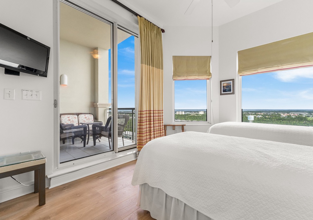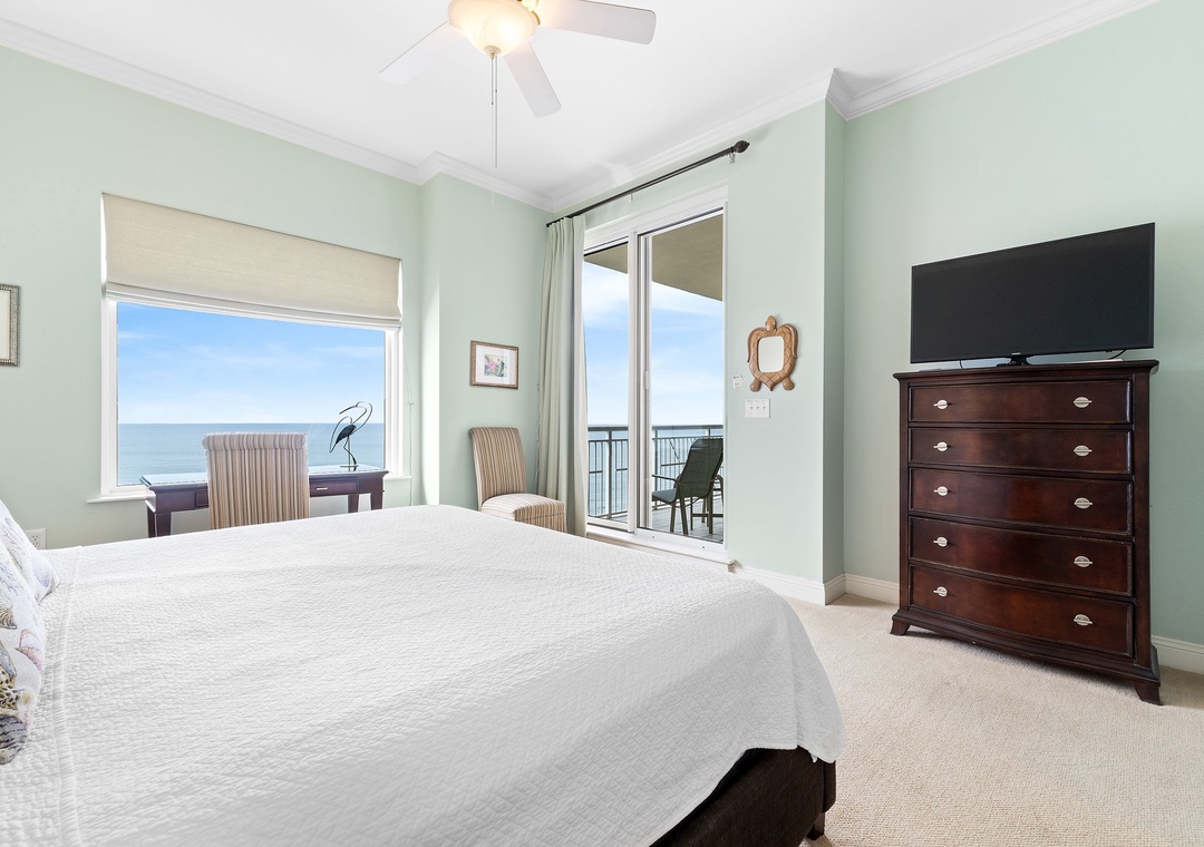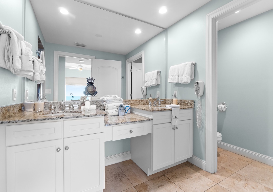 The elegantly furnished living room boasts floor-to-ceiling sliding glass doors that open to a gulf-front balcony, where you can sip morning coffee, read a book, or dine al fresco while taking in the breathtaking views. The master suite offers a king-sized bed, luxurious bedding, a spacious walk-in closet, and a large picture window showcasing panoramic Gulf views. The ensuite bathroom includes a glass and travertine shower, double vanities, and granite countertops. The second bedroom features two extra-long twin beds, soft linens, and access to the north balcony with sweeping views of Old River. A cozy third bedroom offers a full daybed with a twin trundle and its own balcony access, making this condo the perfect retreat for your next getaway!