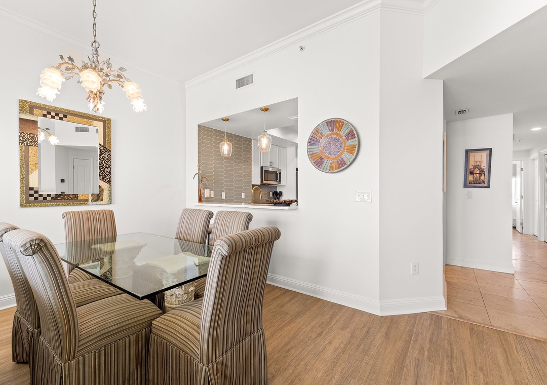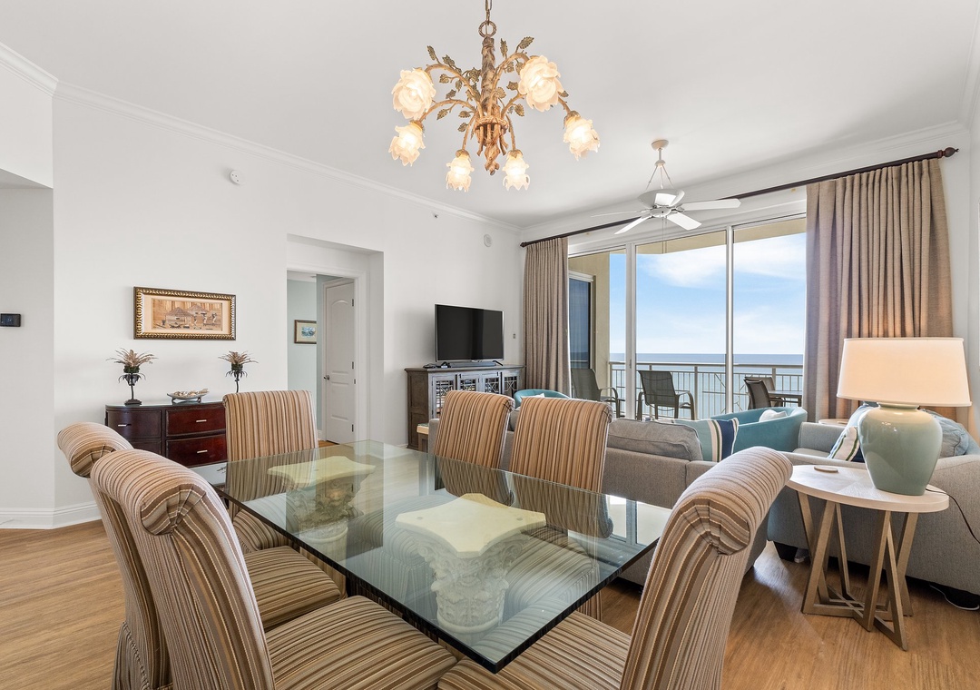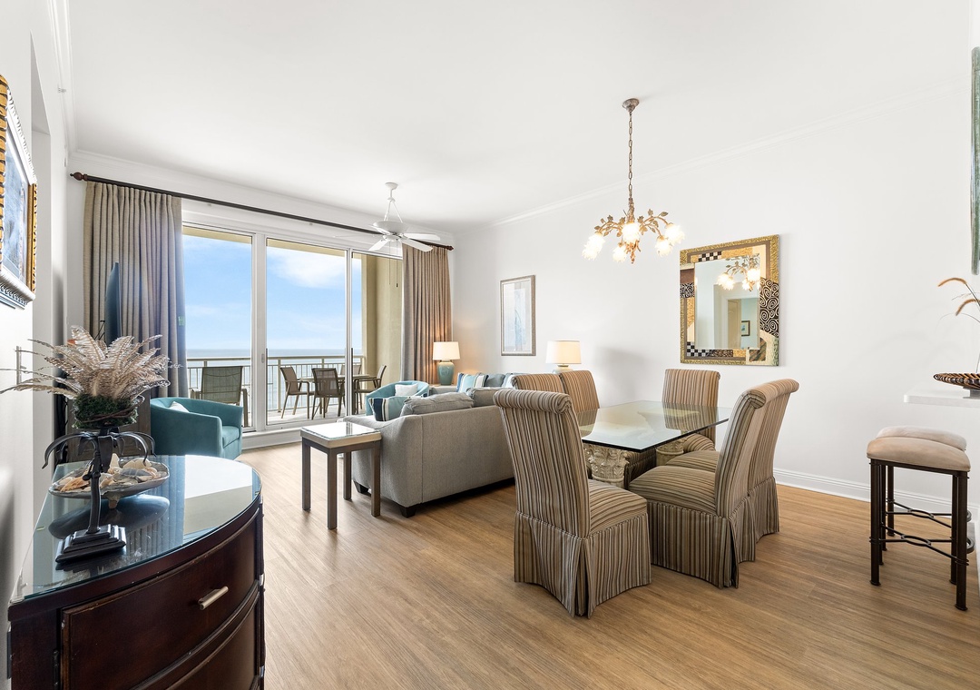 Make your dream vacation a reality in this stunning 20th-floor, 3-bedroom, 2-bath Indigo condo with a bonus den, offering over 1,600 square feet of luxurious living space. Nestled along Perdido Key’s pristine coastline, Indigo Resort is the premier destination for luxury and relaxation. With sugar-white sands and emerald waters as your backdrop, this upscale unit blends style and comfort seamlessly. The gourmet kitchen features granite countertops, stainless steel appliances, a drink cooler, and a convenient wet bar pass-through, making meal prep a breeze. The dining area, with its chic glass-top table and high-back chairs, seats six, and additional breakfast bar seating for two ensures ample space for everyone.