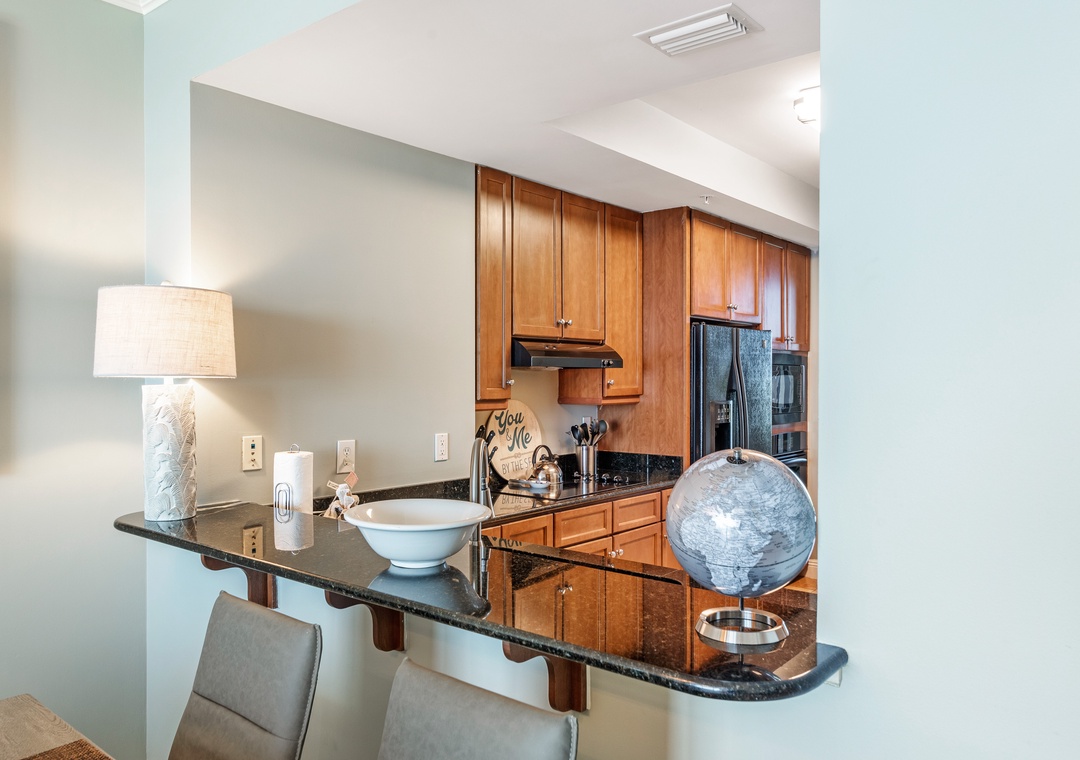 The gourmet kitchen makes cooking a pleasure, equipped with granite countertops, wood cabinetry, and GE Profile appliances, including a side-by-side refrigerator and a smooth cooktop. The dining area comfortably seats four, creating a welcoming space for meals. The luxurious master suite boasts a king bed, an expansive sliding glass door to the beachfront balcony, and an attached bath with a walk-in glass shower and twin vanities. The second bedroom features a plush queen bed with stunning views of Old River, while the bonus den provides extra sleeping space for kids or guests, accommodating up to six guests in total. Book your stay at the Indigo Resort today and enjoy the Gulf Coast getaway of your dreams!