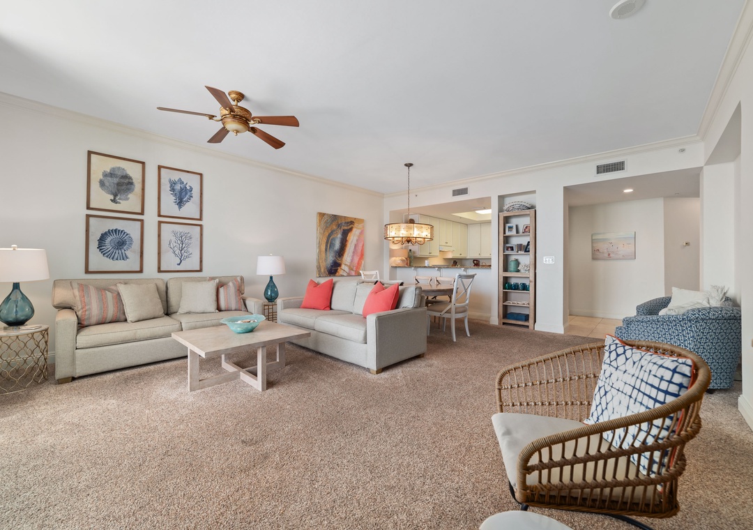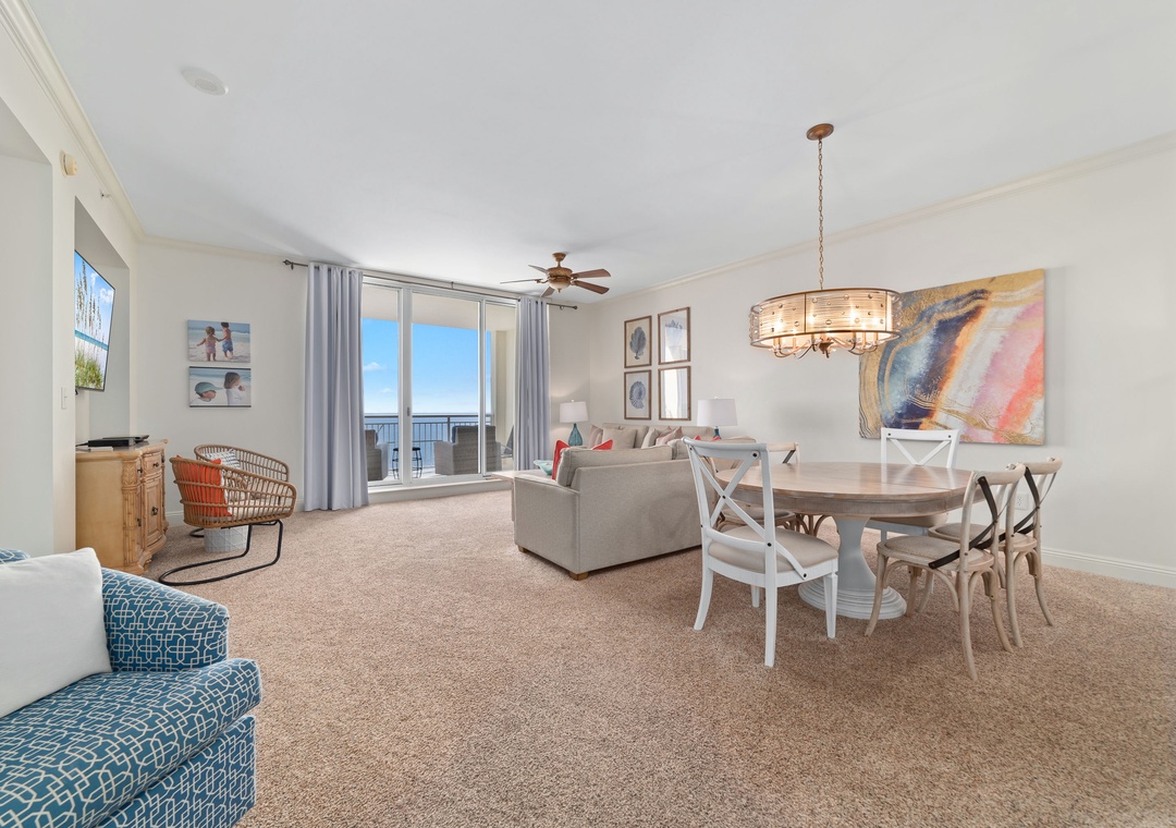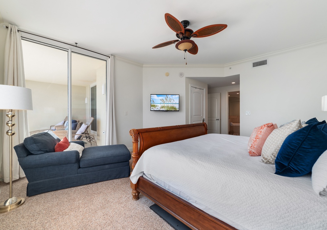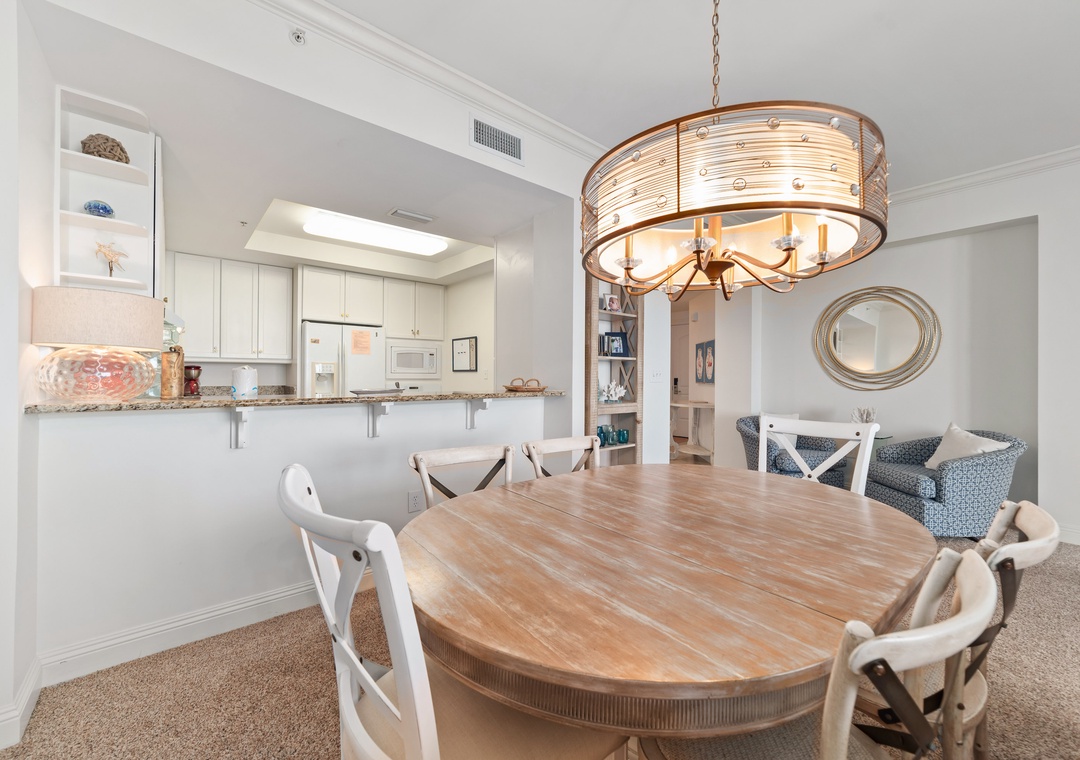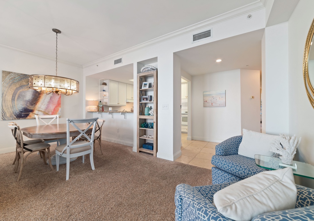 Inside, the condo exudes luxury and comfort, featuring a gourmet kitchen with granite countertops, custom cabinetry, and all the essentials for cooking up delicious meals. The spacious dining area offers seating for six, perfect for enjoying supper with a backdrop of stunning Gulf sunsets. The master suite boasts a plush king bed, a private bath with a jetted tub, walk-in shower, and double vanity. The second bedroom offers a queen bed, while the third includes a queen and a lofted full bunk, plus a sleeper sofa in the living room, allowing up to 9 guests to sleep comfortably. Additional amenities include a full-size washer and dryer and oversized cotton bath towels, ensuring your stay is as relaxing as it is luxurious. Book your stay today and experience paradise at Indigo!