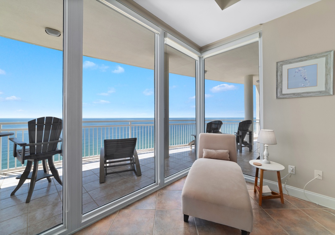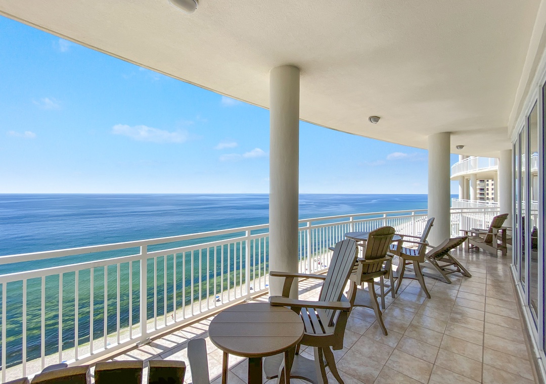 Experience nothing but luxury and opulence on your next vacation when you stay in our fabulous 3 bedroom unit at the La Playa Resort! With exclusive access to a generous stretch of private white quartz sand beachfront and the sparkling emerald-turquoise waters of the Gulf of Mexico, this lovely 12th floor property is sure to delight your entire group! This stunning 3 bedroom, 3.5 bath home offers every luxury imaginable, making it the perfect destination for a retreat that you’ll never forget. You’ll enjoy the oversized balcony and additional floor-to-ceiling windows affording picturesque vistas of Perdido Key’s immaculate beaches! The living area is the ultimate lounge space, boasting a plush sofa and loveseat, two cushioned chairs, a large flat screen HDTV and beachfront balcony access. Enjoy sensational views and picture-perfect scenery from the expansive covered terrace offering an outdoor dining table and additional loungers.