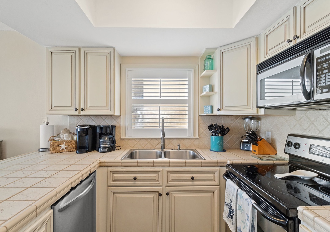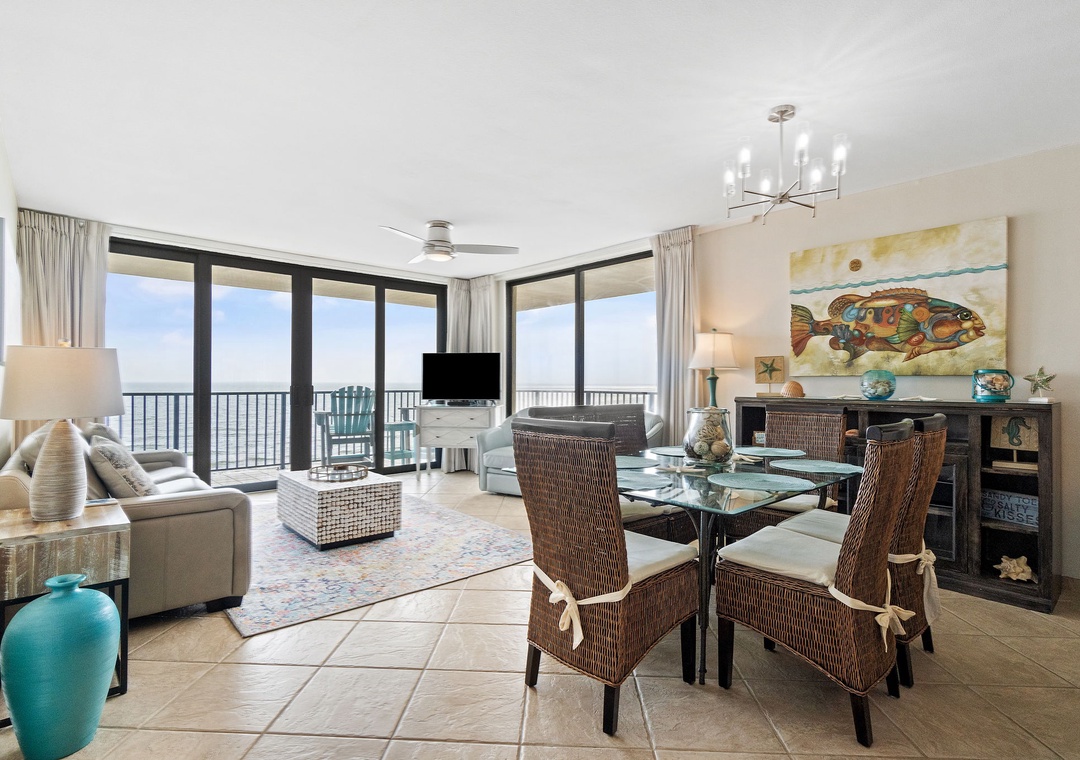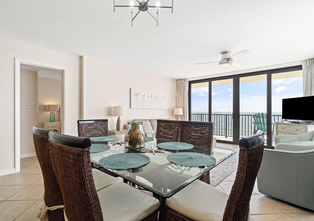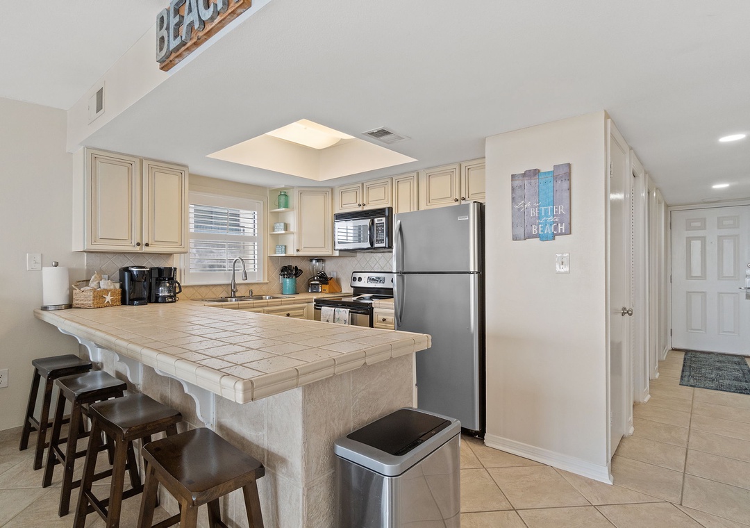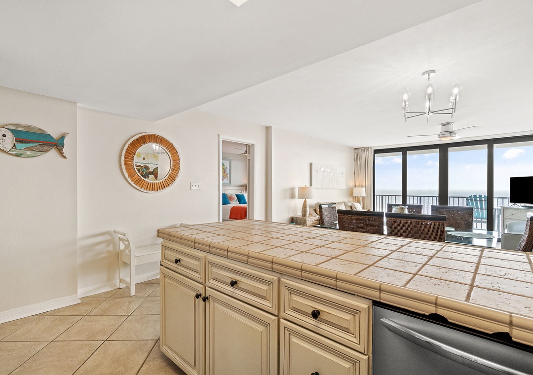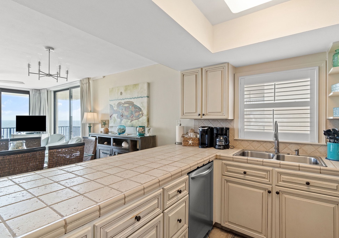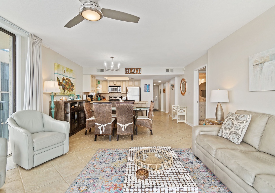 This unit is sure to exceed your expectations with a desirable open-concept layout, new furnishings, and coastal décor. Lounge with the family for movie night in the living area, complete with leather furniture, including a sofa, plus two additional chairs, and a large flat screen TV. The sliding glass doors open to your covered wrap-around terrace with plenty of seating to even enjoy a delicious dinner alfresco. The gourmet kitchen offers everything needed to inspire your inner-chef. The dining area offers a table with seating for 6 and additional seating for 4 at the breakfast bar, allowing the entire family to share a meal whilst spend quality time together.