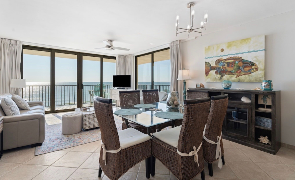 Amazing on the beach condo located on the 6th floor. The condo is a corner unit with an amazing view from the wrap around balcony. We absolutely loved breakfast on the large balcony . The beach water here is clear and the sand is white and soft. The condo has a new leather couch and leather chairs making it perfect for our party of 3 couples. Condo also has a large dining table that easily seats 8. I’m a clean freak and I could tell the condo was freshly painted and the ceramic tile floor was spotless. Condo does not have carpet floors which is a blessing. This wonderful beach front condo has 3 bedrooms and 3 full bathrooms which worked out perfect for our 3 couples. This is perfect for a large family who love their privacy. The kitchen was spacious and open so those cooking could always be part of the group with an amazing view of the beach. The kitchen was fully equipped with everything we needed to make those evening meals. I especially loved the high quality blender for making blue margaritas!! There are stools at the kitchen counter, if you want to eat casually or sit and visit with friends or family. This wonderful condo was so clean and relaxing. That I would return in a heart beat. Orange beach is a perfect beach destination for couples and families. You will just love the beach here. The front door has a key pad so we didn’t have to carry a key or a slide card. Really makes life simple. We walked to the Flor-Bama bar which was slightly less than a mile walk. We played bingo on a rainy day and had a blast. I highly recommend Lei Lani 607 T and consider this condo my go to unit when taking a beach trip. Trust me, you will love the view from the wrap around balcony. We hated to leave and can’t wait to come back to Lei Lani 607.