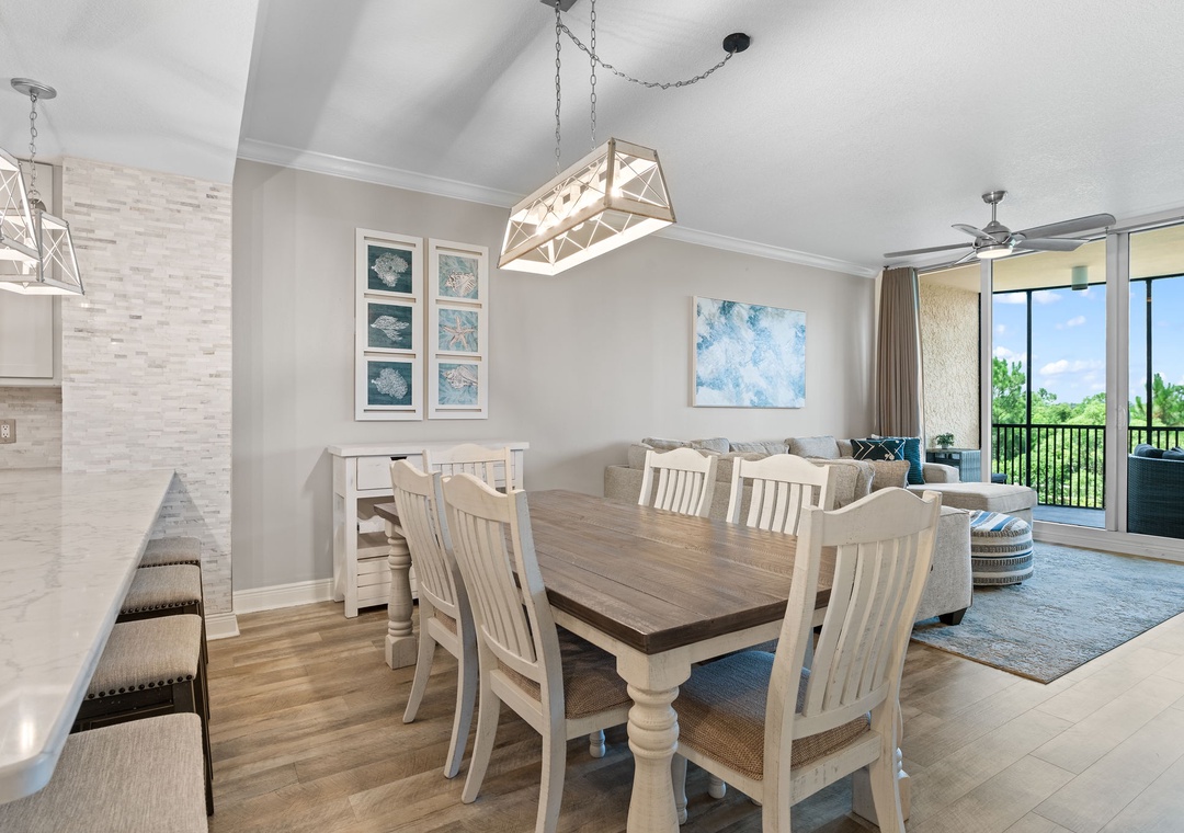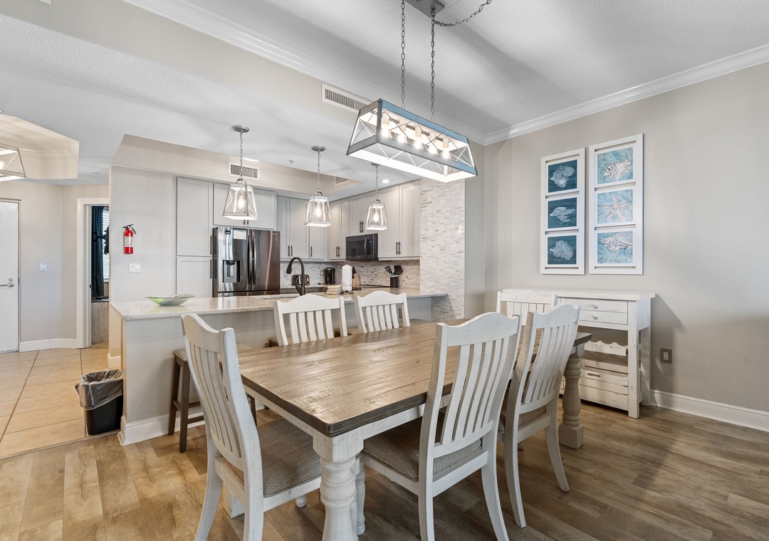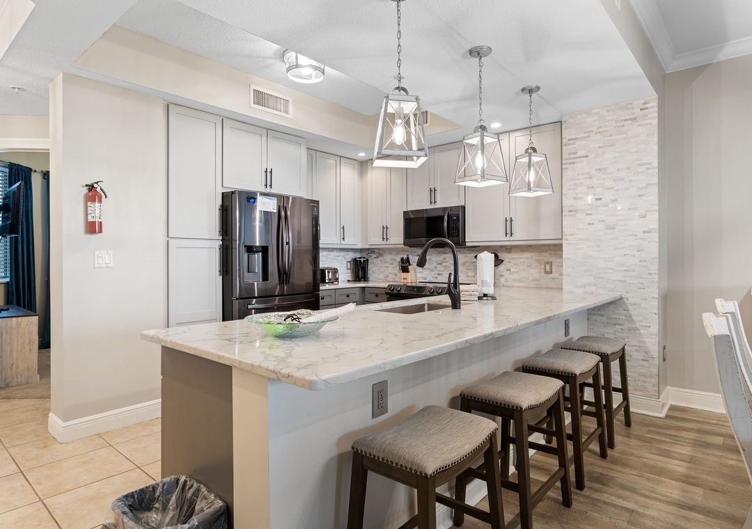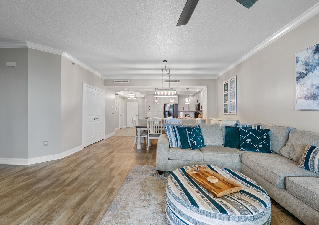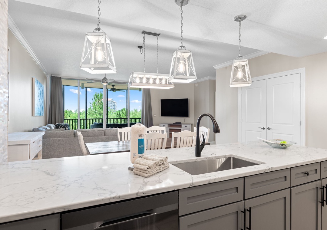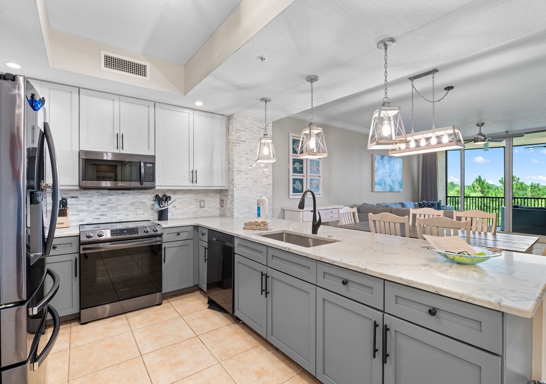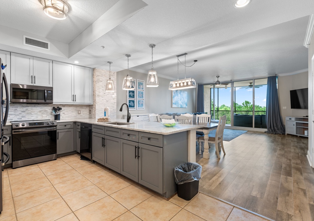 This fabulous unit features a spacious open-concept layout. Lounge with the family for movie night in the living area, complete with comfortable furnishings, a flat screen TV, and balcony access! The sliding glass doors open to your screened in patio, where you can sit and enjoy the beauty and splendor of the Gulf Coast and the picturesque vistas of the bay and golf course without leaving the comfort of your abode. The balcony even has an electric heater making it an outdoor oasis year round! With plenty of seating you can even enjoy a delicious dinner alfresco. The gourmet kitchen offers everything needed to inspire your inner chef, featuring top of the line appliances, custom cabinetry, and granite countertops, plus all the small appliances, utensils and cookware needed to prepare a culinary masterpiece! The dining area offers seating for the whole family, with additional seating at the breakfast bar.