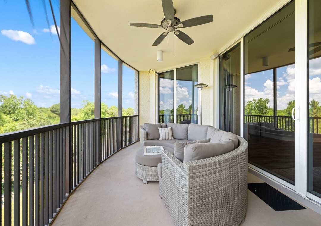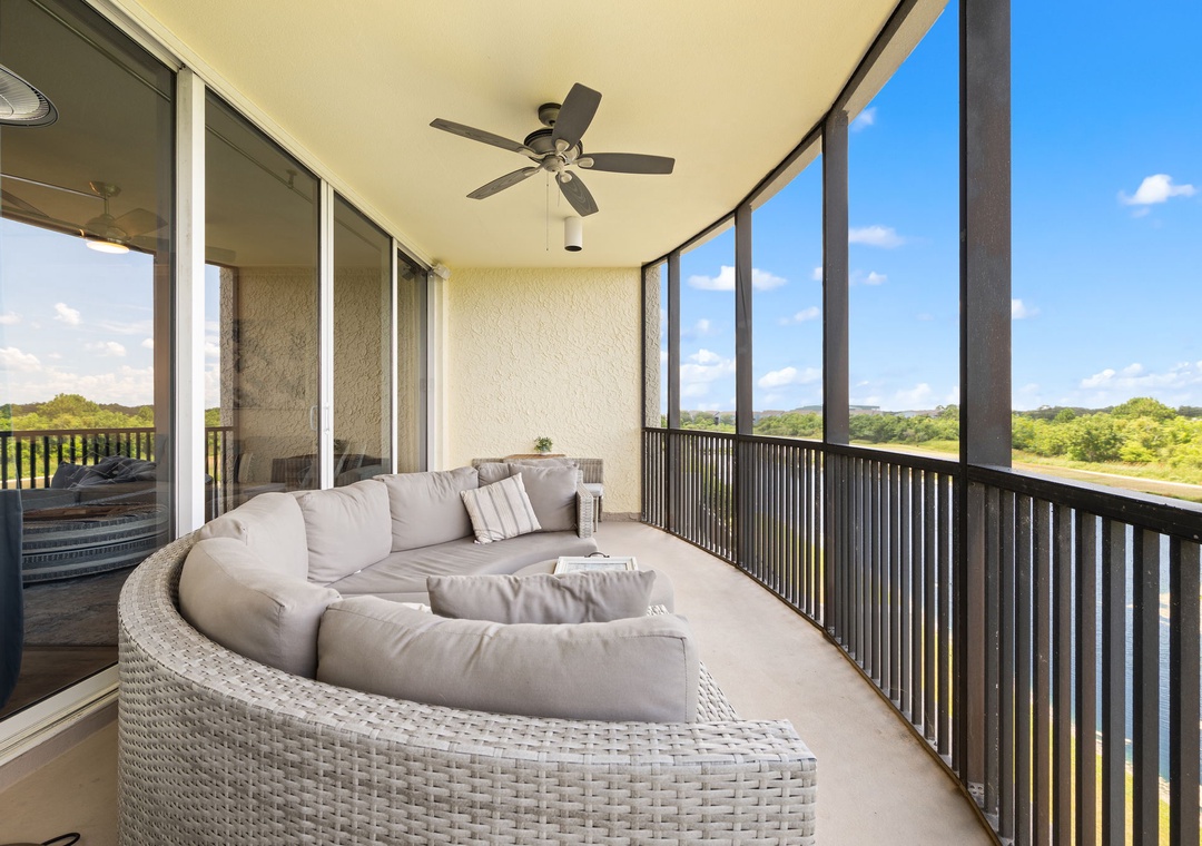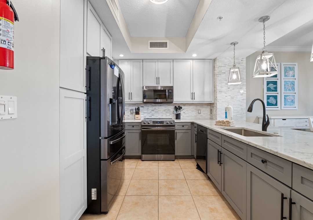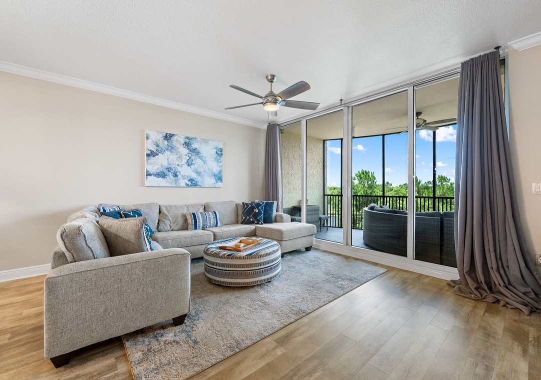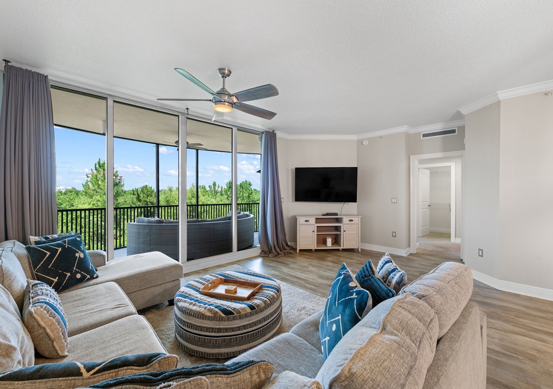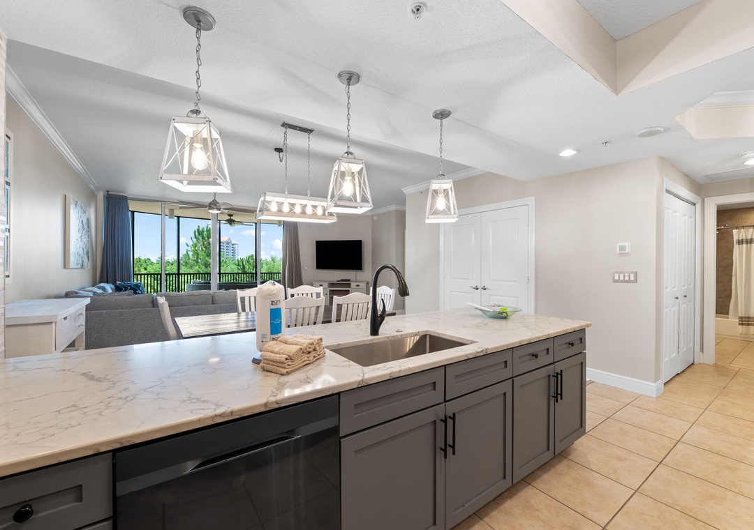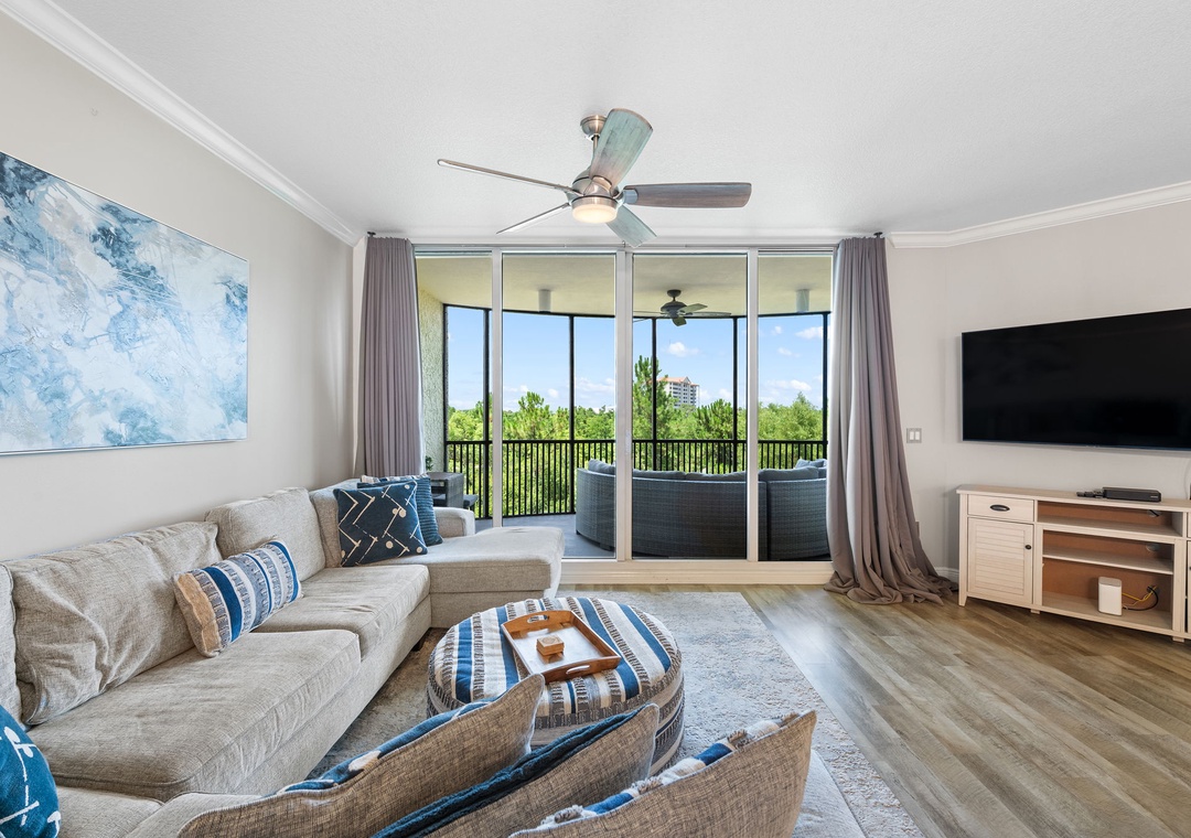 This fabulous unit features a spacious open-concept layout. Lounge with the family for movie night in the living area, complete with comfortable furnishings, a flat screen TV, and balcony access! The sliding glass doors open to your screened in patio, where you can sit and enjoy the beauty and splendor of the Gulf Coast and the picturesque vistas of the bay and golf course without leaving the comfort of your abode. The balcony even has an electric heater making it an outdoor oasis year round! With plenty of seating you can even enjoy a delicious dinner alfresco. The gourmet kitchen offers everything needed to inspire your inner chef, featuring top of the line appliances, custom cabinetry, and granite countertops, plus all the small appliances, utensils and cookware needed to prepare a culinary masterpiece! The dining area offers seating for the whole family, with additional seating at the breakfast bar.