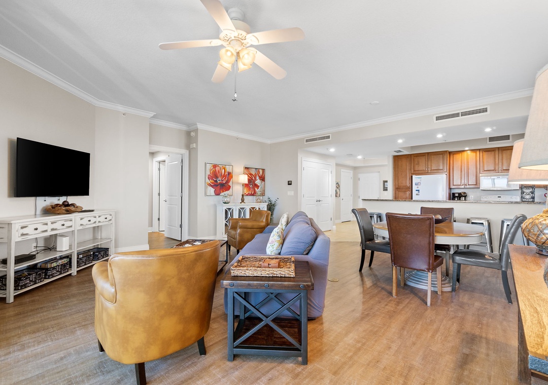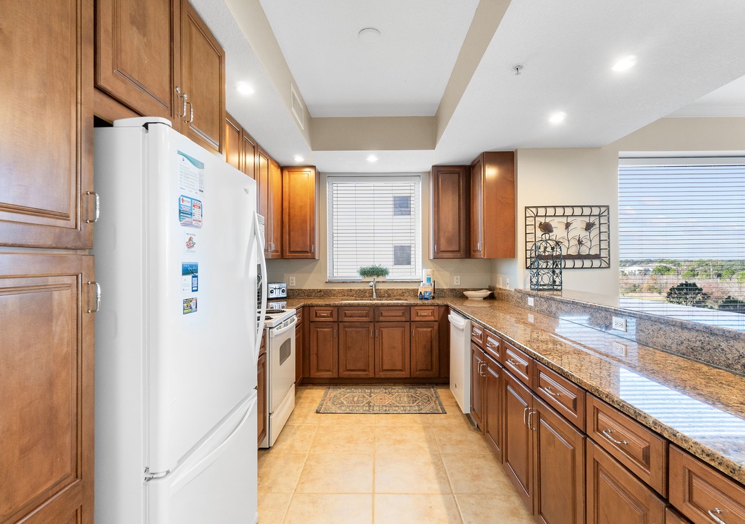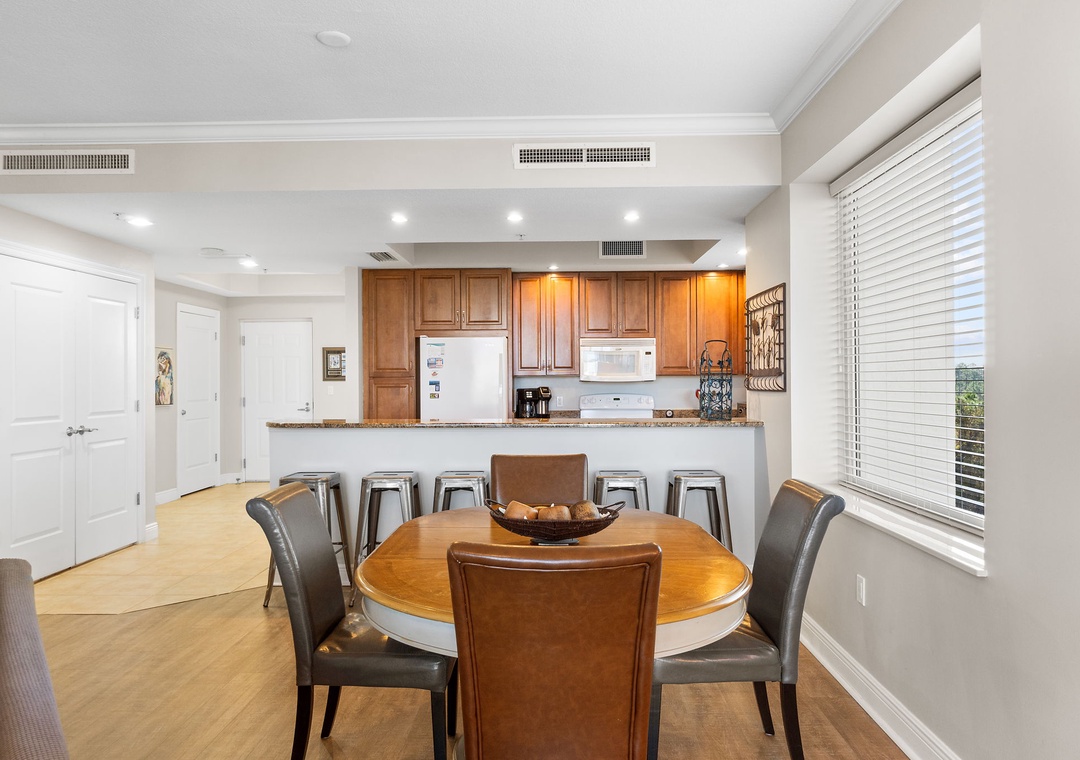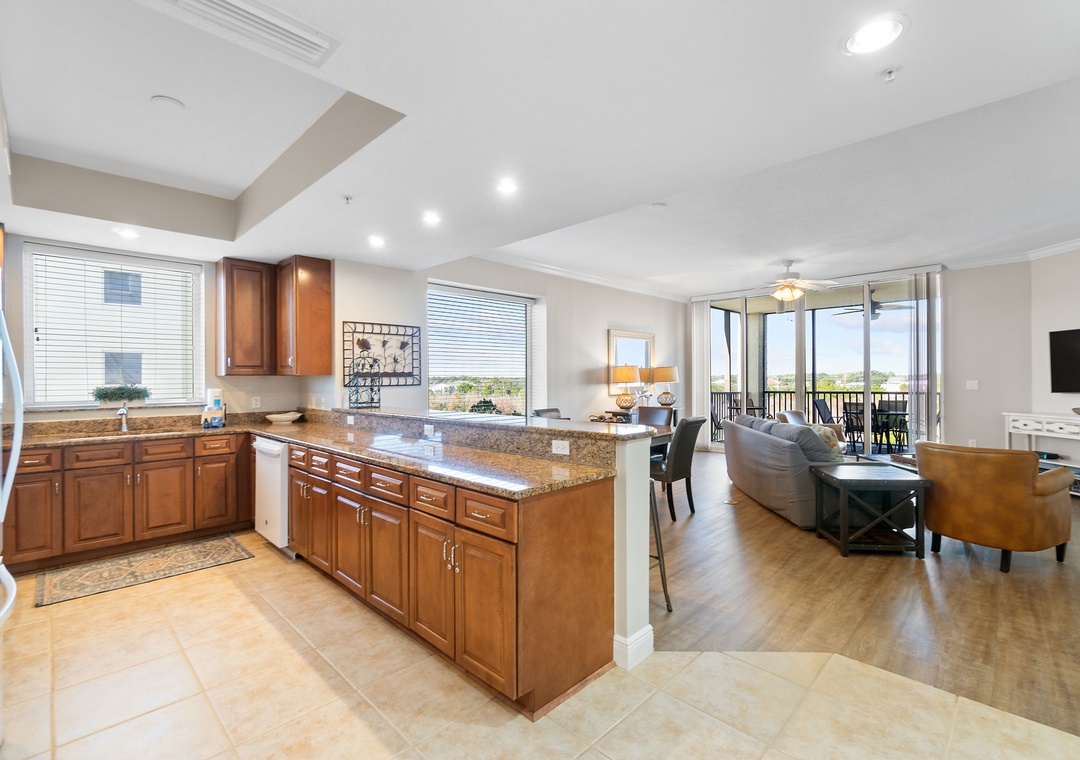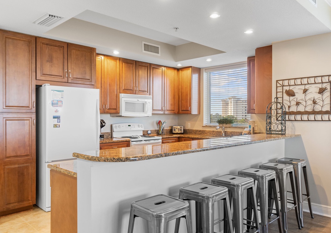 This chic 3 bedroom unit features a living area that is the perfect space for lounging and spending quality downtime complete with balcony access! The floor-to-ceiling sliding glass doors open to your screened-in patio. The gourmet kitchen offers everything needed to inspire your inner-chef, featuring top of the line appliances and granite countertops, plus all the small appliances, utensils and cookware needed to prepare a culinary masterpiece! The dining area offers seating for the whole family, with tons of additional seating at the breakfast bar.