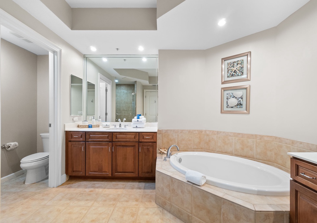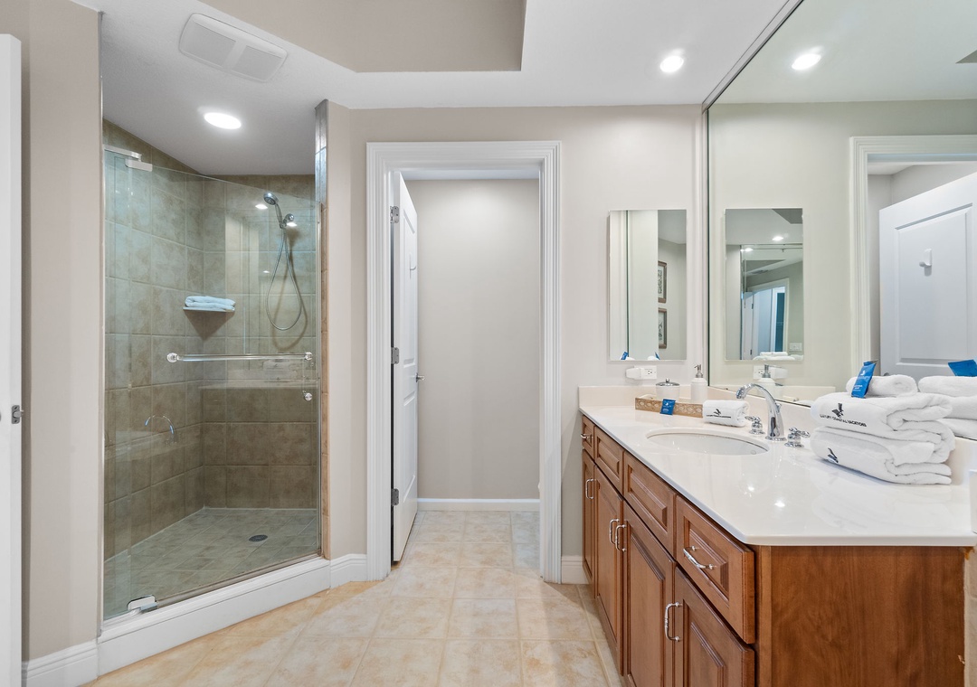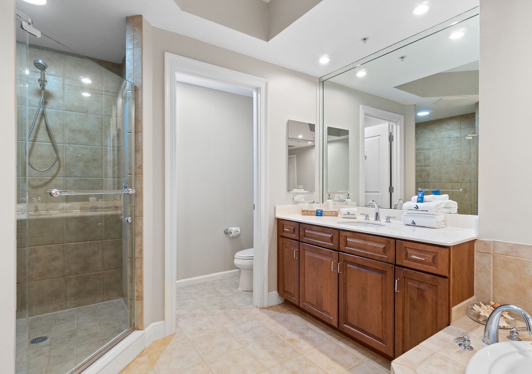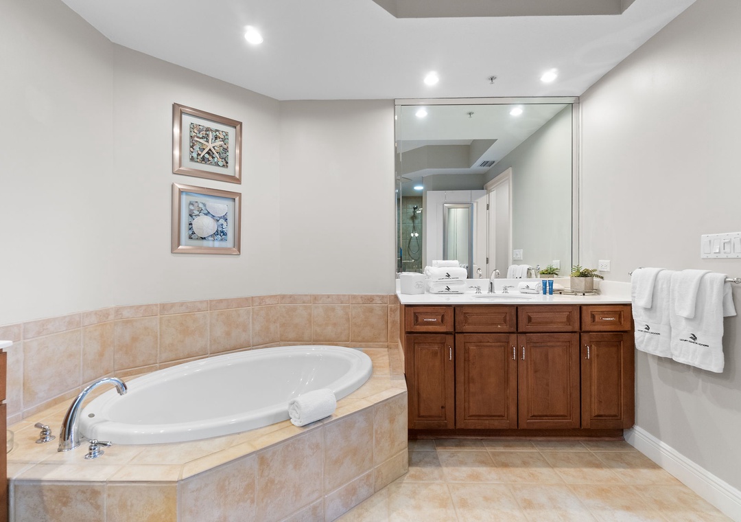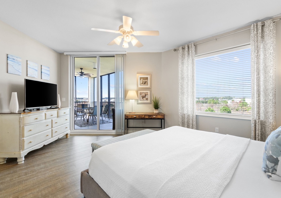 The master suite will allow you to indulge in some much needed rest hosting a king bed with luxurious linens and a premium mattress, LCD television, balcony access and an elegant attached master bath. You can immerse yourself in the jetted Whirlpool tub after a long day of play, or refresh in the separate walk-in shower. The second bedroom features a queen bed with a quality mattress, soft bedding and an LCD television. The third bedroom offers two twin beds, and there is also sleeper sofa in the living room, comfortably sleeping 8!