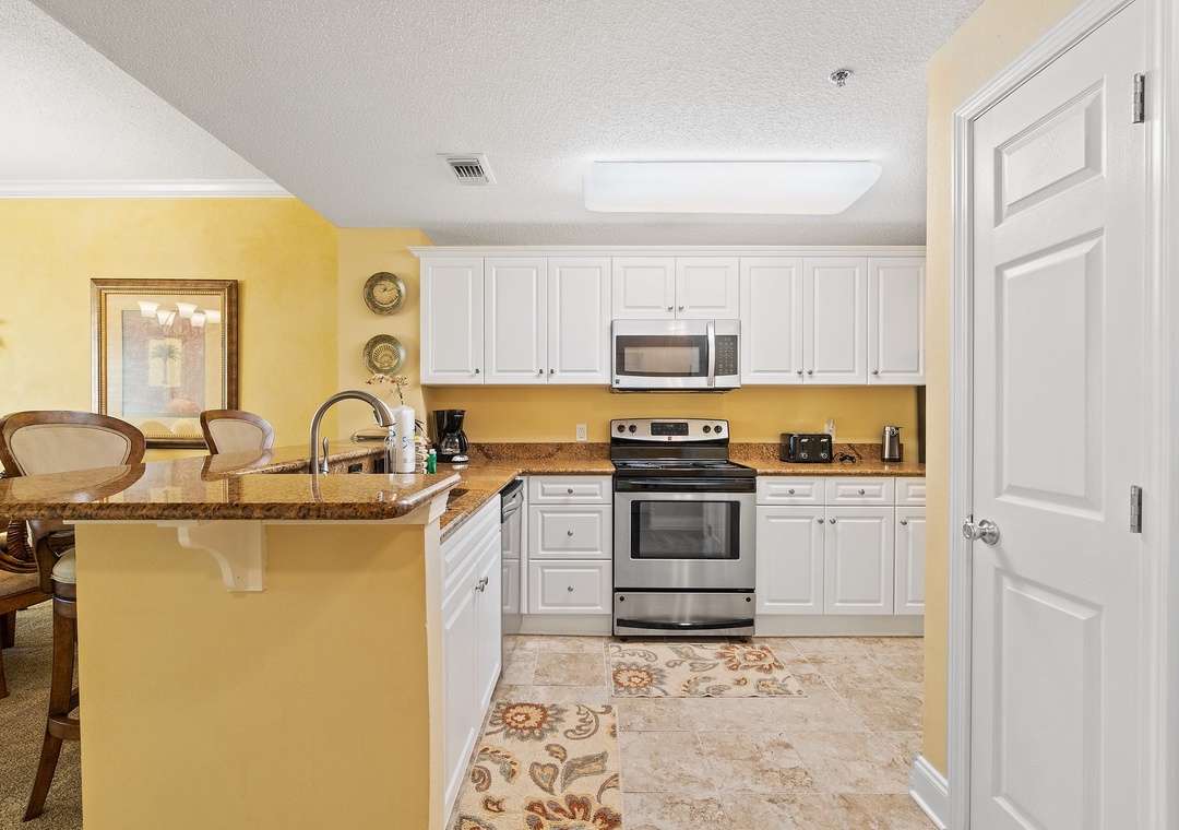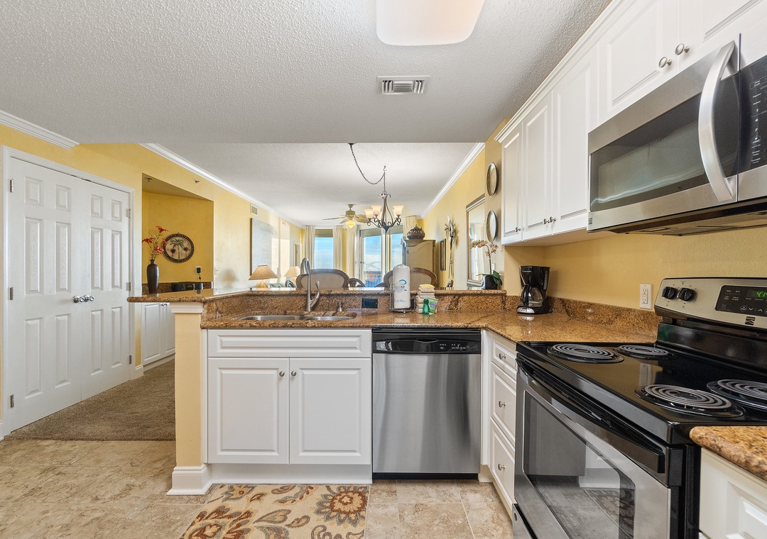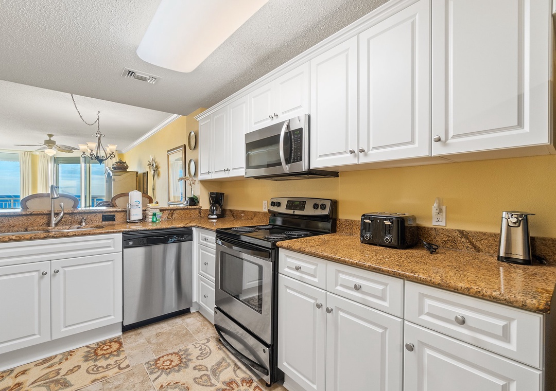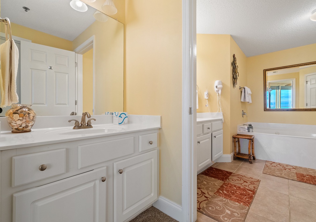 Retire after a long day of recreation to one of 2 luxuriously appointed bedrooms and catch some quality z's! With each offering premium mattress sets, high thread-count linens, posh bedding and flat screen TVs, you're sure to enjoy quality rest and relaxation during your much-deserved beach getaway! The master offers a king bed, the second includes a King bed, and the sofa in the living room pulls out for a queen sleeper sofa, which allows 6 guests to sleep comfortably! Pamper yourself after a day on the beach in the master's glamour bath, complete with a 2-person jetted tub and large separate walk-in shower, plenty of counter and cabinet space and plush oversized 100% cotton bath towel sets.