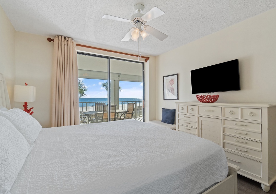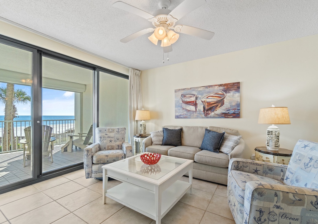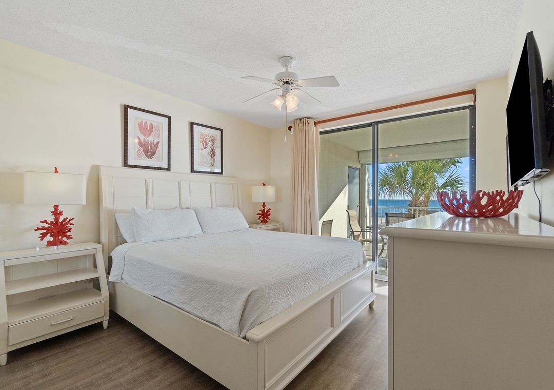 This 3-bedroom, 2nd-floor unit boasts an open-concept layout, updated electronics, and stylish decor. The living area with a large flat-screen TV opens to an expansive covered terrace with Gulf of Mexico views. The fully equipped kitchen features granite countertops, and the dining area offers ample seating. The master suite has a king bed and attached bath, alongside an additional king and two queens in other bedrooms. Unit amenities include a full-size washer and dryer. Enjoy the generous private beachfront with white quartz sand and emerald turquoise waters for a memorable experience!