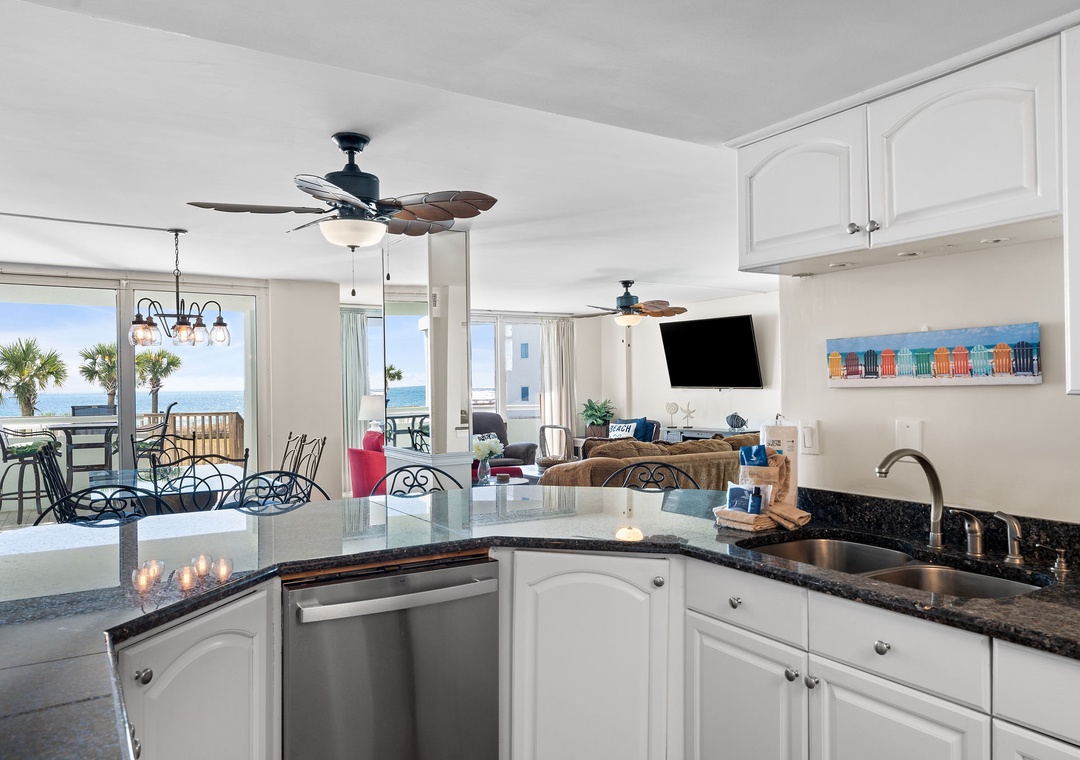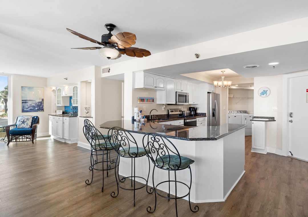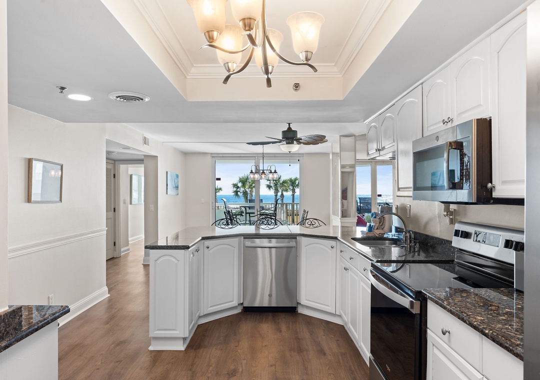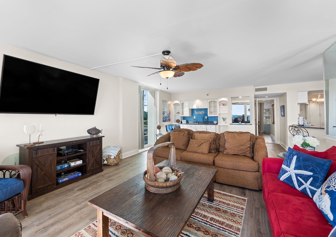 Inside, the master suite boasts a king bed with luxurious linens, a premium mattress, and an attached bath. The second bedroom also offers a king bed with its own en-suite bathroom, while the third bedroom includes a queen bed and private bathroom access. The living room features a queen sleeper sofa as well as an additional oversized sofa that can comfortably sleep extra guests. The open-concept floor plan provides plenty of space for large families or multiple families traveling together.