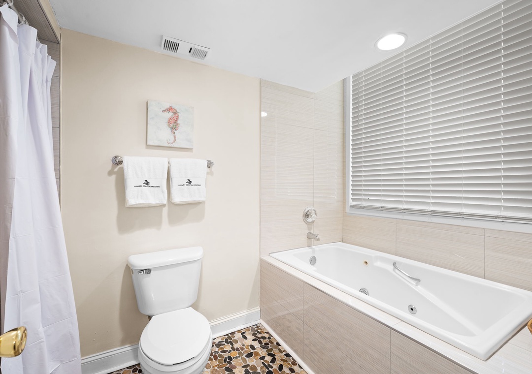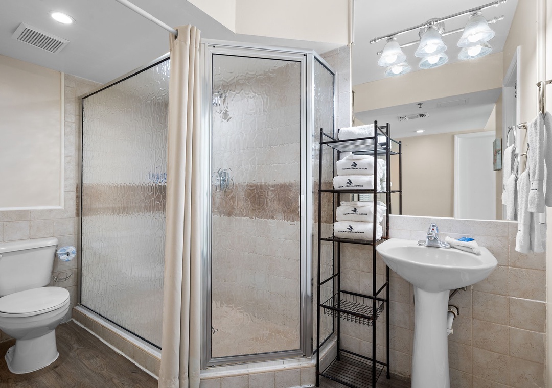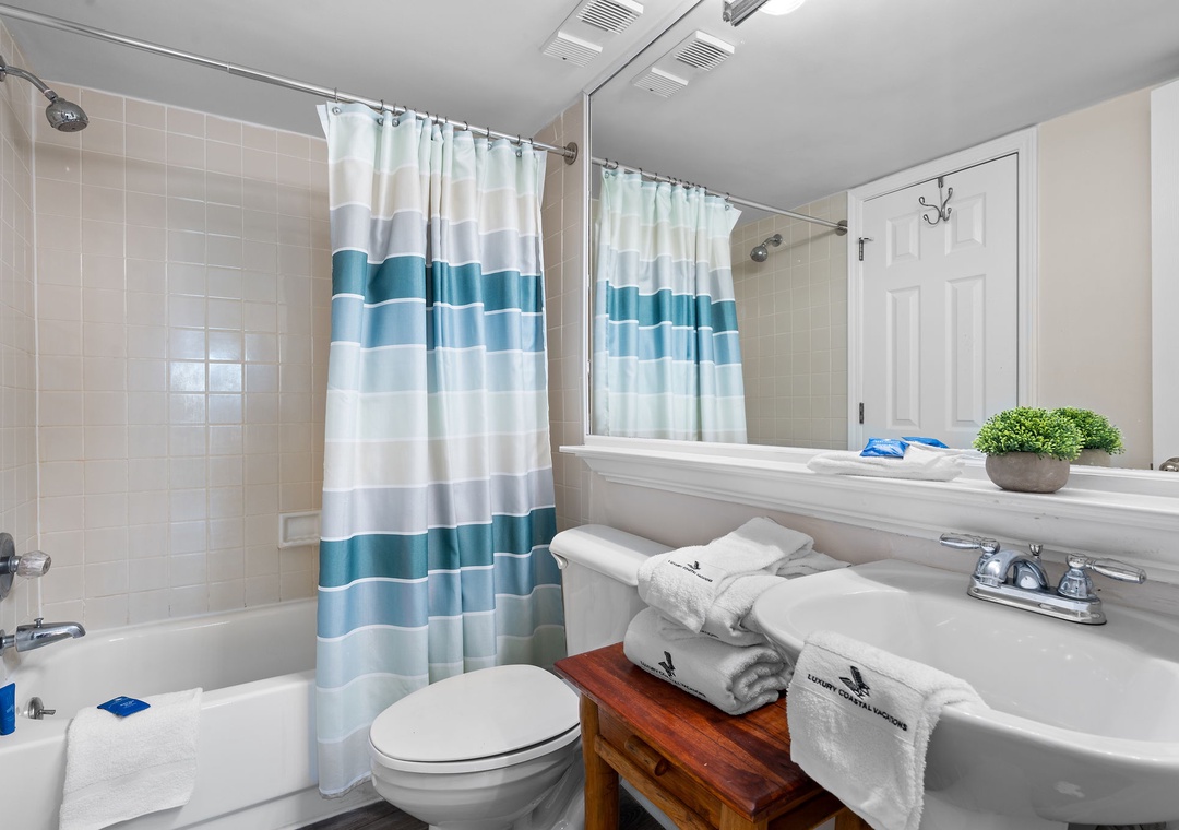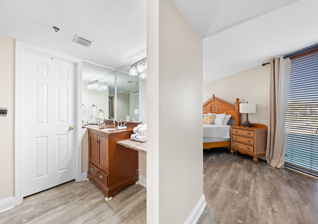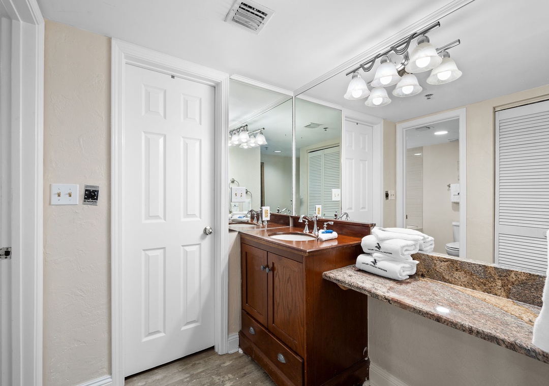 Inside, the master suite boasts a king bed with luxurious linens, a premium mattress, and an attached bath. The second bedroom also offers a king bed with its own en-suite bathroom, while the third bedroom includes a queen bed and private bathroom access. The living room features a queen sleeper sofa as well as an additional oversized sofa that can comfortably sleep extra guests. The open-concept floor plan provides plenty of space for large families or multiple families traveling together.