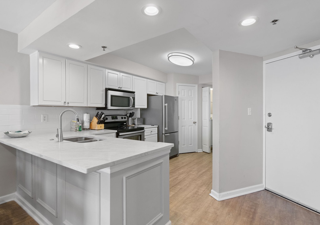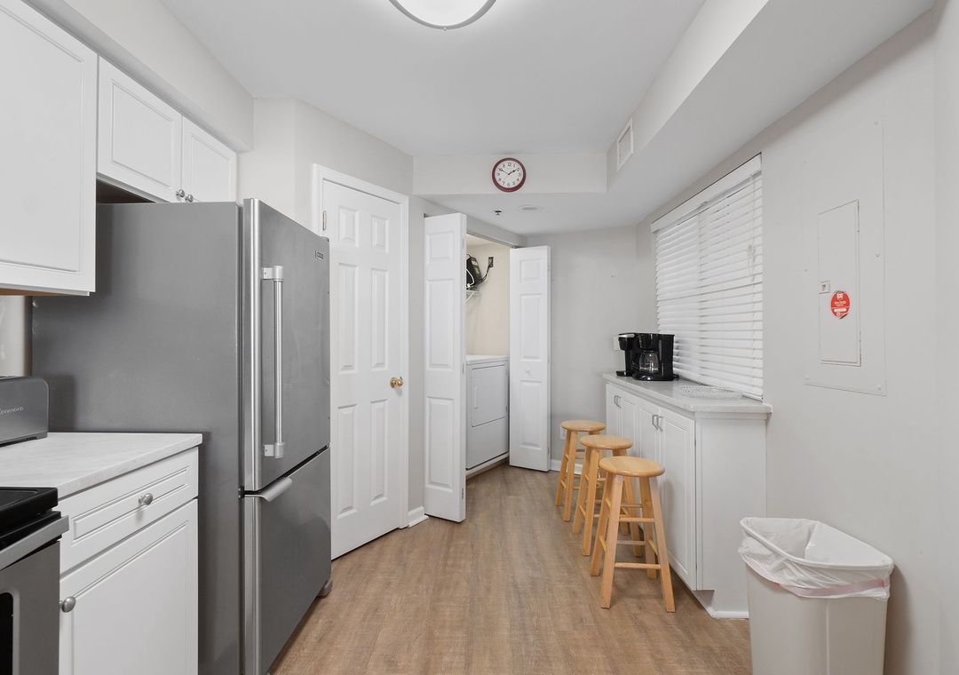 The kitchen is well-stocked with everything you could need to prepare a 5-star cuisine, including a stainless double-sided sink, updated appliances, baker’s rack, custom cabinetry and an eat-in breakfast bar. The dining area offers a high-top table with seating for 6.