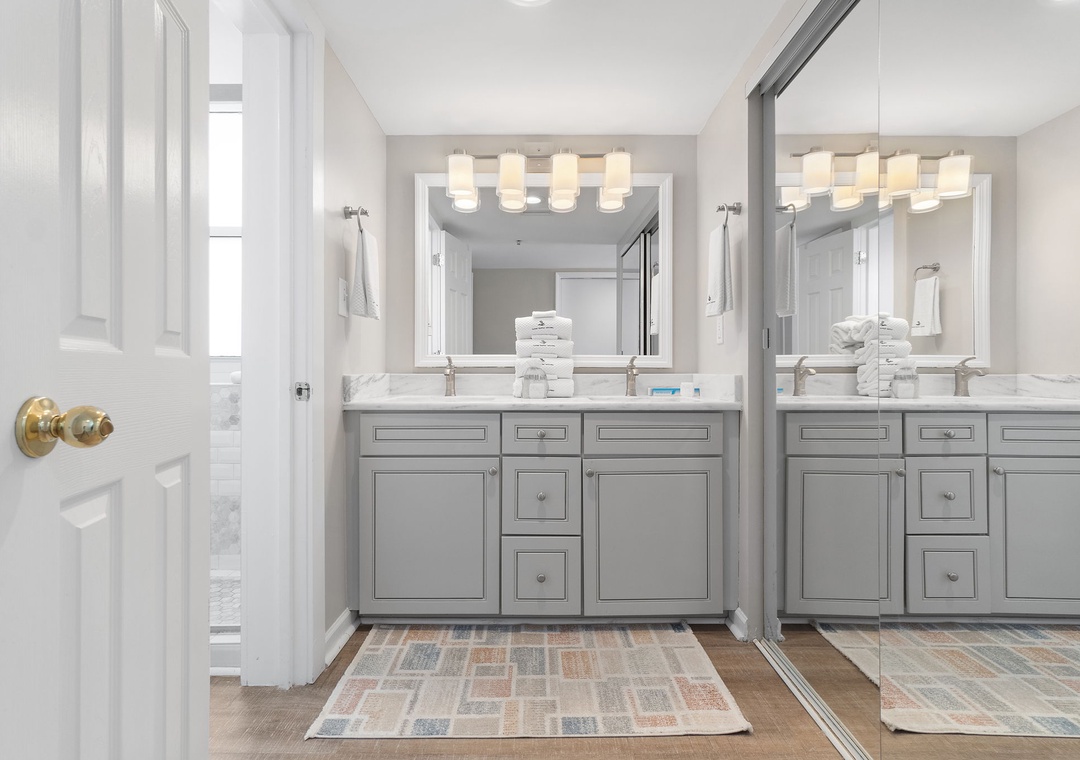The master suite affords every detail to ensure complete rest and relaxation, offering a plush king bed with designer satin bedding and high thread-count linens, wall-mounted flat-screen TV, chic modern furnishings and floor-to-ceiling windows with Gulf views! The master bath includes his and her vanities and a separate washroom with a door for privacy. The second bedroom is equally spacious, featuring a double bed with premium mattress set and deluxe linens, wall-mounted flat screen, attached bath, and another expansive window overlooking the pool and beach! The living room sofa can be converted into a sleeper for additional space, accommodating up to 6 comfortably!