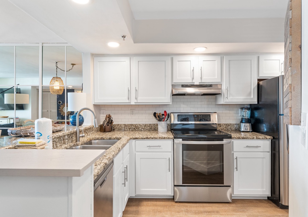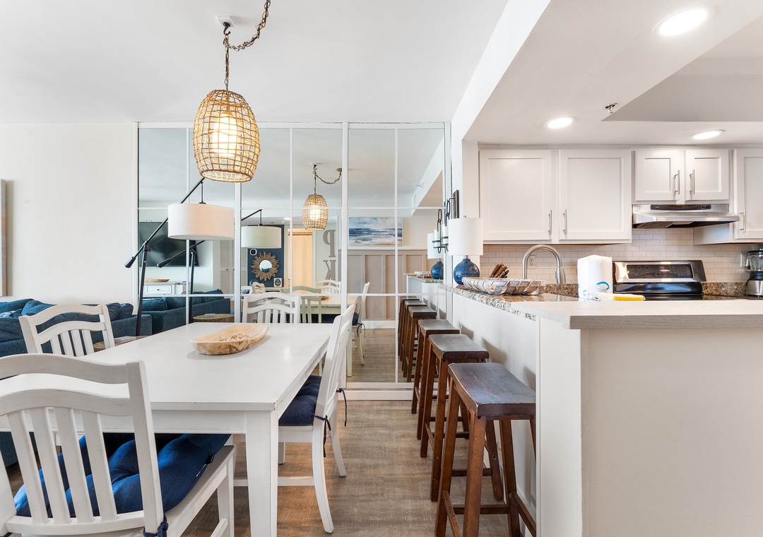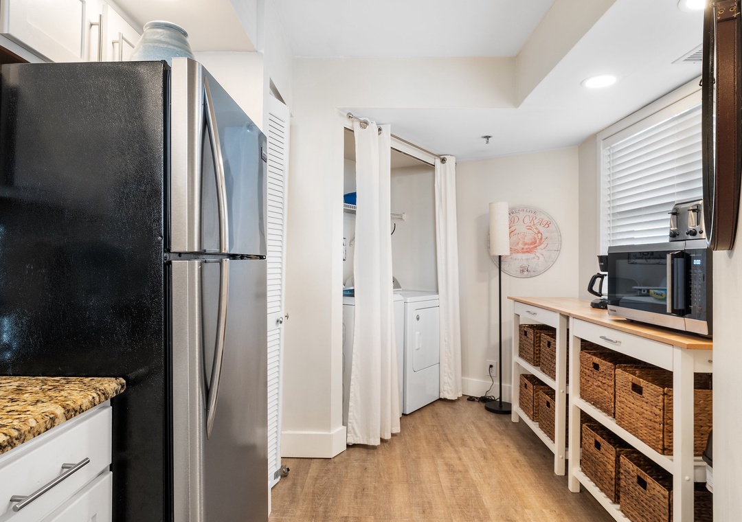 The updated kitchen is fully equipped with everything you could need to prepare 5-star cuisine, including granite countertops, a stainless double-sided sink, glass top range, and updated appliances. There is also a full size washer and dryer for your convenience. The dining area offers a butterfly leaf table with seating for 4 that can be expanded to accommodate 6.