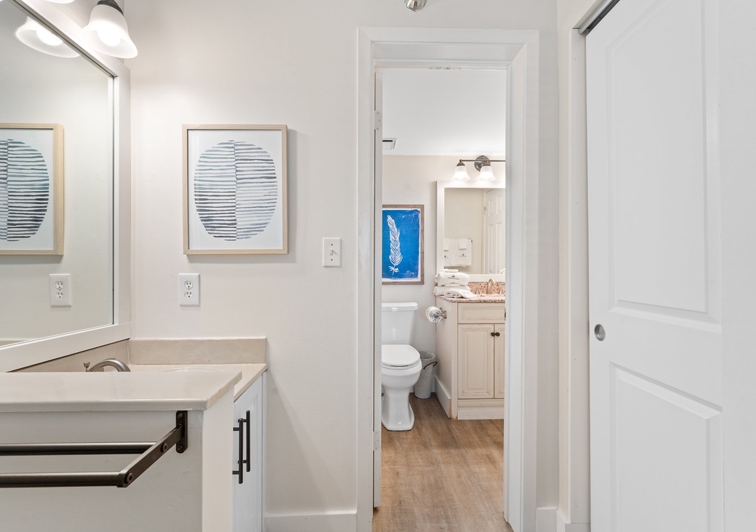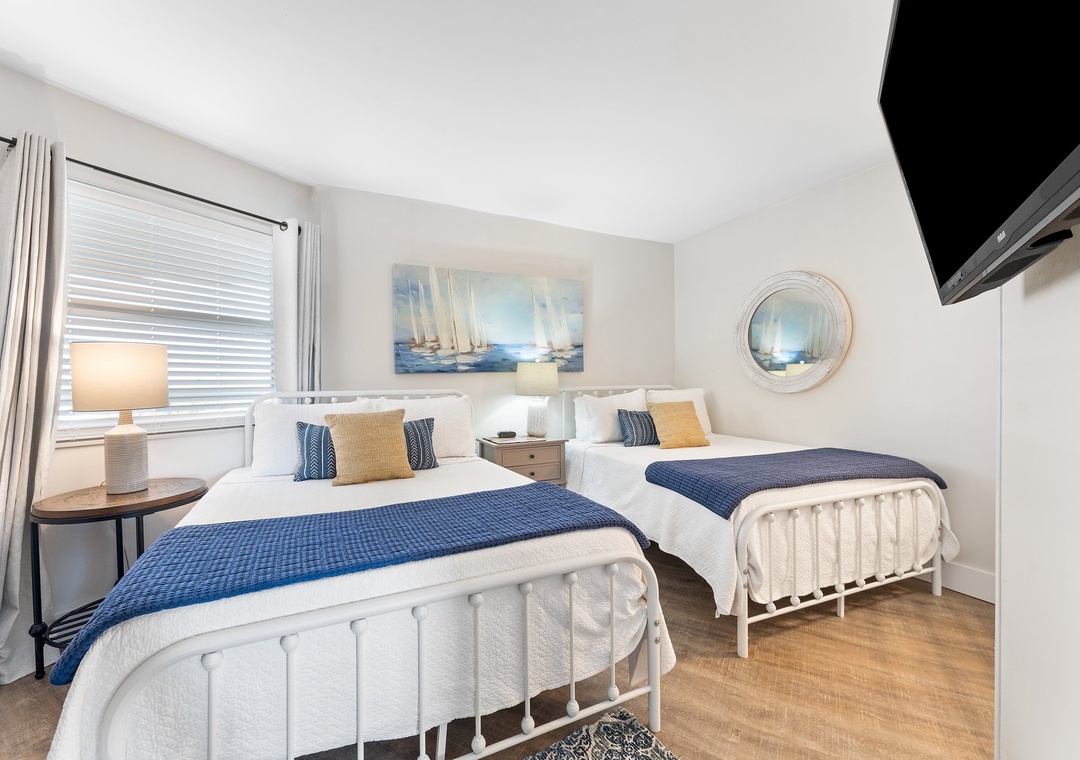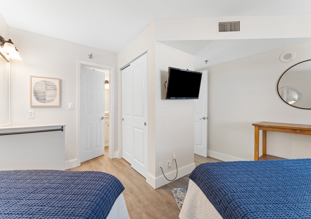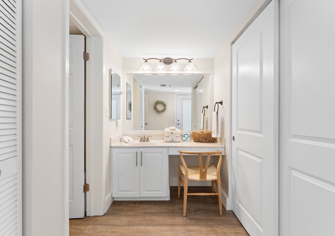 The master suite has floor to ceiling windows with amazing gulf views, a plush king bed with high thread-count linens, two bedside tables with lamps, wall-mounted 40 inch LED HDTV, DVD player, black-out curtains, and direct balcony access. The master bath includes a shower/ tub and separate sink with a door for privacy. The second bedroom features two full beds with deluxe linens, wall-mounted 32 inch flat screen HDTV, DVD player, and a private sink and vanity, in addition to direct access to the hall bath. The condo also includes a collection of DVDs, books, games and puzzles