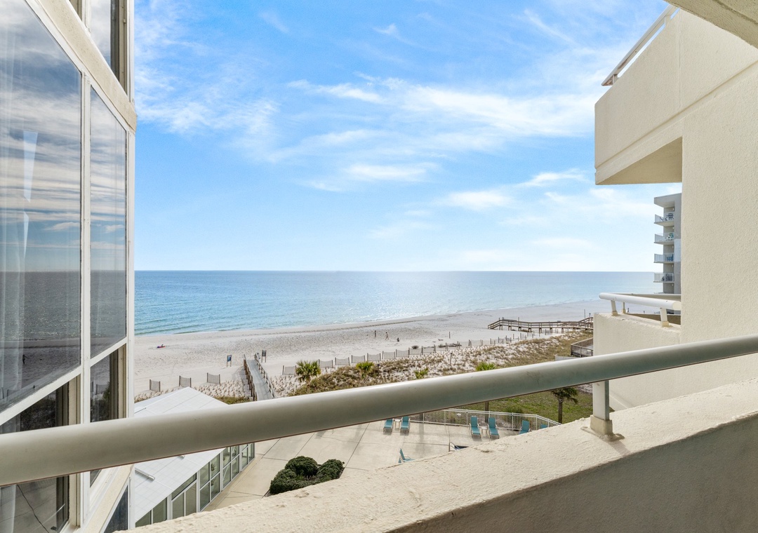 Relax, unwind and enjoy Florida's best kept secret when you stay directly on beautiful Perdido Key Beach in this fabulous 5th floor, 2 bedroom 2 bath unit at Perdido Sun! Situated on the quaint and picturesque east end of the Key, this condo combines luxury, comfort and recreation, with over 1100 sq. ft. of open concept layout and tile floors in all rooms. Enjoy spectacular front row views of the sand and sparkling waters from your private beach front balcony, spacious living area or master bedroom! The living area boasts a plush sleeper sofa with swivel chair, wall mounted Smart HDTV, Blu-Ray DVD player, telephone with free long distance and Wi-Fi, and beachfront balcony access with incredible views!