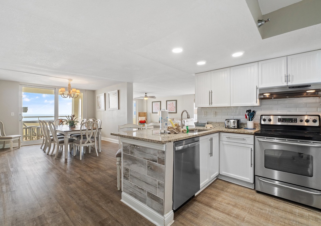 The fully equipped kitchen offers upgraded stainless-steel appliances, a double sink, plenty of counter space and a wet bar area! The dining area is adjacent to the living room and offers seating for 6, with additional seating for two at the breakfast bar. The master suite is equally impressive, boasting a king bed with quality mattress, beautiful furnishings and large windows cascading with natural light, and an ensuite bath with a jetted tub and separate walk-in shower! The second bedroom hosts a queen bed with luxurious linens and an attached bath, and the third bedroom offers two full beds, a LCD television and an attached bath as well.