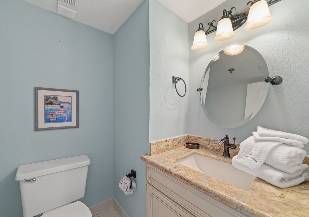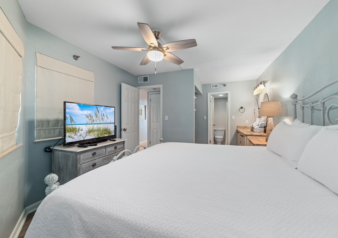 The impressive master suite boasts a king bed with luxurious linens and a premium mattress, a large television and attached bath. The living room sofa can be converted into a queen sleeper, affording comfortable accommodations for up to 4 throughout! There is also an extra half bath for guests!