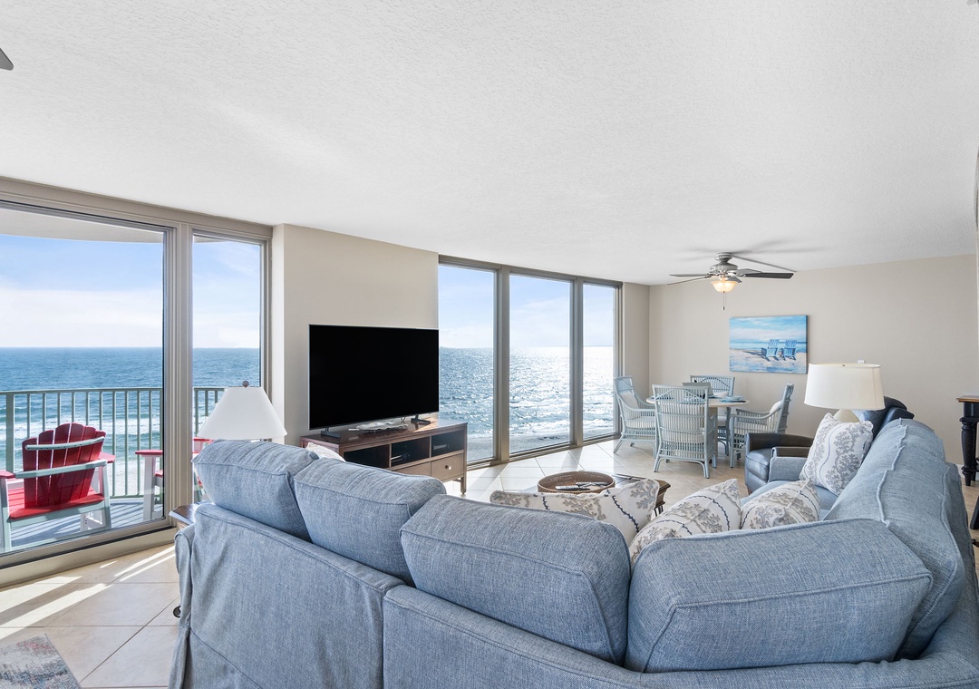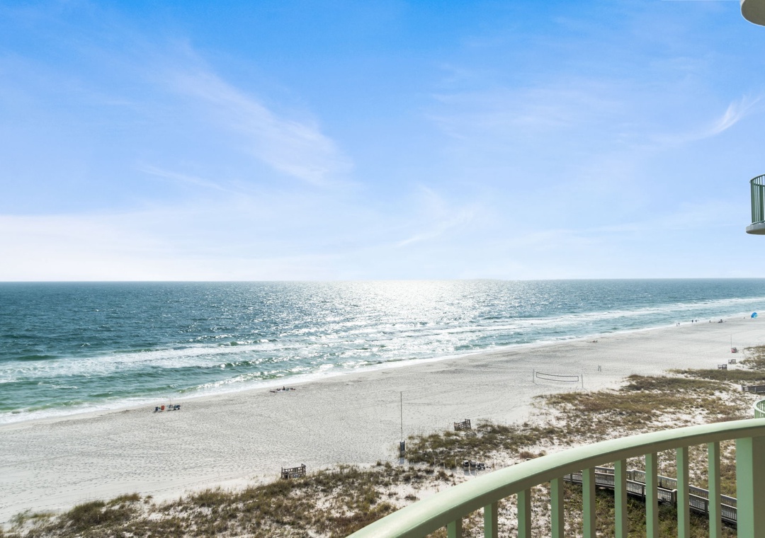 The view through the living room floor-to-ceiling windows is fantastic. It was the reason we booked the condo. We have never stayed in Perdido Key. We usually stay on Pensacola or Navarre Beach, but when we saw the view this condo provided and the price, we felt we had to go there this year. We are an older couple who spend more time looking at the beach then we do on the beach, so views are more important to us than access. However, the access is a simple process and takes only one or two minutes from the time you step out of the condo and step onto the beach. We stayed here in early November and rarely did we wait for the elevator. Only once or twice did we ride the elevator with another party during the week we were there. The elevator door is less than three feet from the condo front door, but no one ever got on or off the eighth floor with us. The parking lot is probably ten yards from the elevator door, so we had very quick access to our car. The amount of space is incredible. The living room is huge, at least compared to our one at home. The kitchen is roomy and has the same views as the living room. The MBR is big enough and has the same floor-to-ceiling windows that the living room has. The balcony was comfortable, but not big. The washer and dryer came in real handy. We would stay in this condo again.- Reviewed On: 2/19/2021