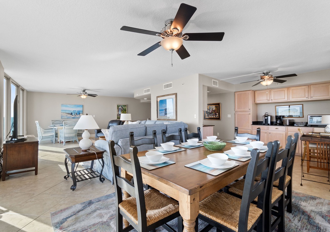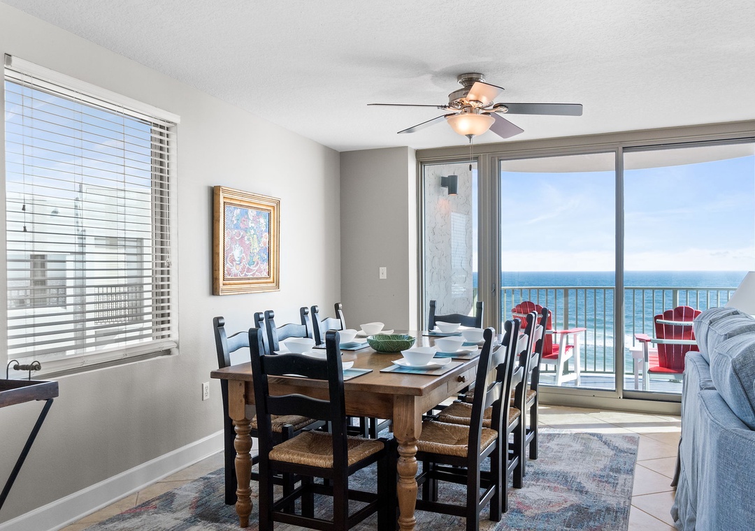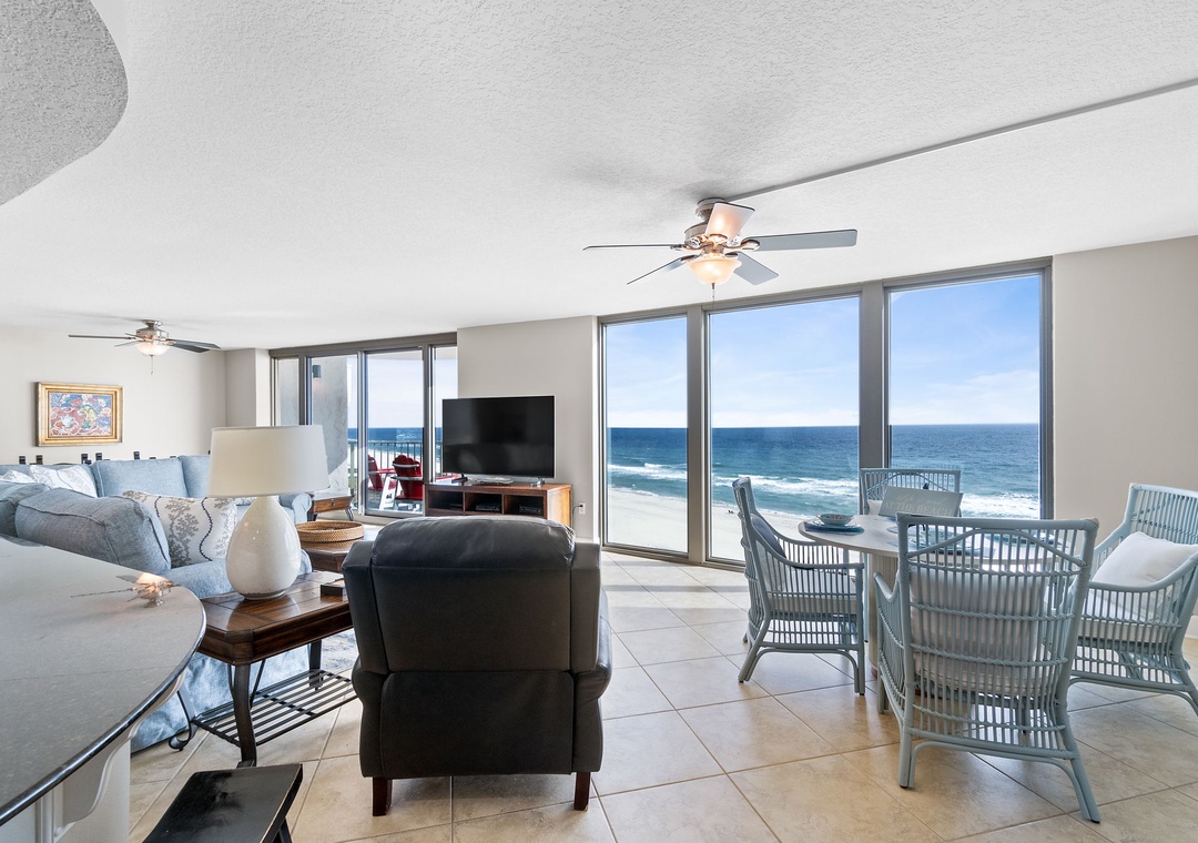 Experience paradise in this stunning 3-bedroom, 3-bath corner unit on the 8th floor of Perdido Towers in Perdido Key, Florida. This exclusive, low-density resort offers just 33 units, allowing you to enjoy the tranquility of uncrowded beaches and serene surroundings. Situated along a pristine stretch of the Gulf Coast, Perdido Towers combines luxury and privacy with upscale amenities you'll love. From the moment you step into the unit via your private elevator entrance, you'll be greeted by floor-to-ceiling windows that showcase breathtaking, unobstructed views of the Gulf’s shimmering emerald waters and white sandy beaches. The spacious living area, with new designer furnishings and a sleeper sofa, offers ample seating for the whole family, while the dining space accommodates up to 12 guests.