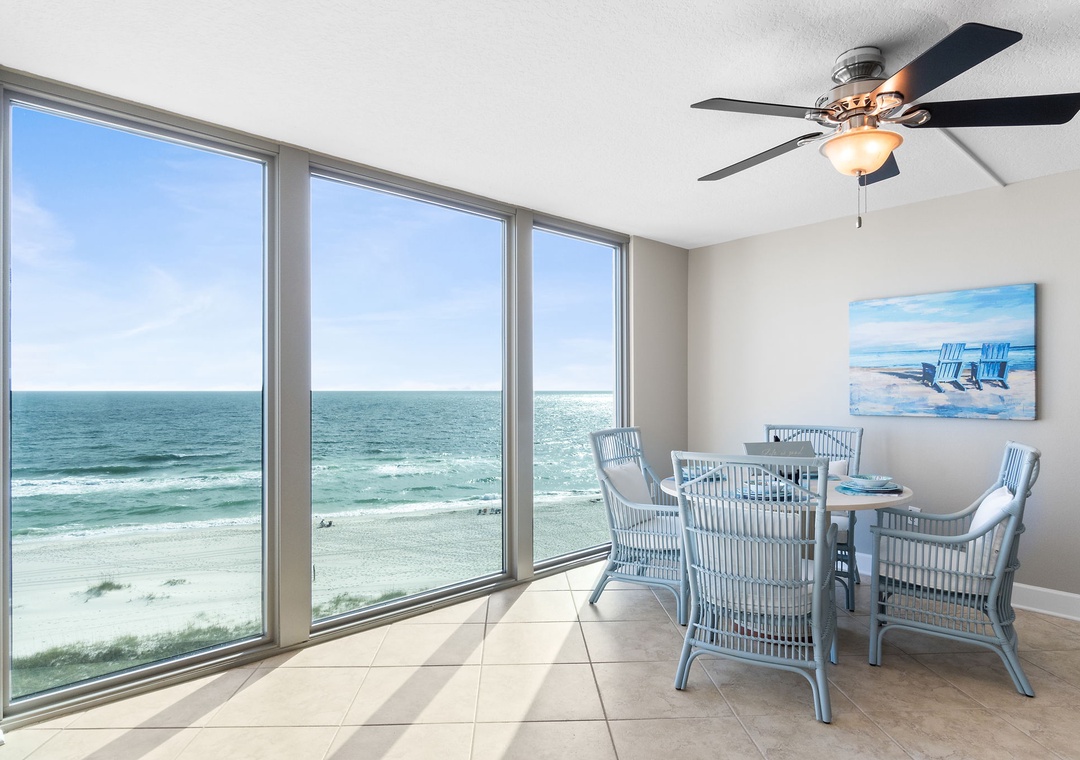 The view through the living room floor-to-ceiling windows is fantastic. It was the reason we booked the condo. We have never stayed in Perdido Key. We usually stay on Pensacola or Navarre Beach, but when we saw the view this condo provided and the price, we felt we had to go there this year. We are an older couple who spend more time looking at the beach then we do on the beach, so views are more important to us than access. However, the access is a simple process and takes only one or two minutes from the time you step out of the condo and step onto the beach. We stayed here in early November and rarely did we wait for the elevator. Only once or twice did we ride the elevator with another party during the week we were there. The elevator door is less than three feet from the condo front door, but no one ever got on or off the eighth floor with us. The parking lot is probably ten yards from the elevator door, so we had very quick access to our car. The amount of space is incredible. The living room is huge, at least compared to our one at home. The kitchen is roomy and has the same views as the living room. The MBR is big enough and has the same floor-to-ceiling windows that the living room has. The balcony was comfortable, but not big. The washer and dryer came in real handy. We would stay in this condo again.- Reviewed On: 11/29/2020
