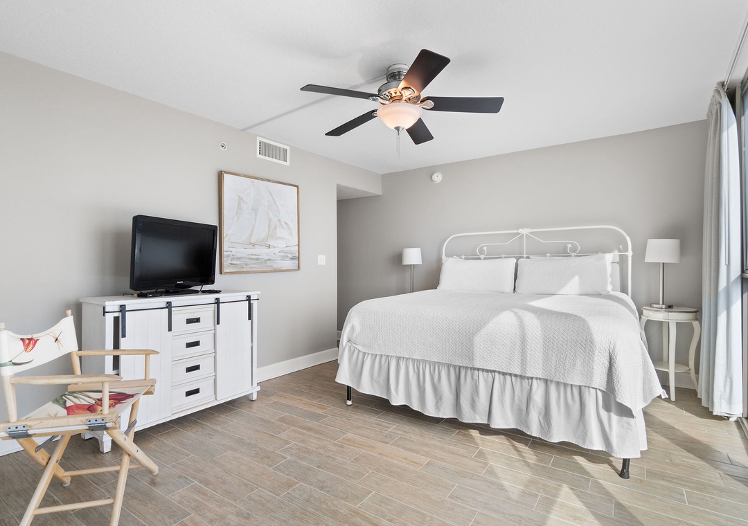 The room is just like the pictures if not better. The floor to ceiling windows are wonderful! We liked the separation of the bedrooms and having a full size washer/dryer. The elevator was for that end of the building only and dropped us right by the door. The condo was very clean and maintained. The property manager is easy to work with and provides detailed info on the property, even an app with the information on your stay. It’s all done ahead so no check in, you can go right to your room. We saw complaints about security but we only saw them one time and were glad to have them. No tents or awnings on the beach in that area so no obstructed views. You can rent beach chairs, wish there were some in the condo to use to avoid that. Love the balconies on both sides of the building. So glad we rented in Perdido Key away from the crowds.- Reviewed On: 4/2/2018