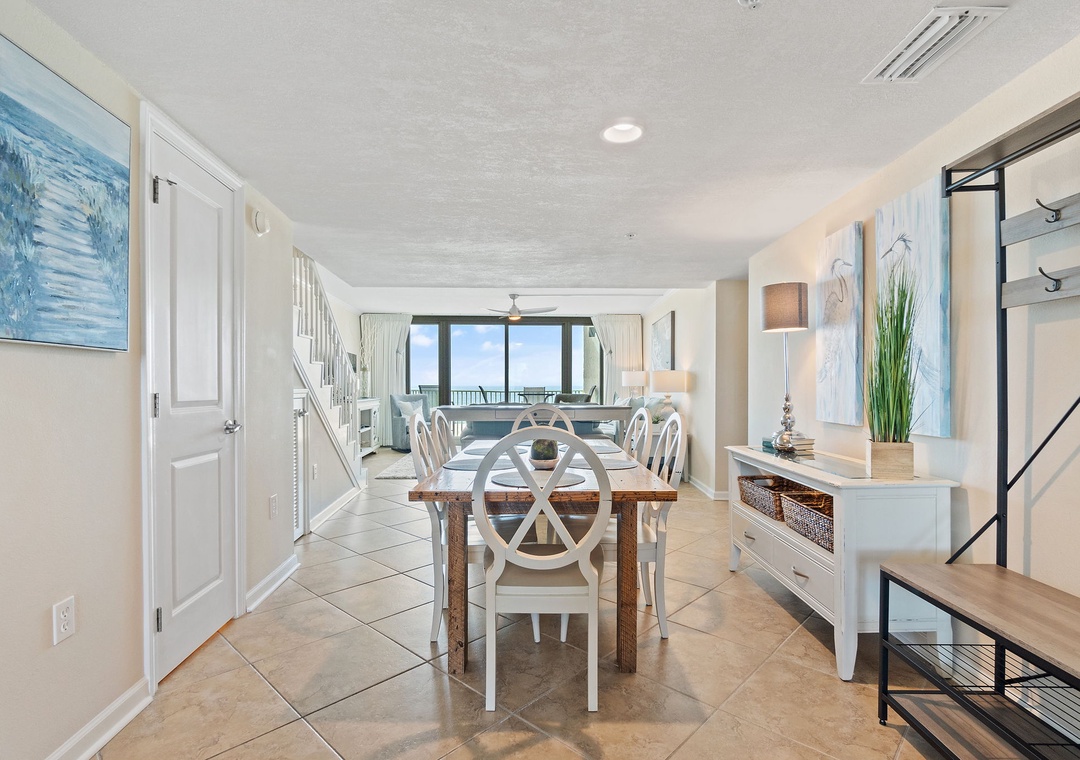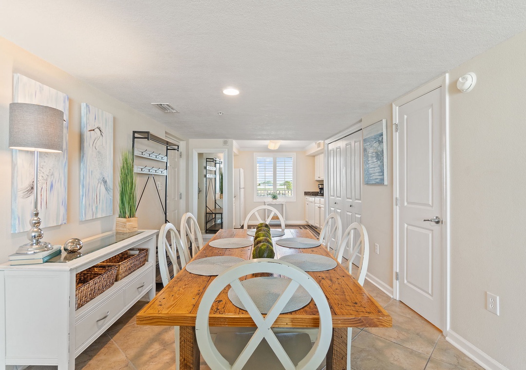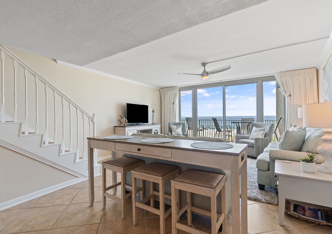 Perdido Towers West 307 is a beautifully updated 2-bedroom, 2.5-bathroom two-story condo offering unobstructed Gulf views from both the floor-to-ceiling windows and private balcony. Located in a low-density, 33-unit complex, this luxury beachfront retreat provides a serene, crowd-free escape with upscale amenities like a Gulf-front pool and fitness center. Inside, the condo features a modern coastal design with crisp whites, ocean blues, and warm wood accents. The gourmet kitchen is equipped with granite countertops, custom cabinetry, full-size stainless steel appliances, and everything needed to prepare meals with ease. Enjoy casual breakfasts at the bar and dinners with a view at the six-seat wooden dining table.