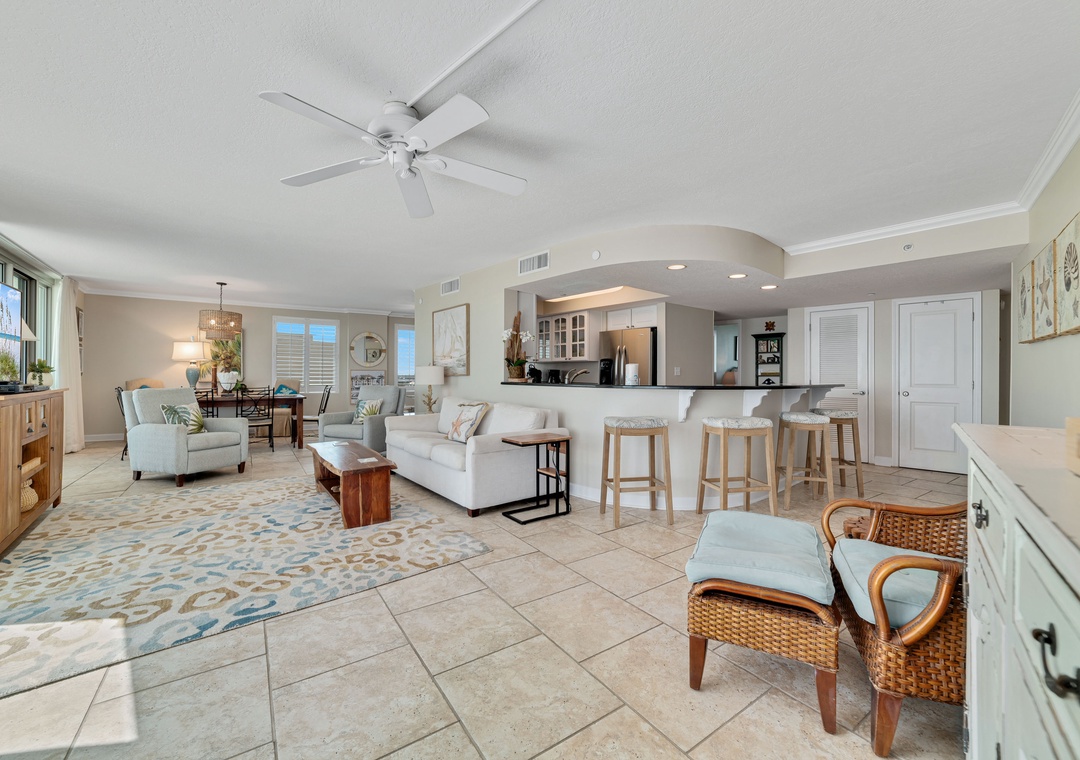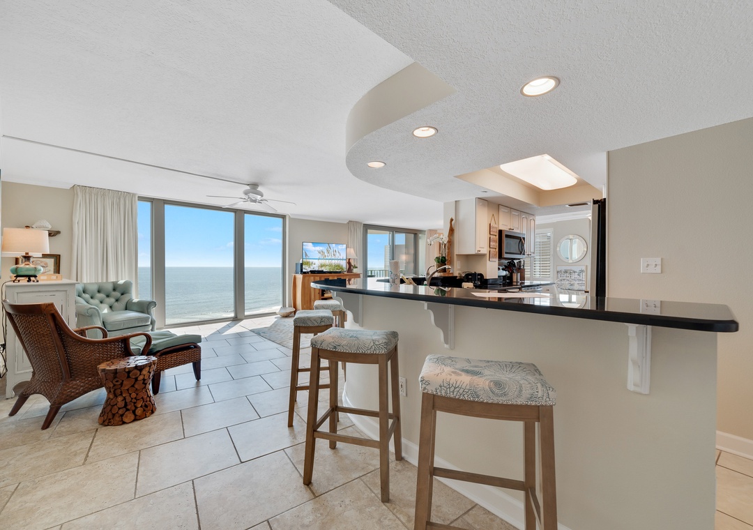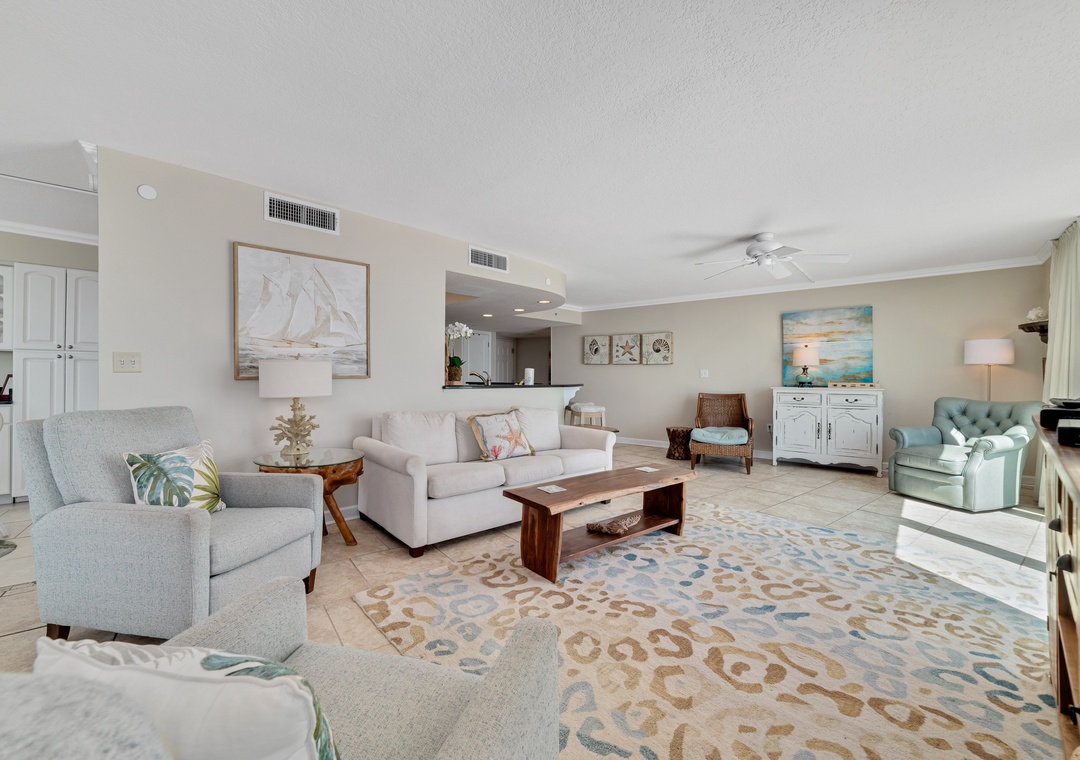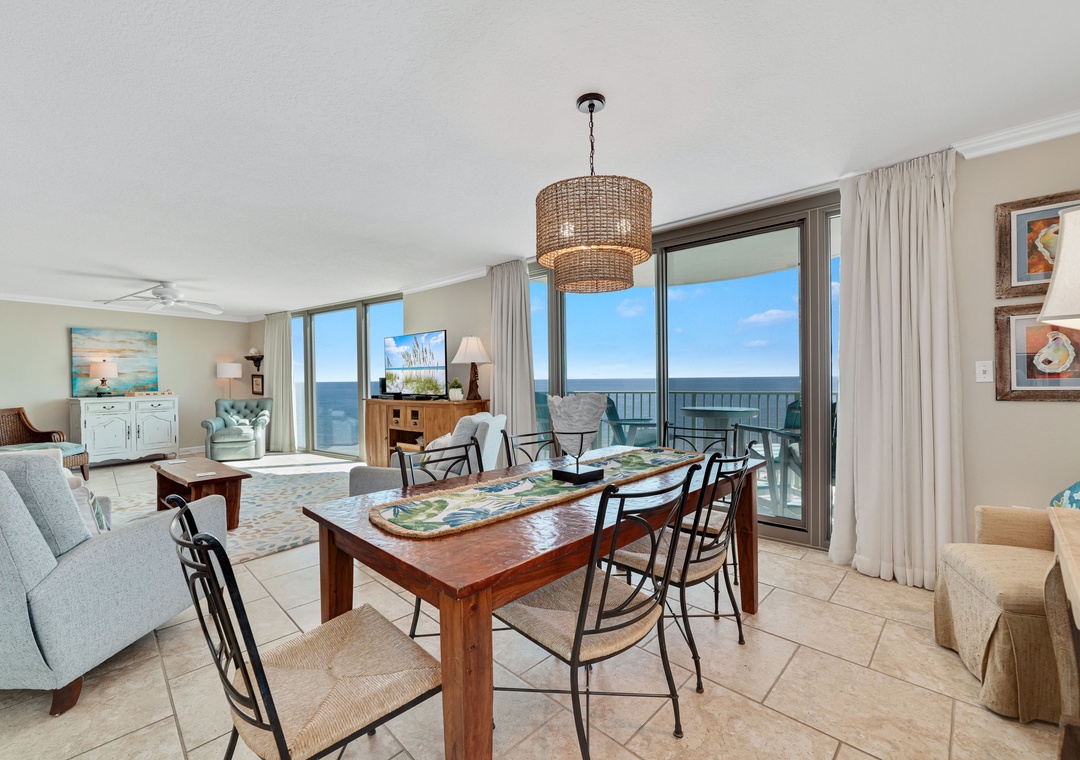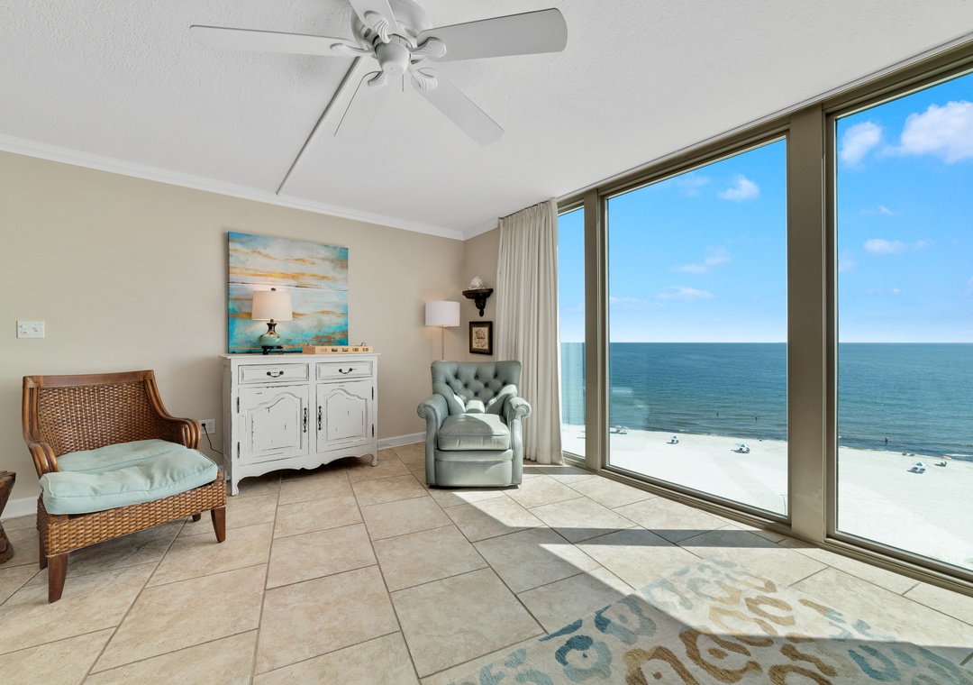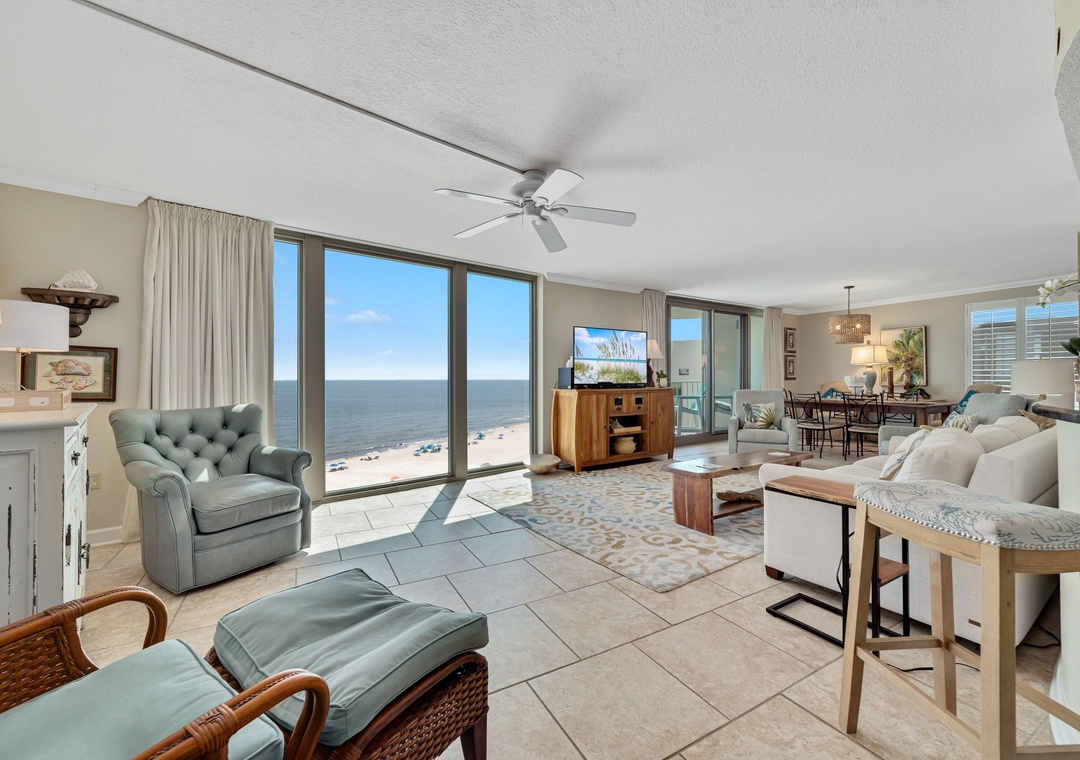 Escape to your ideal beach getaway in this beautiful 3-bedroom, 3-bathroom condo on the 9th floor, offering sweeping views of the Gulf of Mexico’s sparkling emerald waters and sugar-white sands. Whether you’re relaxing in the living room or enjoying the peaceful master bedroom, floor-to-ceiling windows and sliding glass doors allow you to take in the stunning scenery. Step out onto the expansive beachfront balcony to sip your morning coffee or unwind with a glass of wine while watching the waves. You might even catch a thrilling Blue Angels flyover for a memorable treat!