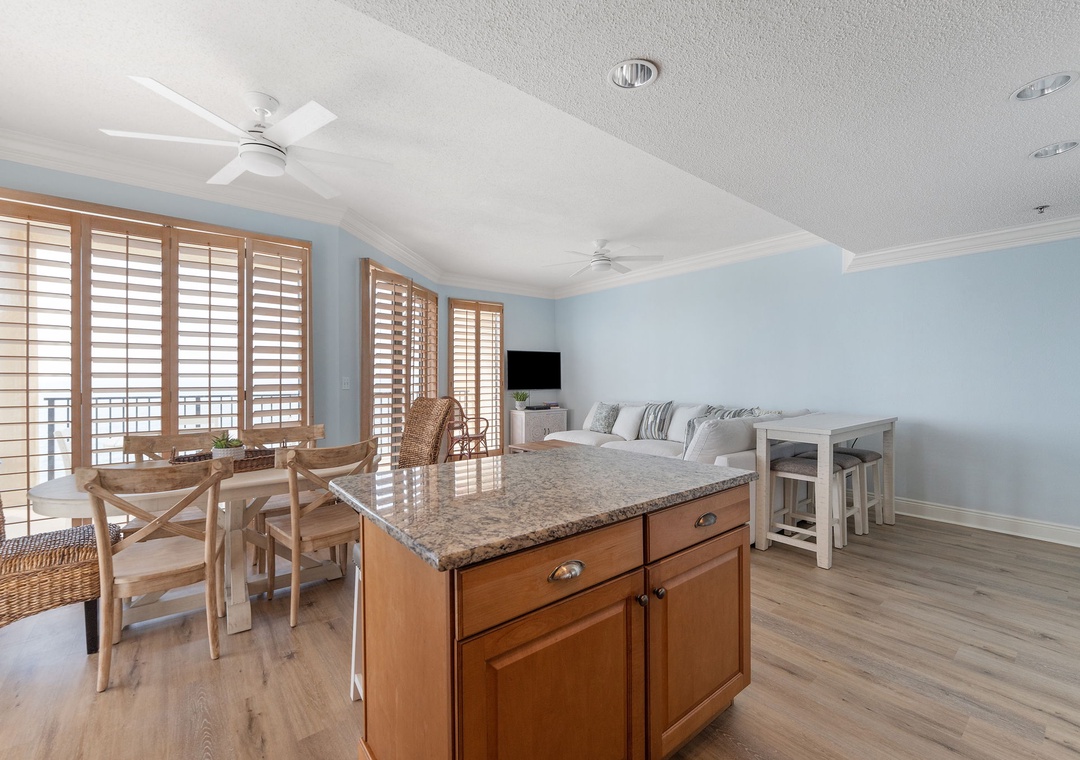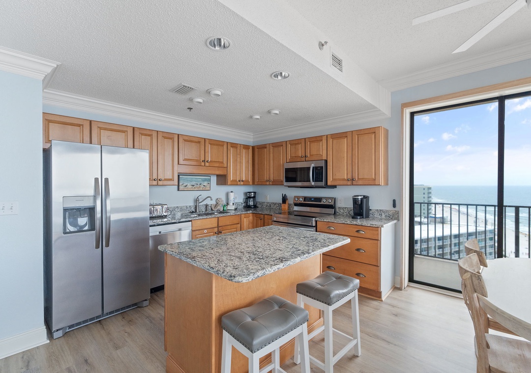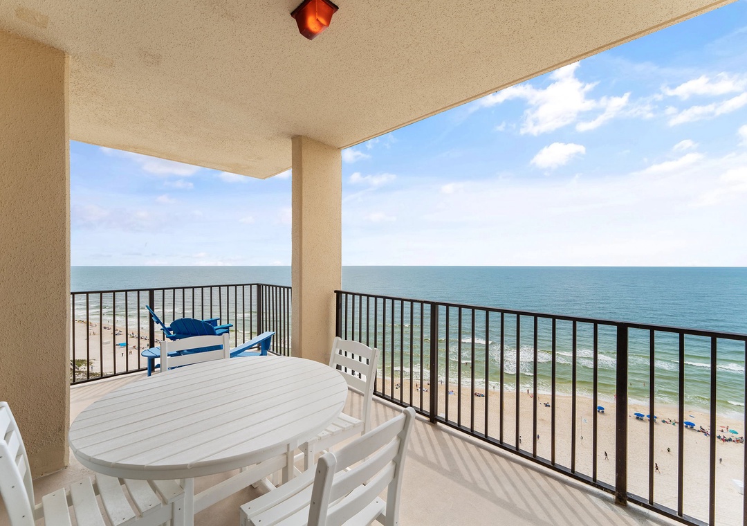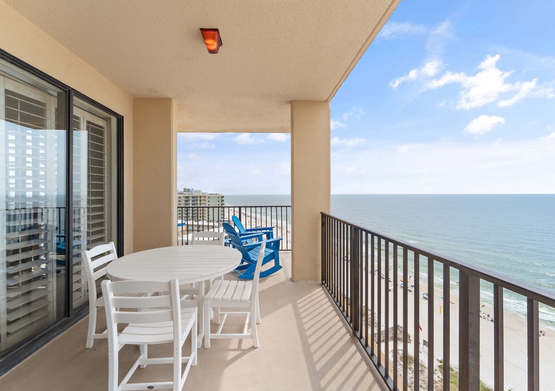 Unbridled Seas is an updated corner beachfront penthouse that boasts a spectacular ocean view from the 15th floor! The main living space offers a large and cozy living area with updated furniture and plenty of comfortable seating for the whole family. A work bar in the living area provides the perfect place for computers or puzzles while enjoying the scenery. The kitchen is fully stocked with all of the pots, pans, and kitchenware needed to make yourself at home during your Orange Beach vacation. Floor to ceiling windows wrap around the indoor dining table for dinner with a view. The balcony features a dining table and two rocking chairs perfect for relaxing and enjoying the beach below.