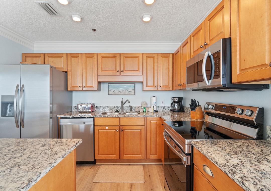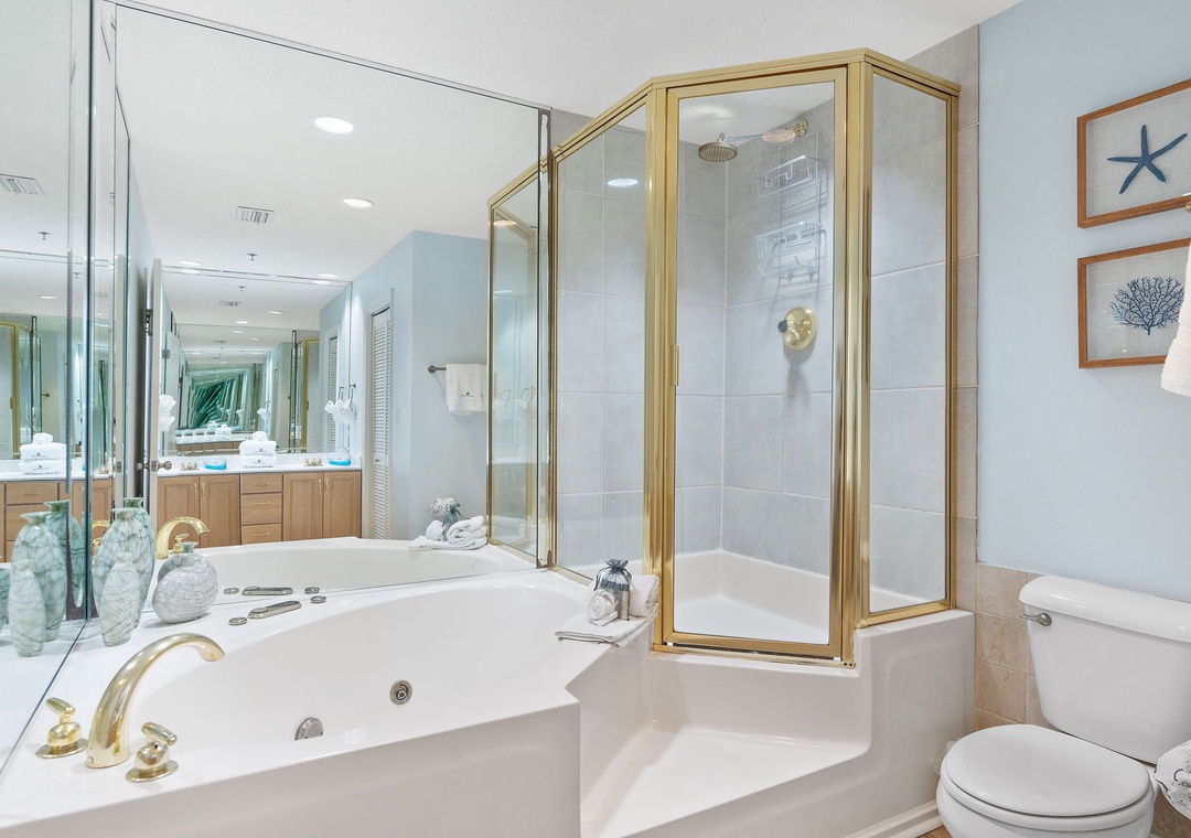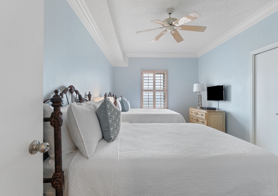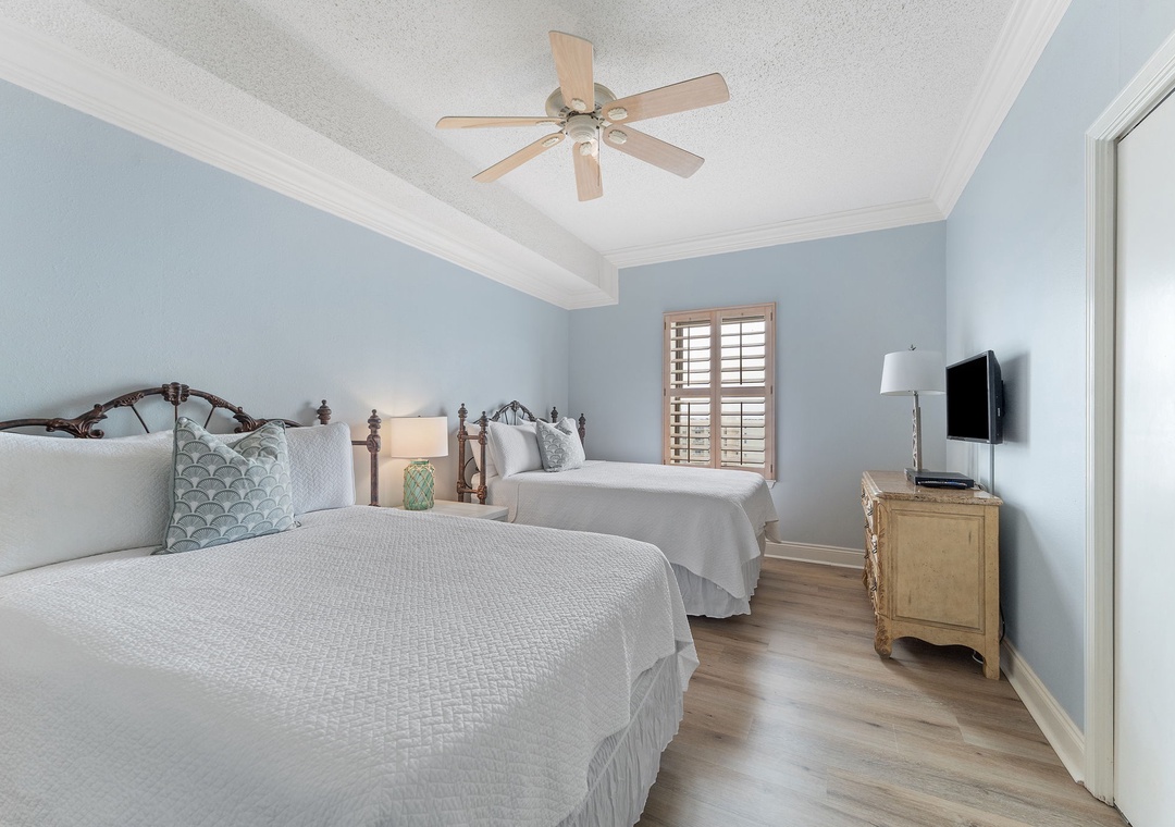 The primary bedroom offers a spacious king-size bed, a mounted HDTV, and access to a private balcony. The luxurious primary bathroom features a tile shower and jetted tub. A serene second bedroom includes a cozy queen bed, a mounted HDTV, and an ocean view. A spacious third bedroom overlooking the beach has two full beds and an HDTV. A hall bathroom features roomy countertops and a walk-in shower perfect for accommodating all guests. All bedrooms contain closets for luggage and other items.