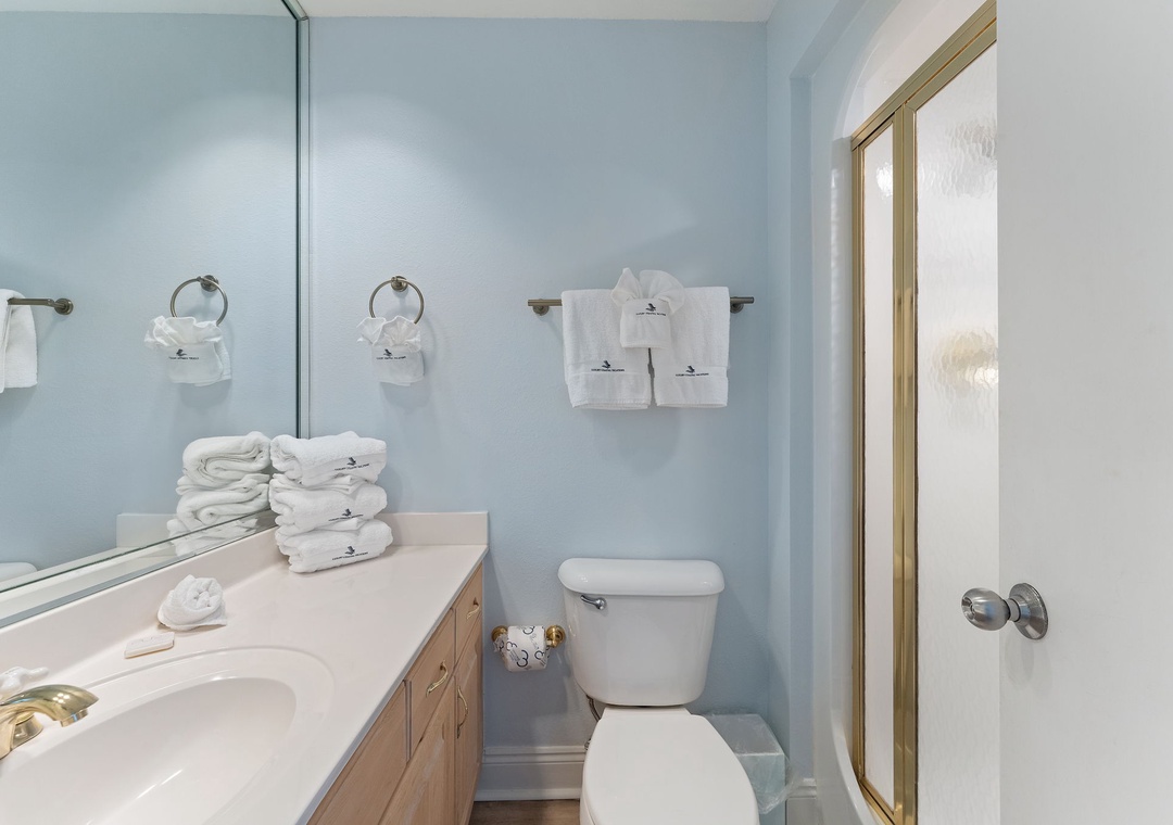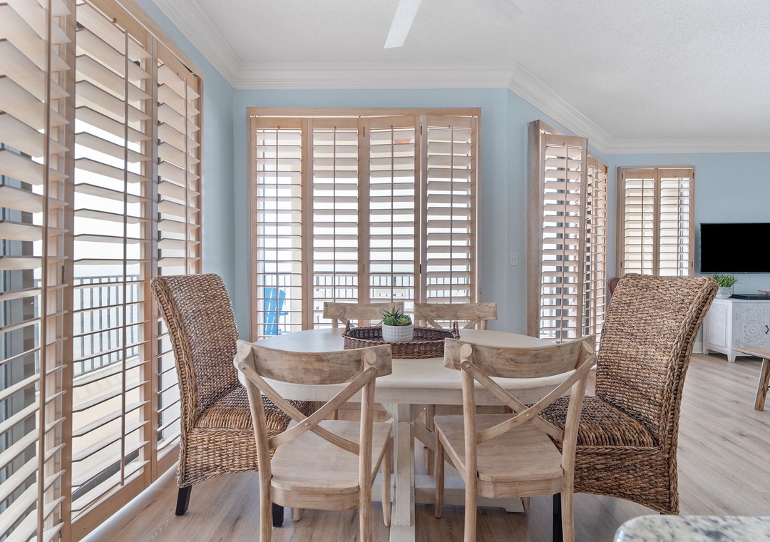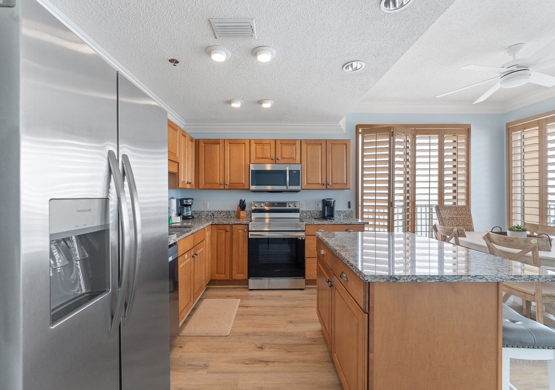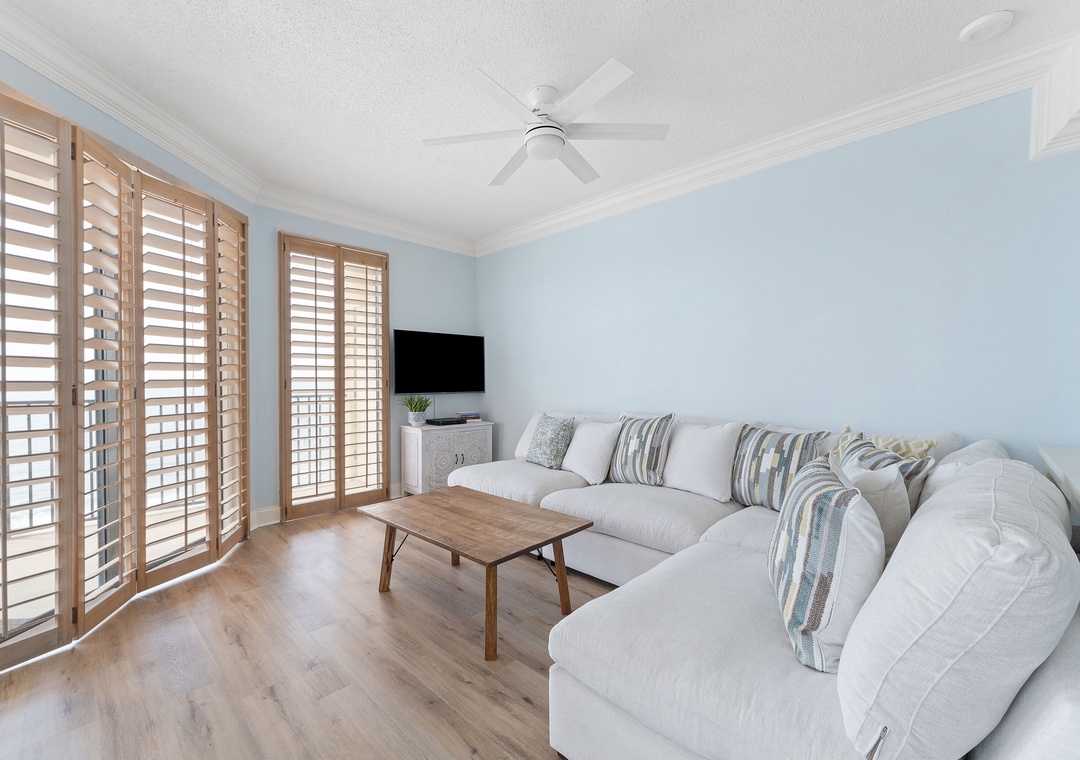 The primary bedroom offers a spacious king-size bed, a mounted HDTV, and access to a private balcony. The luxurious primary bathroom features a tile shower and jetted tub. A serene second bedroom includes a cozy queen bed, a mounted HDTV, and an ocean view. A spacious third bedroom overlooking the beach has two full beds and an HDTV. A hall bathroom features roomy countertops and a walk-in shower perfect for accommodating all guests. All bedrooms contain closets for luggage and other items.