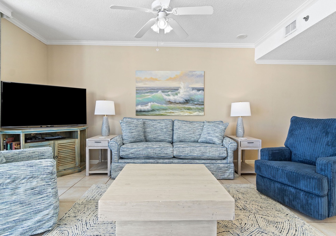 Inside, the spacious condo features stylish décor and comfortable furnishings throughout. The living room invites relaxation with ample seating and direct access to a large covered balcony overlooking the beach—ideal for savoring your morning coffee as the sun rises over the Gulf. The fully equipped kitchen boasts upgraded appliances for preparing meals with ease. After a day of fun, retreat to one of the three well-appointed bedrooms, each offering premium mattresses and luxurious linens for ultimate relaxation. The master suite's spa-like bathroom includes a walk-in glass and tile shower and plush oversized towels, ensuring you feel pampered. Plus, you’re just minutes away from Orange Beach’s best dining, shopping, and nightlife!