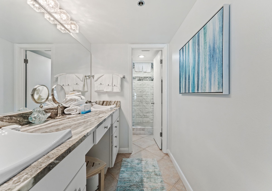 Step inside to a tastefully appointed interior marked by smooth ceilings, crown molding, and tile flooring throughout, creating a fresh yet timeless atmosphere. The kitchen features granite countertops and stainless steel appliances, and the master suite is a private haven with a walk-in tiled shower and direct balcony access through large sliding glass doors. In the living room, another set of sliding glass doors frame picturesque beach views, enhancing the open, airy feel of the space.